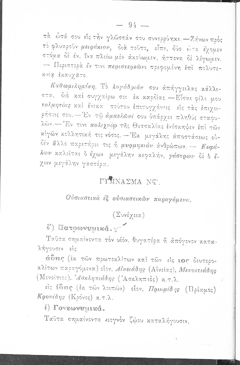 Σχολικό εγχειρίδιο Αρχαίων Ελληνικών Γυμνασίου που περιέχει τους κανόνες γραμματικής και είναι χωρισμένο σε φθογγολογικό, τυπολογικό και ετυμολογικό μέρος. Περιέχει και κατάλογο ανωμάλων ρημάτων.