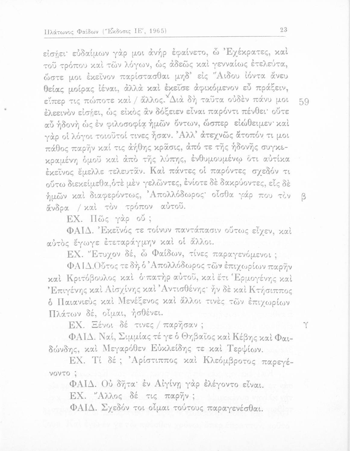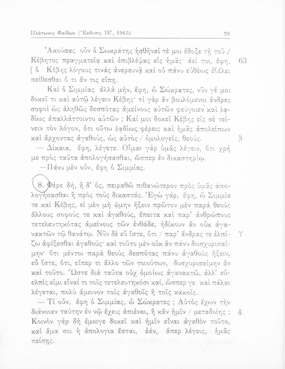 Σχολικό εγχειρίδιο για τις Τάξεις του Γυμνασίου για το μάθημα των Αρχαίων Ελληνικών. Περιλαμβάνει αποσπάσματα του αρχαίου κειμένου από τους διαλόγους του Πλάτωνα. Περιέχει μετάφραση ερμηνευτικά, πραγματολογικά