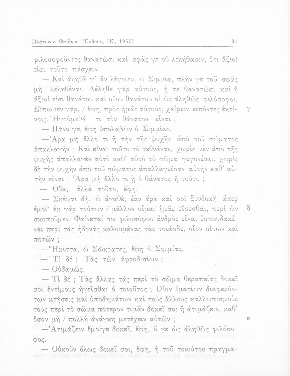 Σχολικό εγχειρίδιο Αρχαίων Ελληνικών Γυμνασίου που περιλαμβάνει αποσπάσματα από τους διαλόγους του Πλάτωνα, ερμηνευτικά και πραγματολογικά σχόλια και λεξιλογικές παρατηρήσεις.