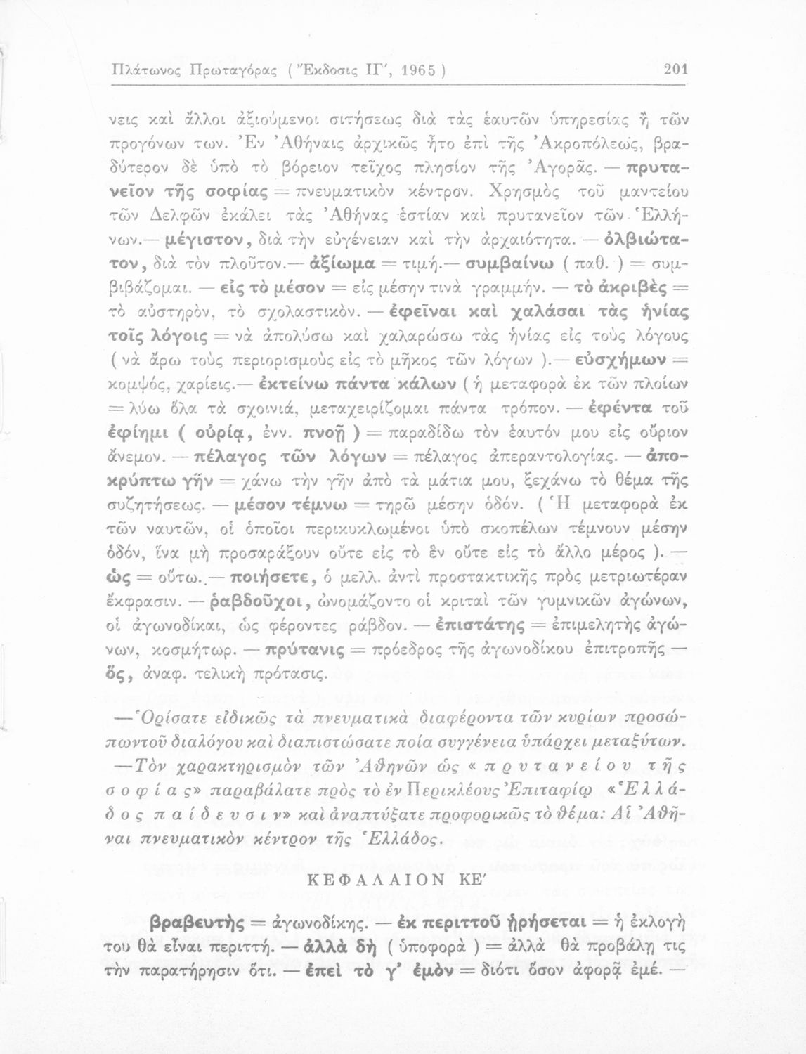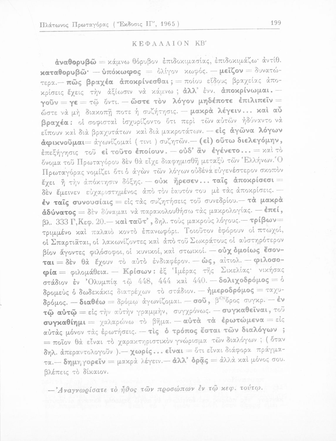 Σχολικό εγχειρίδιο Αρχαίων Ελληνικών για τους μαθητές της ΣΤ΄ τάξης των Γυμνασίων. Το βιβλίο περιέχει το έργο του Πλάτωνα 'Πρωταγόρας' συνοδευόμενο από ερμηνευτικά και γλωσσικά σχόλια. Φέρει το σύμβολο της ...