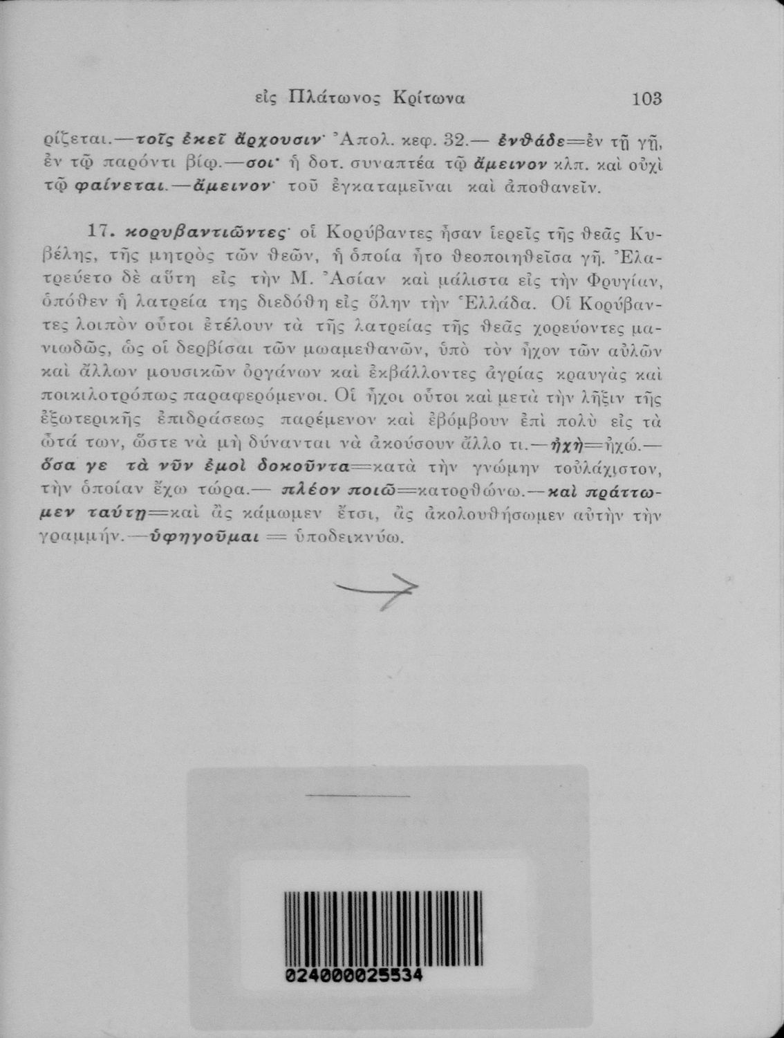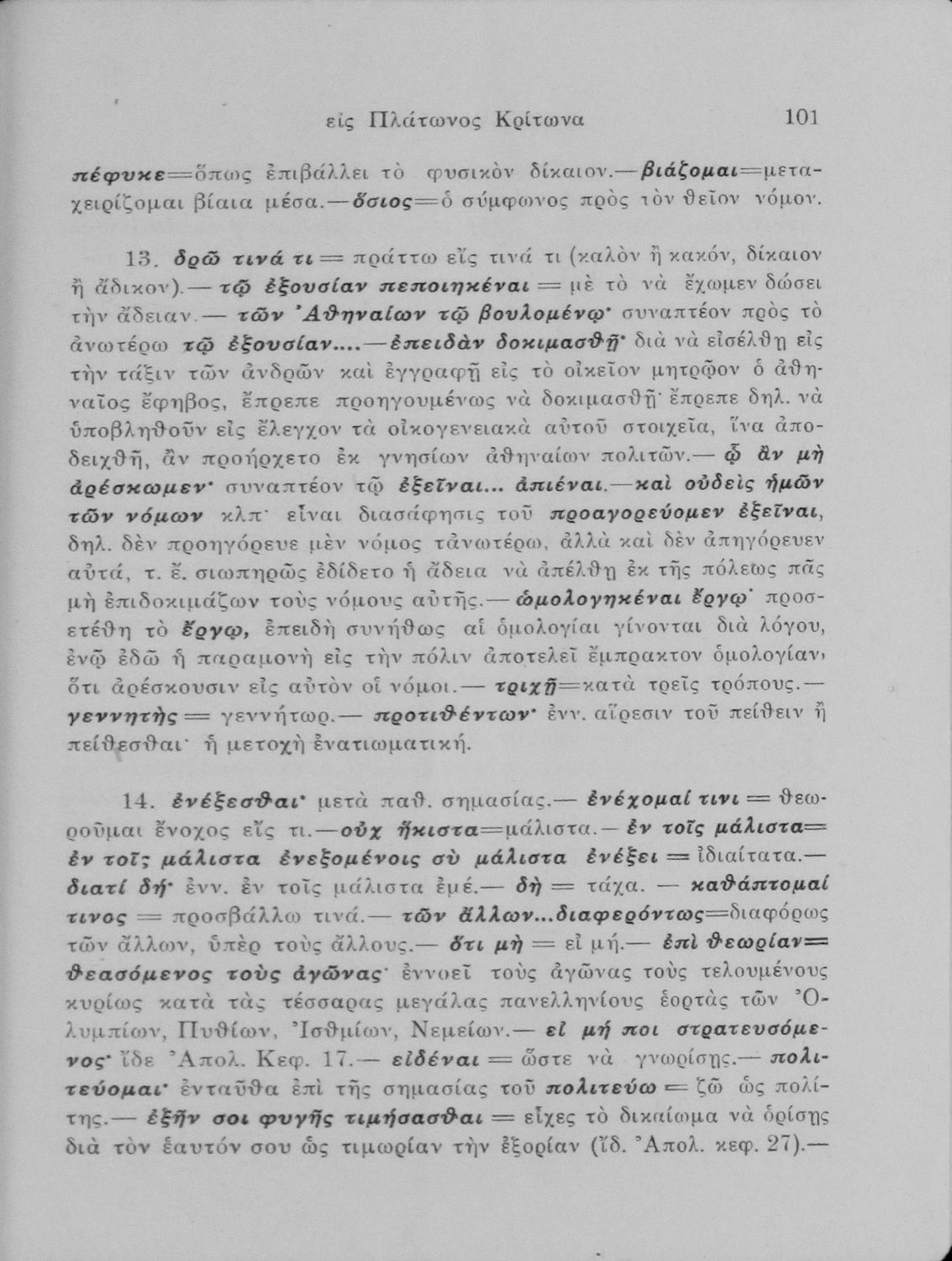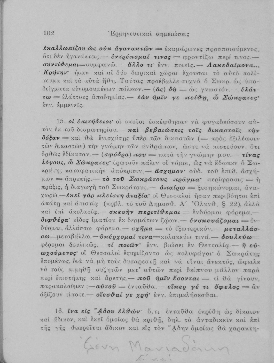 Σχολικό εγχειρίδιο Αρχαίων Ελληνικών για τις Ε΄ Εξαταξίου Γυμνασίου παλαιού τύπου και ΣΤ΄ Εξαταξίου Γυμνασίου νέου τύπου που περιλαμβάνει εισαγωγικά στοιχεία για τη ζωή και το έργο του Πλάτωνα και μικρό εισαγωγικό κείμενο που αφορά τους Διαλόγους Απολογία Σωκράτους και Κρίτων, το κείμενο και ερμηνευτικές σημειώσεις.