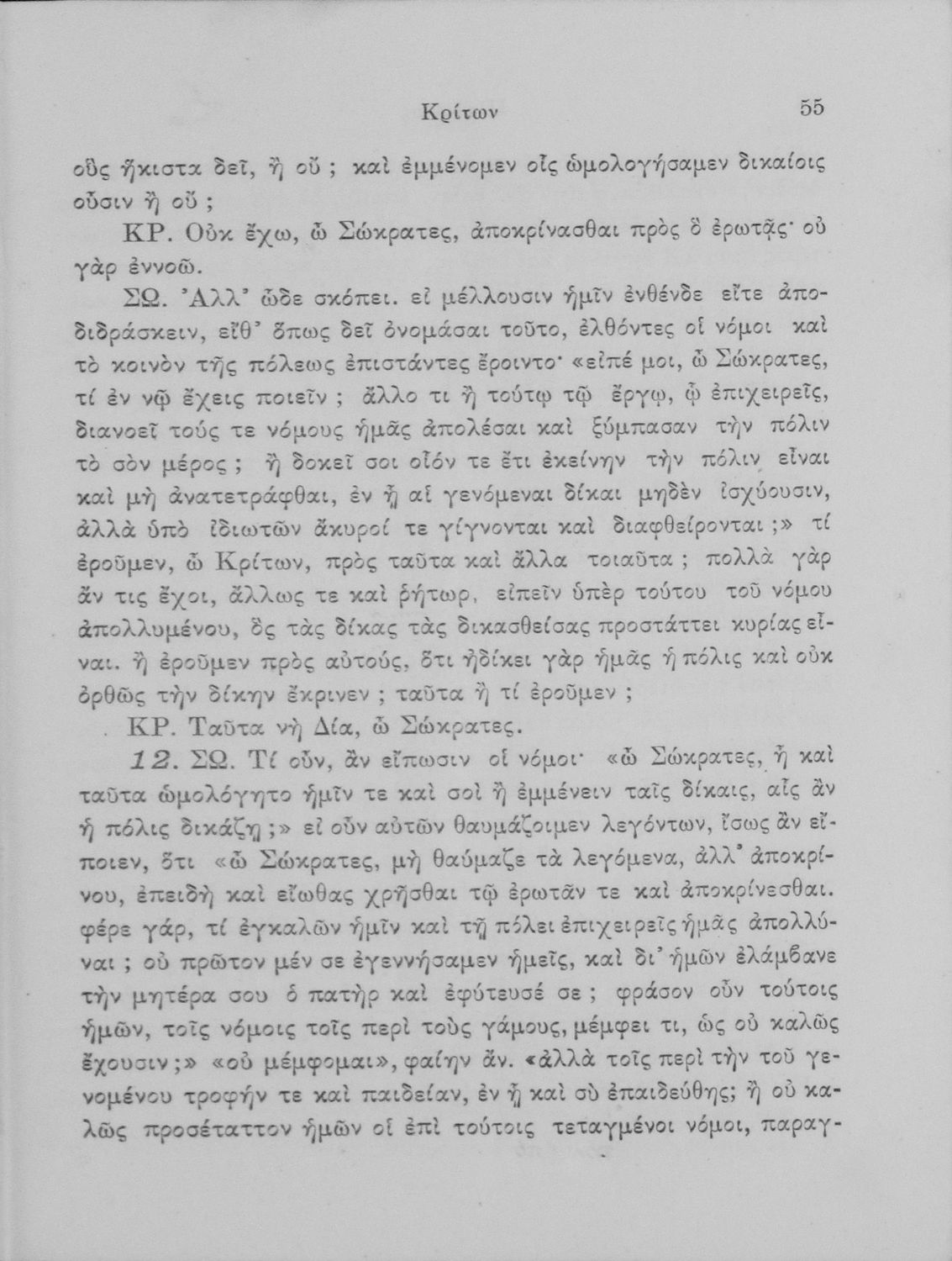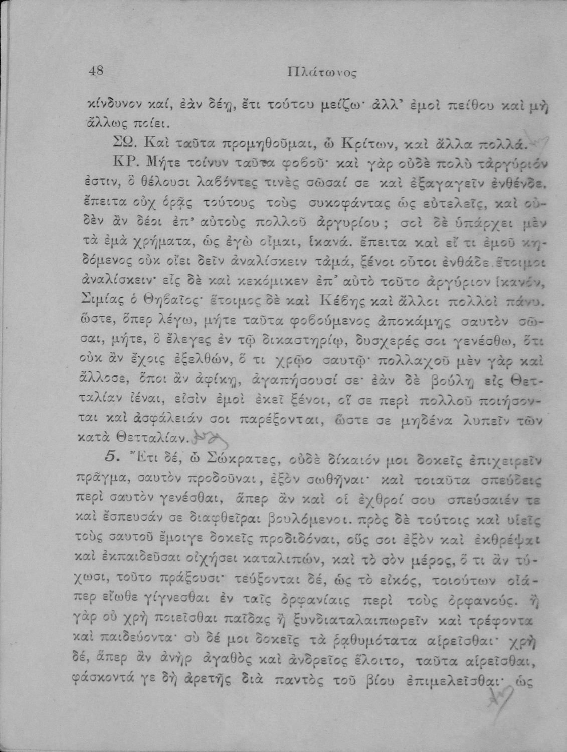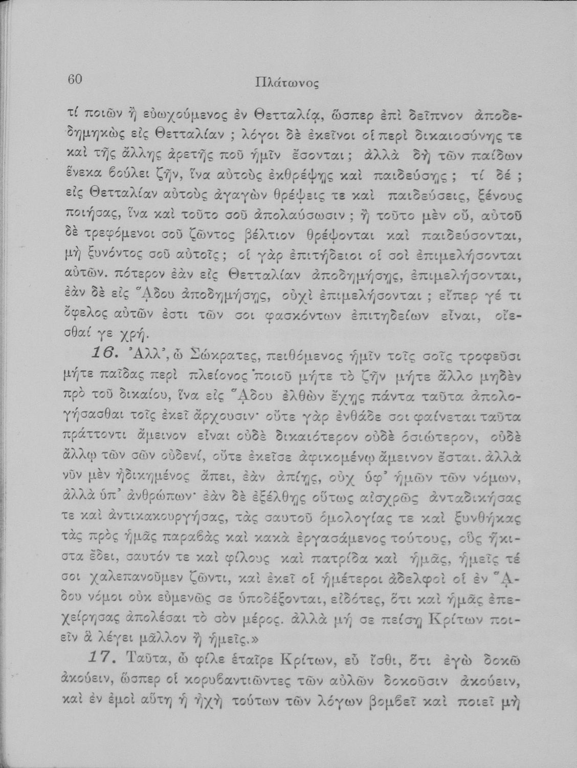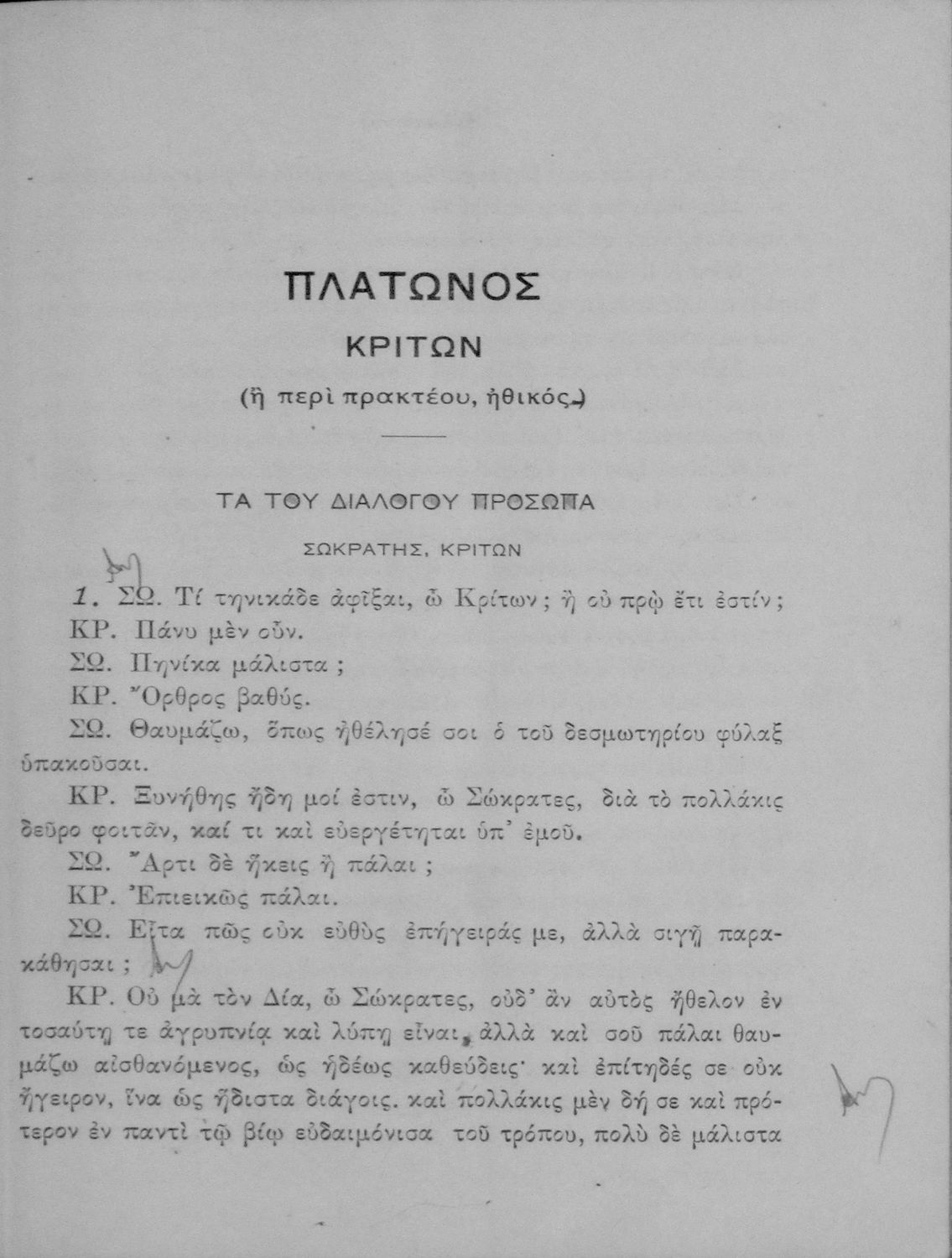 Σχολικό εγχειρίδιο Αρχαίων Ελληνικών για τις Ε΄ Εξαταξίου Γυμνασίου παλαιού τύπου και ΣΤ΄ Εξαταξίου Γυμνασίου νέου τύπου που περιλαμβάνει εισαγωγικά στοιχεία για τη ζωή και το έργο του Πλάτωνα και μικρό εισαγωγικό κείμενο που αφορά τους Διαλόγους Απολογία Σωκράτους και Κρίτων, το κείμενο και ερμηνευτικές σημειώσεις.