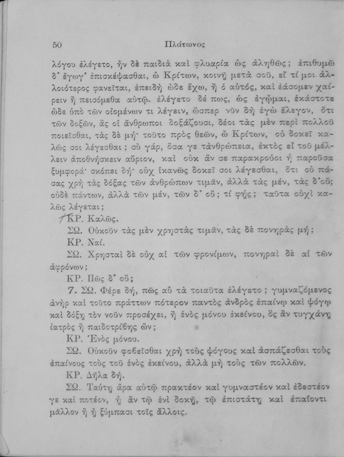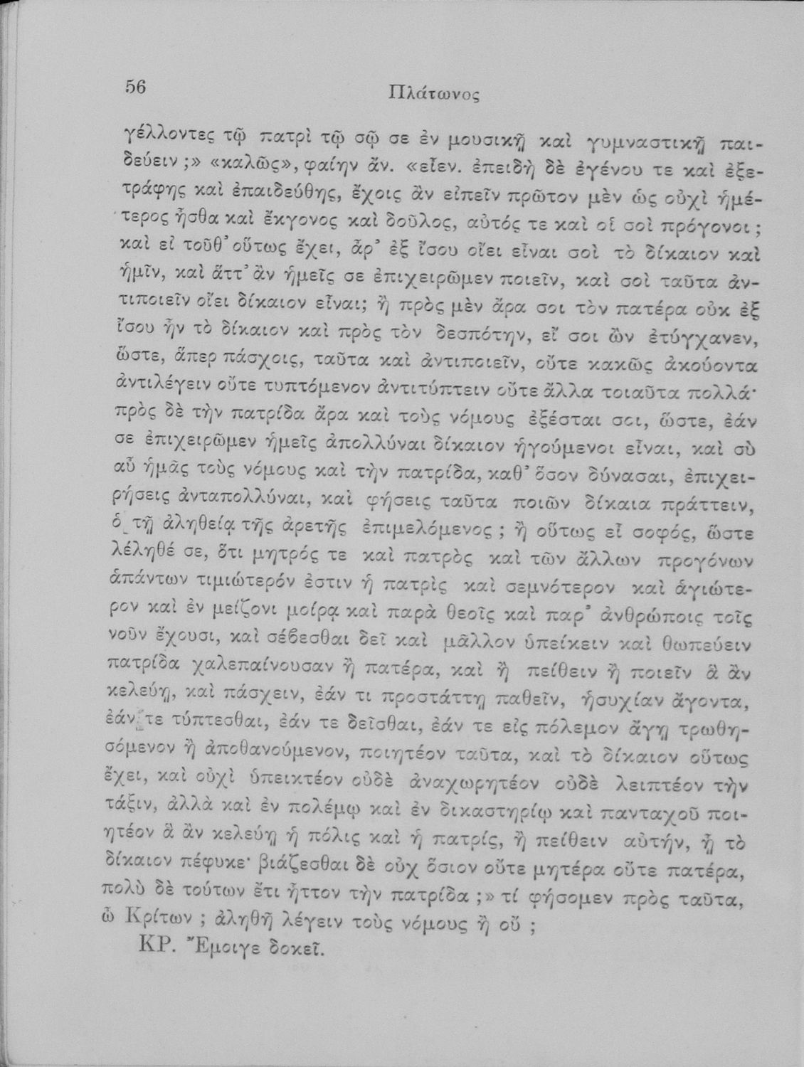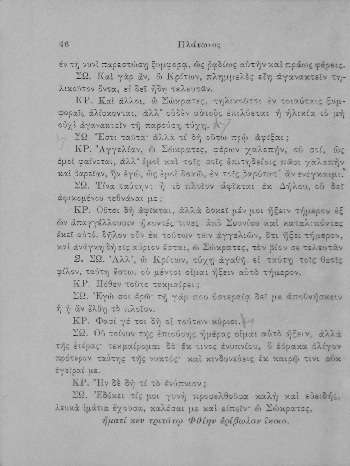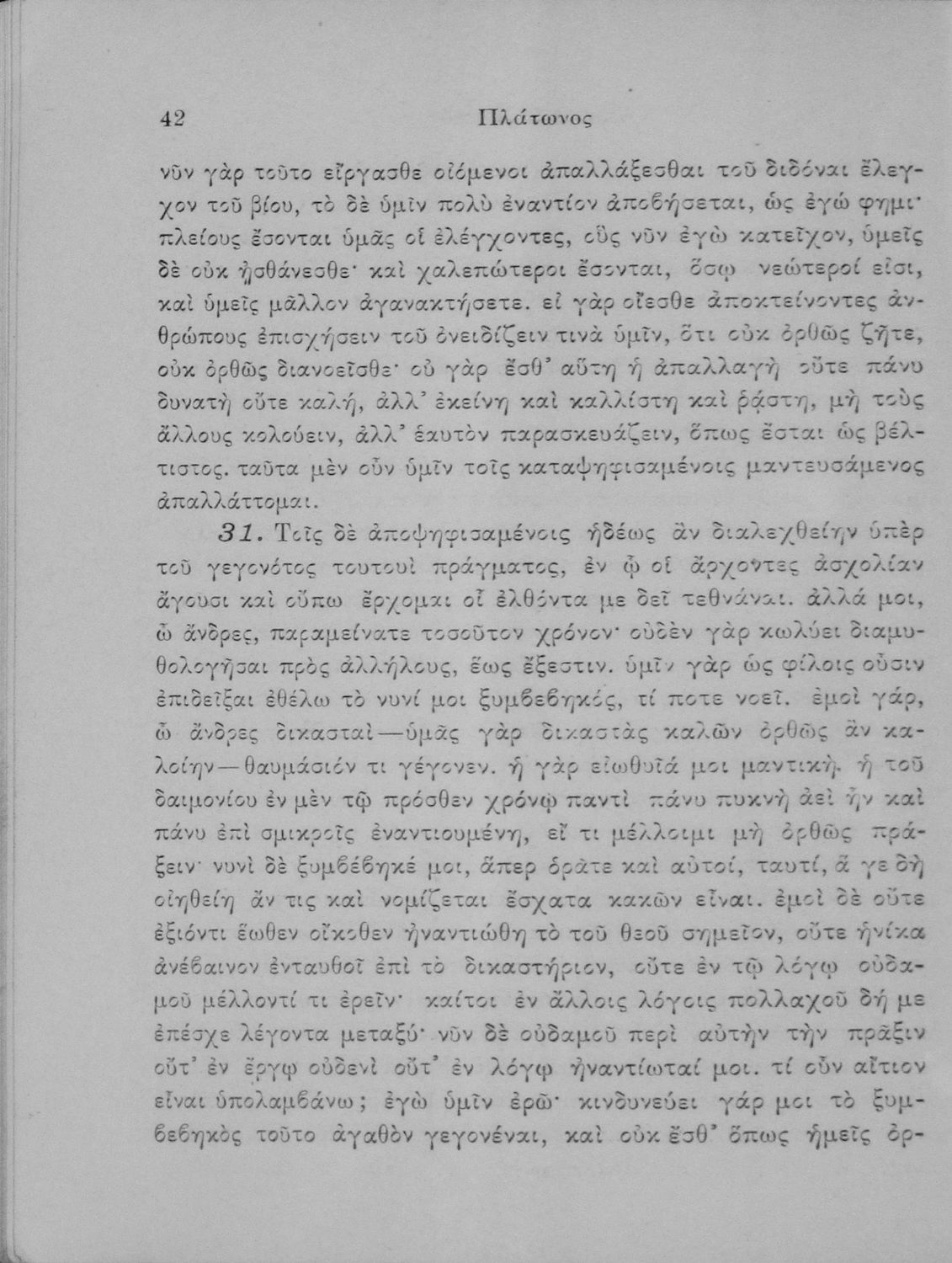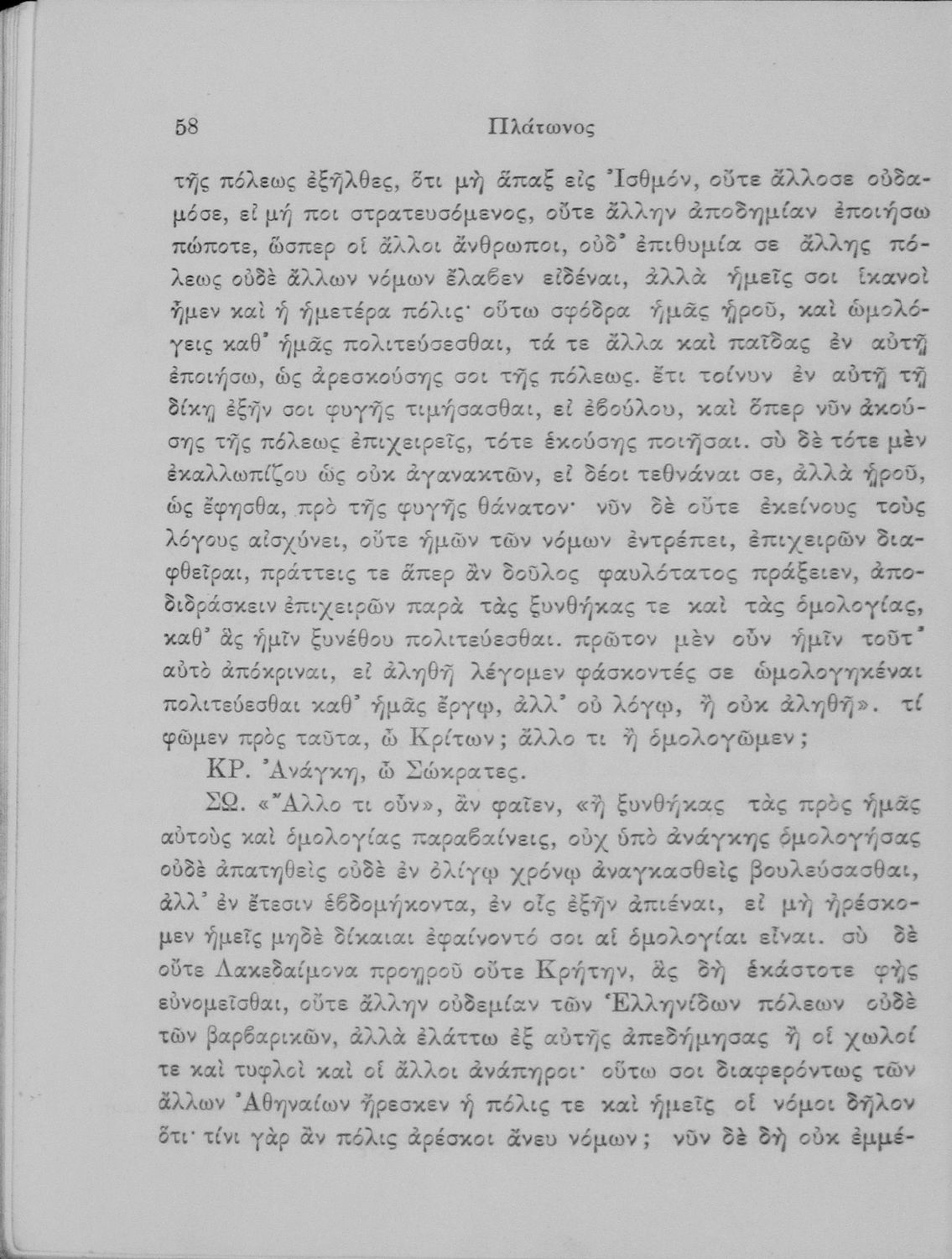 Σχολικό εγχειρίδιο Αρχαίων Ελληνικών για τις Ε΄ Εξαταξίου Γυμνασίου παλαιού τύπου και ΣΤ΄ Εξαταξίου Γυμνασίου νέου τύπου που περιλαμβάνει εισαγωγικά στοιχεία για τη ζωή και το έργο του Πλάτωνα και μικρό εισαγωγικό κείμενο που αφορά τους Διαλόγους Απολογία Σωκράτους και Κρίτων, το κείμενο και ερμηνευτικές σημειώσεις.