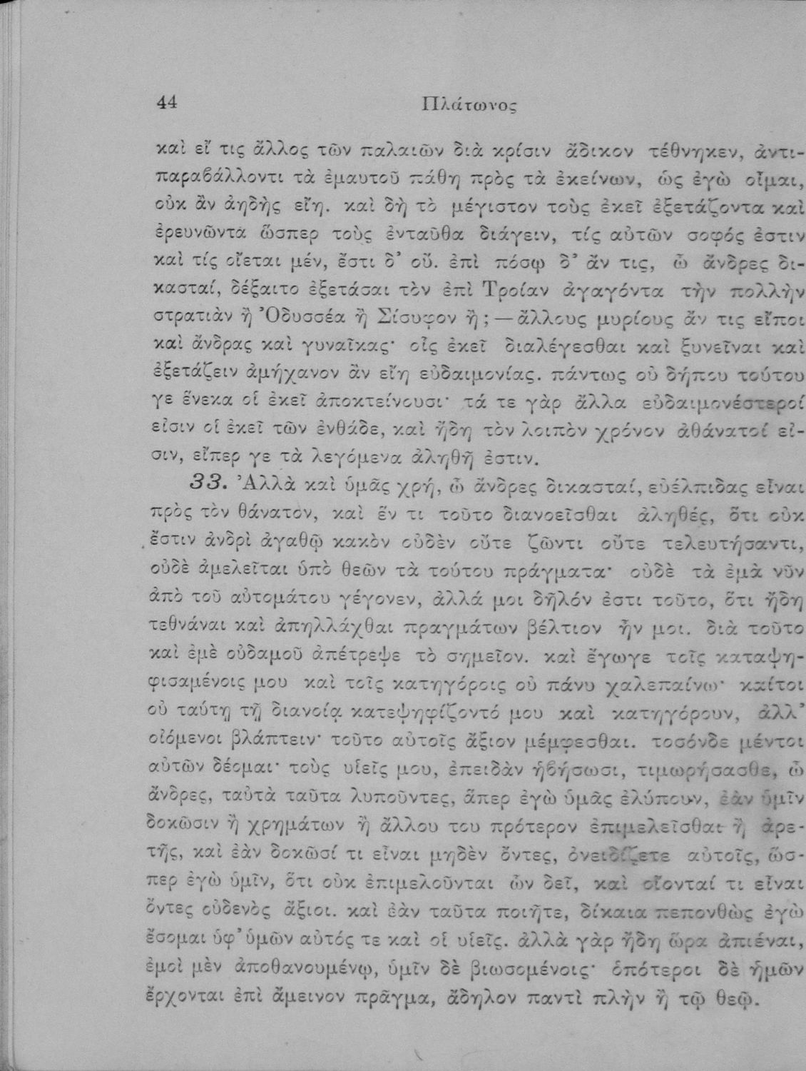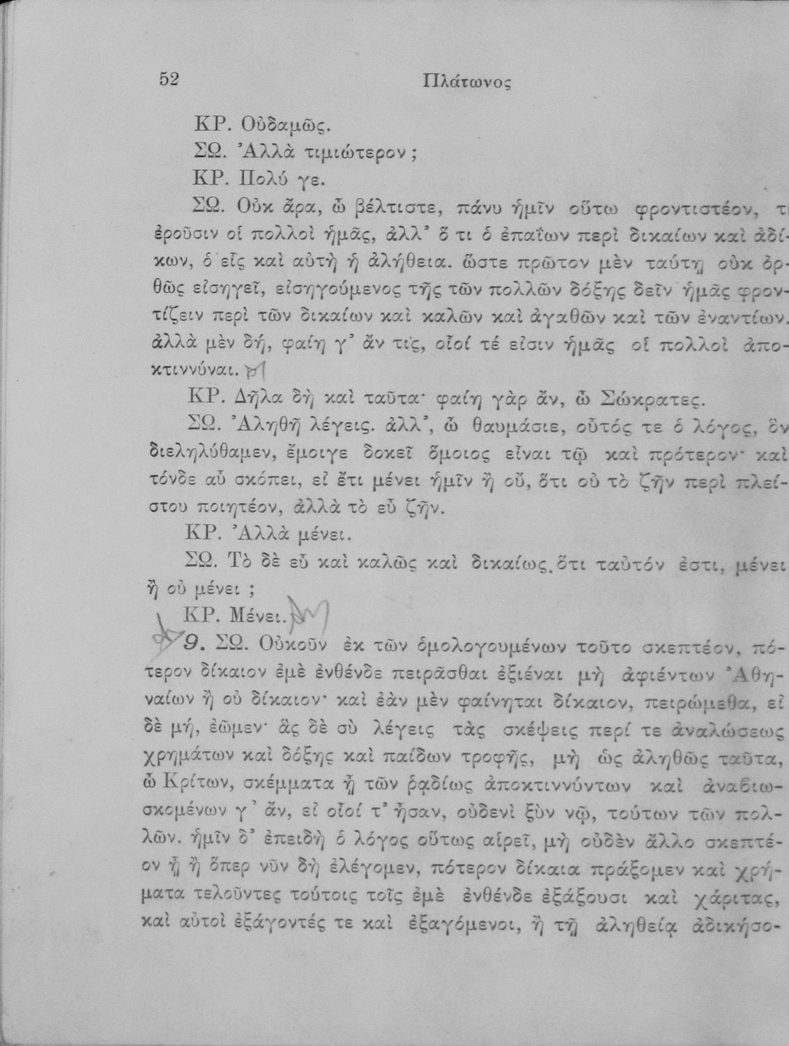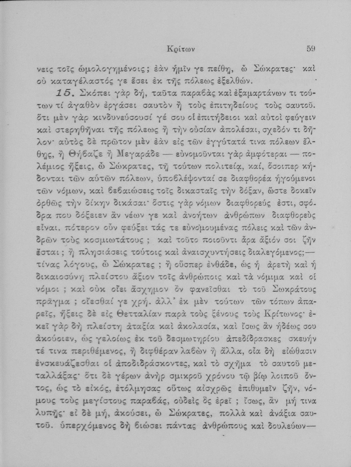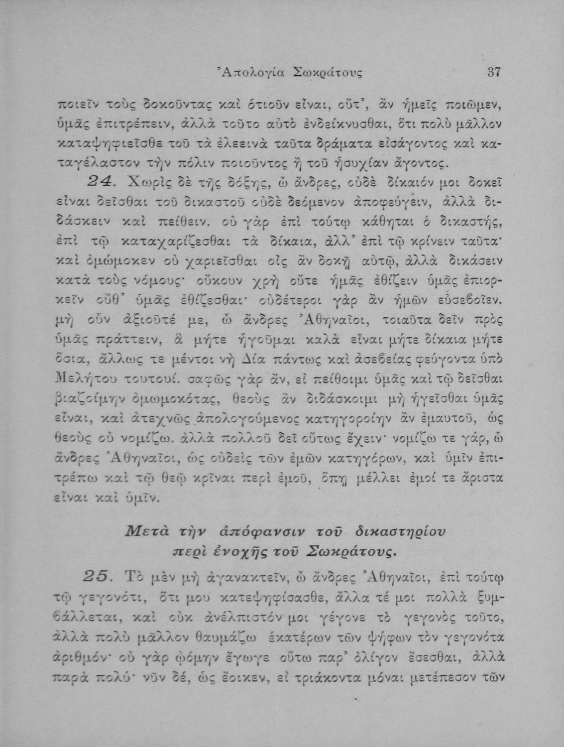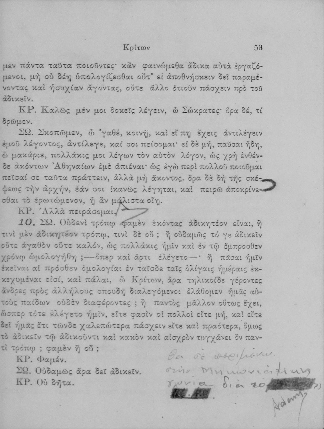 Σχολικό εγχειρίδιο Αρχαίων Ελληνικών για τις Ε΄ Εξαταξίου Γυμνασίου παλαιού τύπου και ΣΤ΄ Εξαταξίου Γυμνασίου νέου τύπου που περιλαμβάνει εισαγωγικά στοιχεία για τη ζωή και το έργο του Πλάτωνα και μικρό εισαγωγικό κείμενο που αφορά τους Διαλόγους Απολογία Σωκράτους και Κρίτων, το κείμενο και ερμηνευτικές σημειώσεις.
