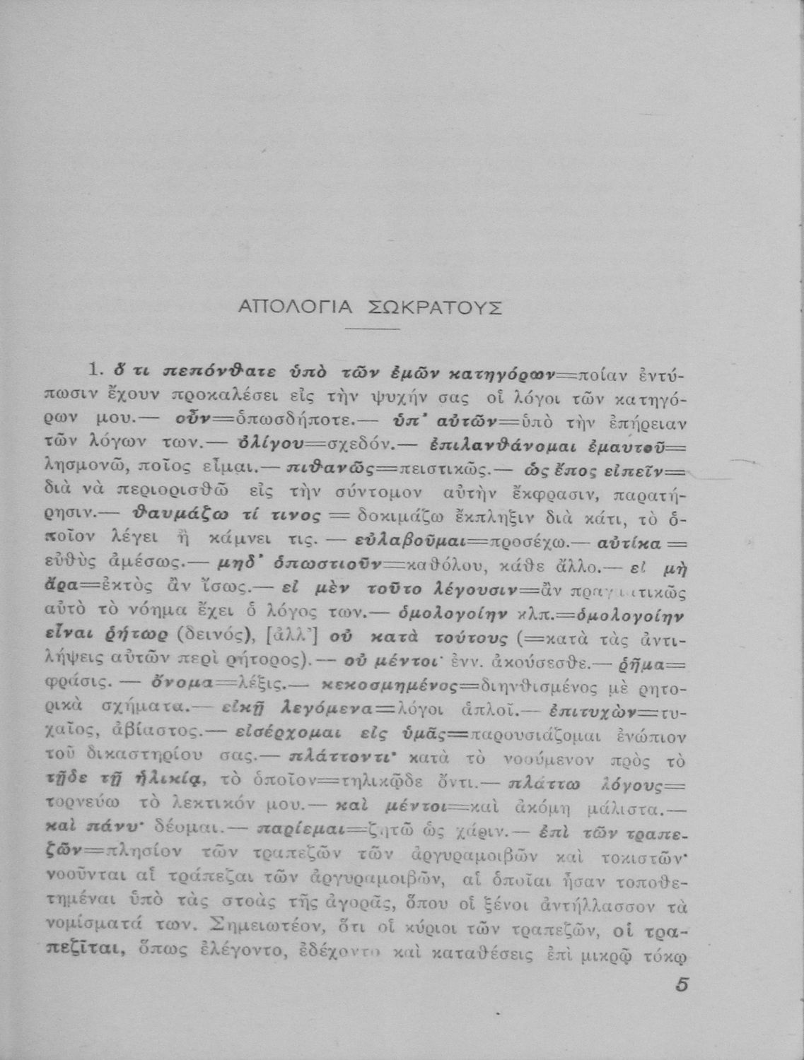 Σχολικό εγχειρίδιο Αρχαίων Ελληνικών της Ε΄ Γυμνασίου το οποίο περιλαμβάνει τα έργα του Πλάτωνα, Απολογία Σωκράτους και Κρίτων και ερμηνευτικές παρατηρήσεις.
