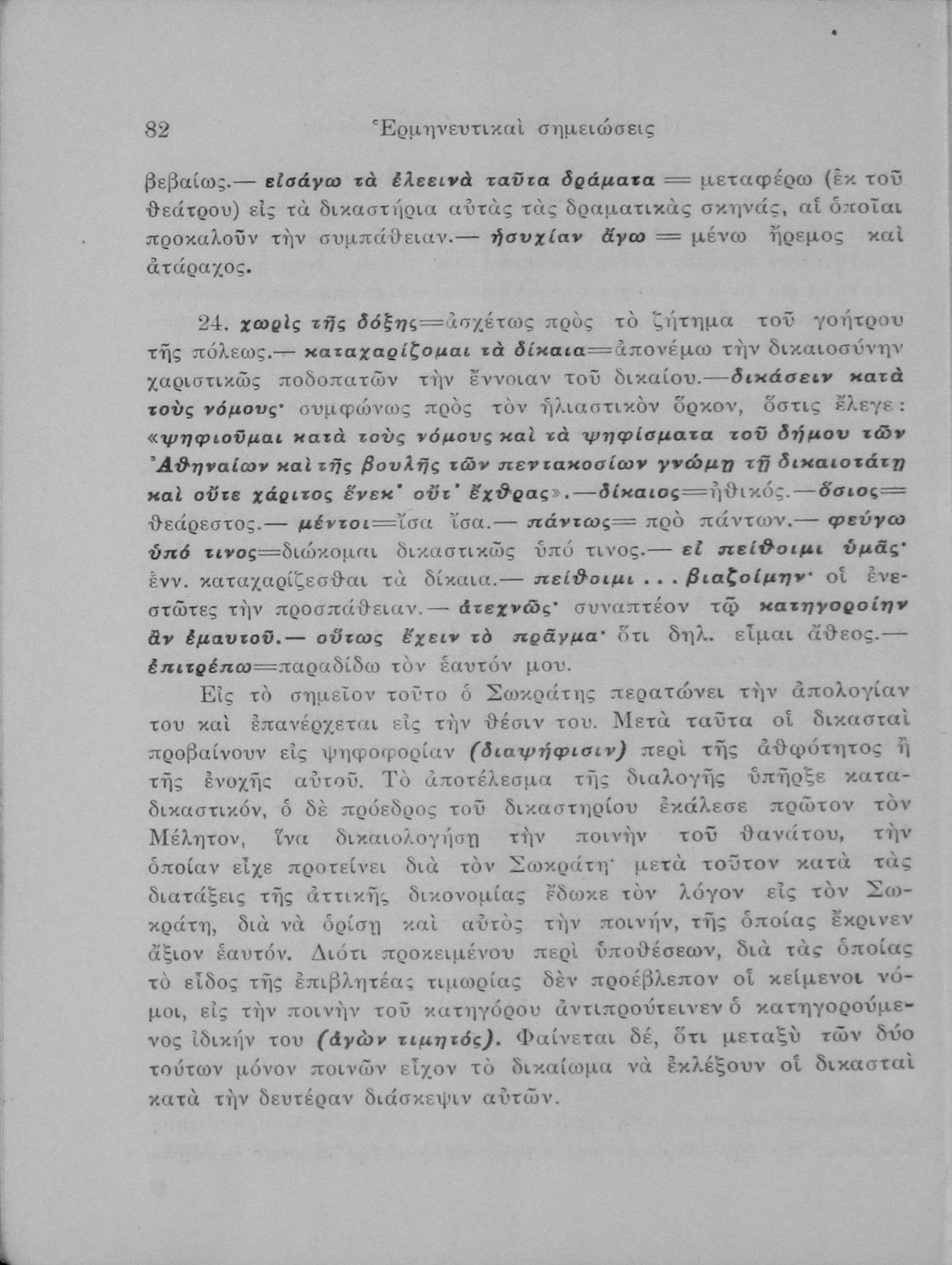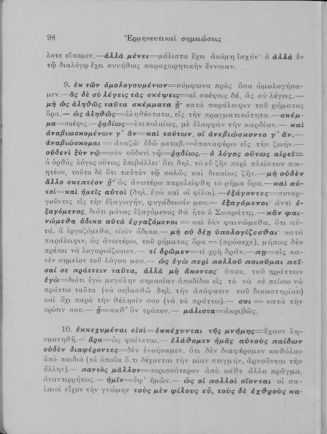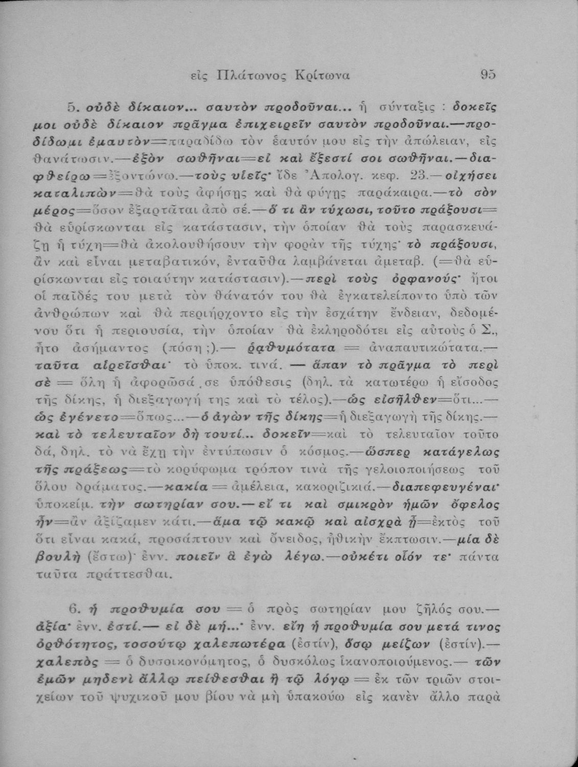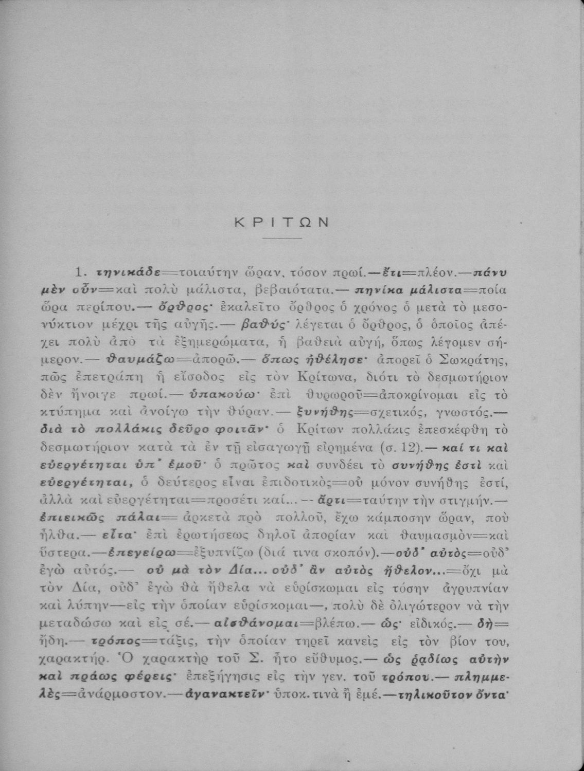 Σχολικό εγχειρίδιο Αρχαίων Ελληνικών για τις Ε΄ Εξαταξίου Γυμνασίου παλαιού τύπου και ΣΤ΄ Εξαταξίου Γυμνασίου νέου τύπου που περιλαμβάνει εισαγωγικά στοιχεία για τη ζωή και το έργο του Πλάτωνα και μικρό εισαγωγικό κείμενο που αφορά τους Διαλόγους Απολογία Σωκράτους και Κρίτων, το κείμενο και ερμηνευτικές σημειώσεις.