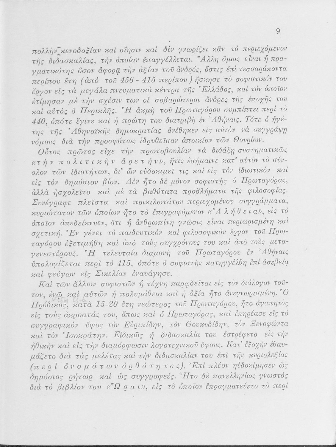 Σχολικό εγχειρίδιο Αρχαίων Ελληνικών για τη ΣΤ΄ τάξη των Εξαταξίων Γυμνασίων που περιλαμβάνει σύντομο βιογραφικό του Πλάτωνα, εισαγωγή στο έργο του, αποσπάσματα από τον Πρωταγόρα και ερμηνευτικές σημειώσεις.