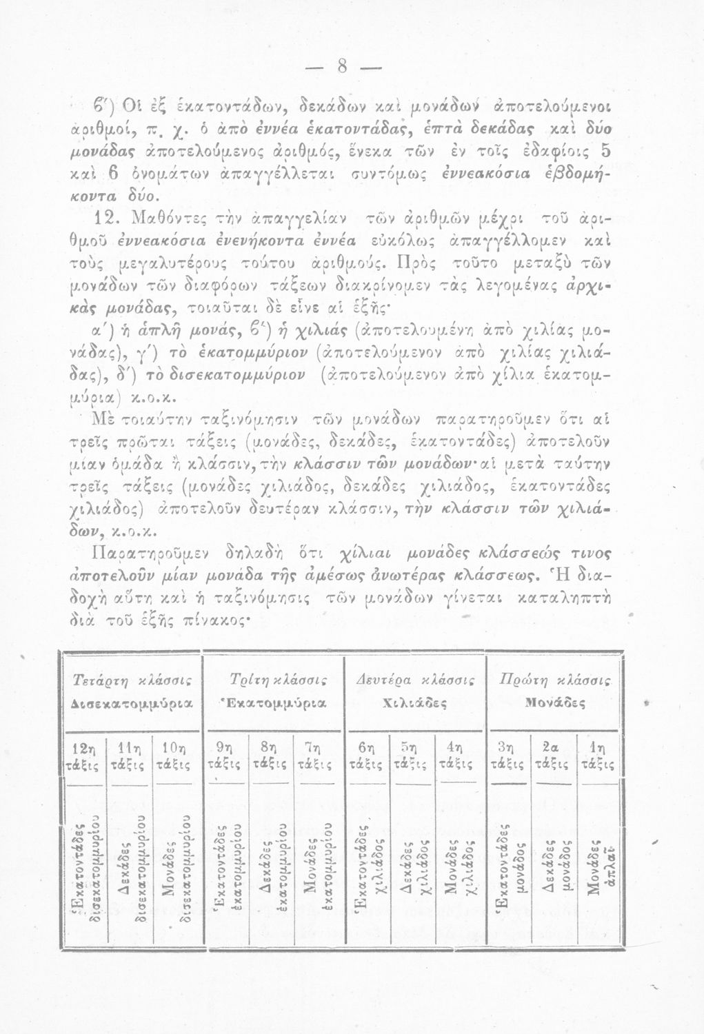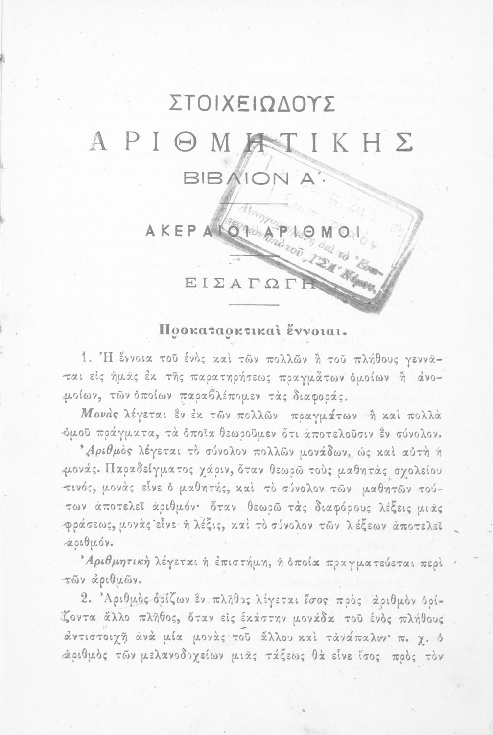 Παρουσίαση περιεχομένου: Σχολικό εγχειρίδιο Αριθμητικής για τα Ελληνικά Σχολεία χωρισμένο σε θεωρία και ασκήσεις που εστιάζει στις αριθμητικές πράξεις και τα κλάσματα. Περιέχει και παράρτημα λογιστικής.