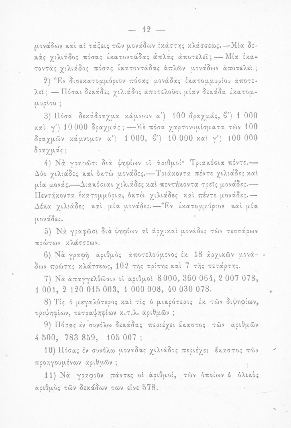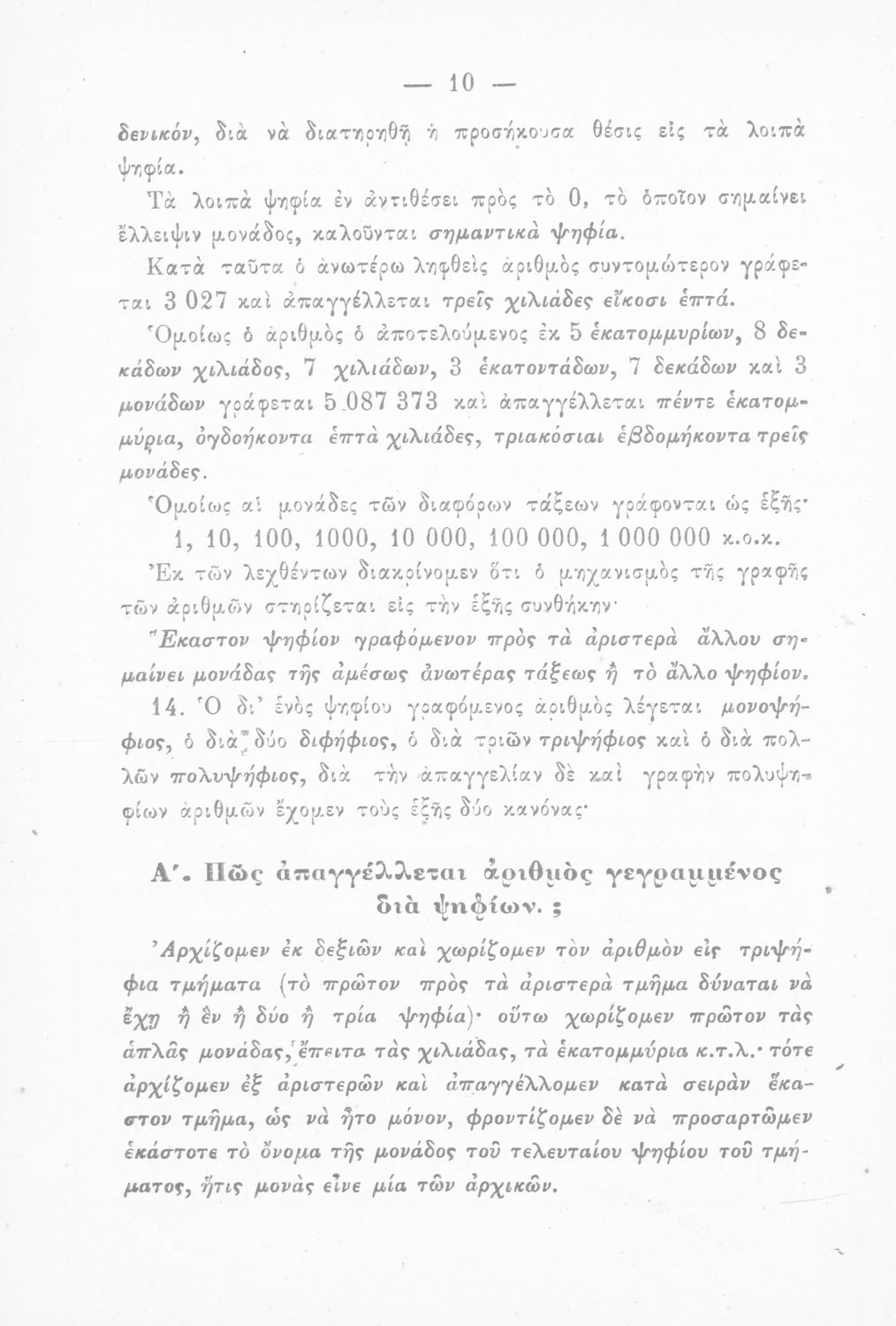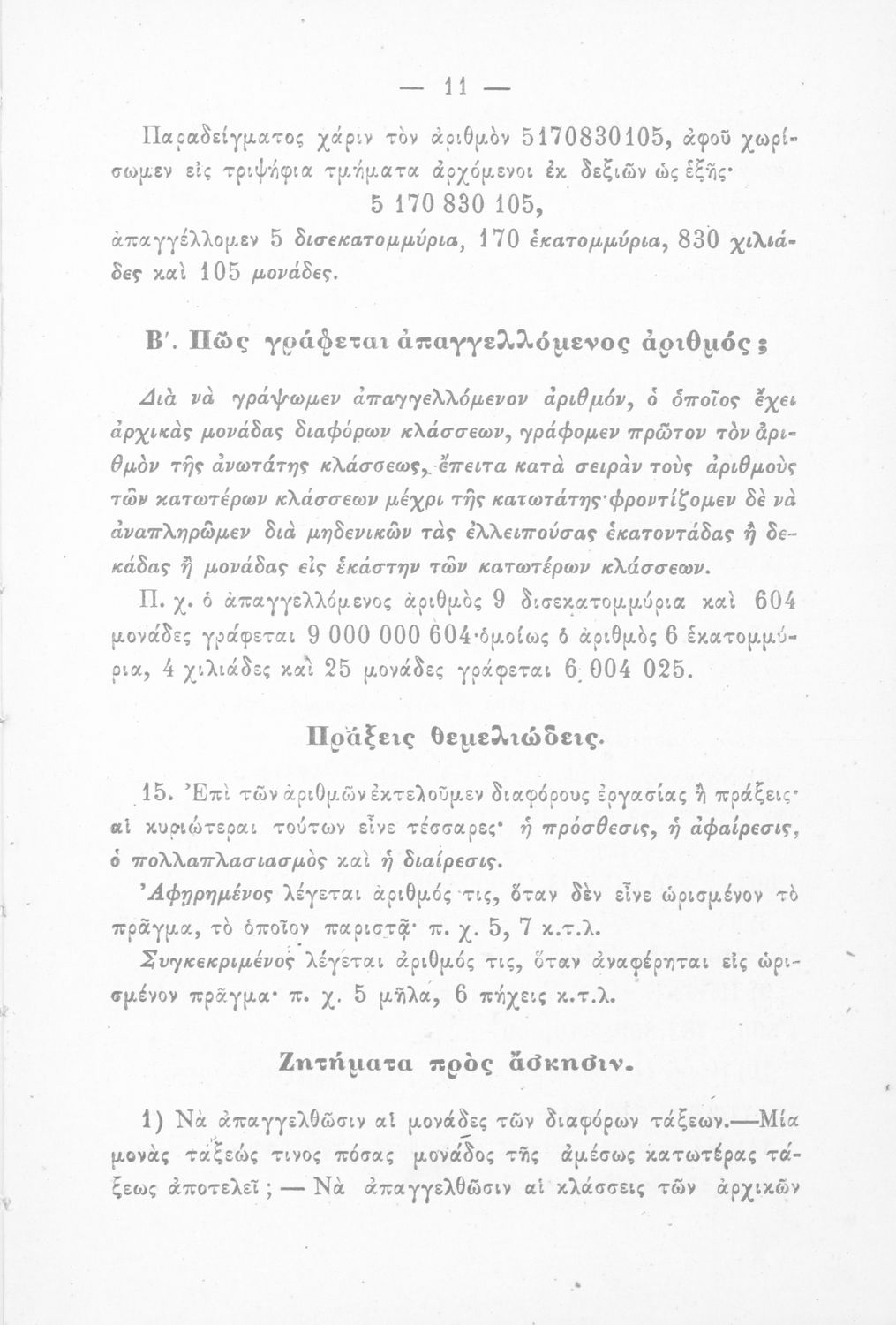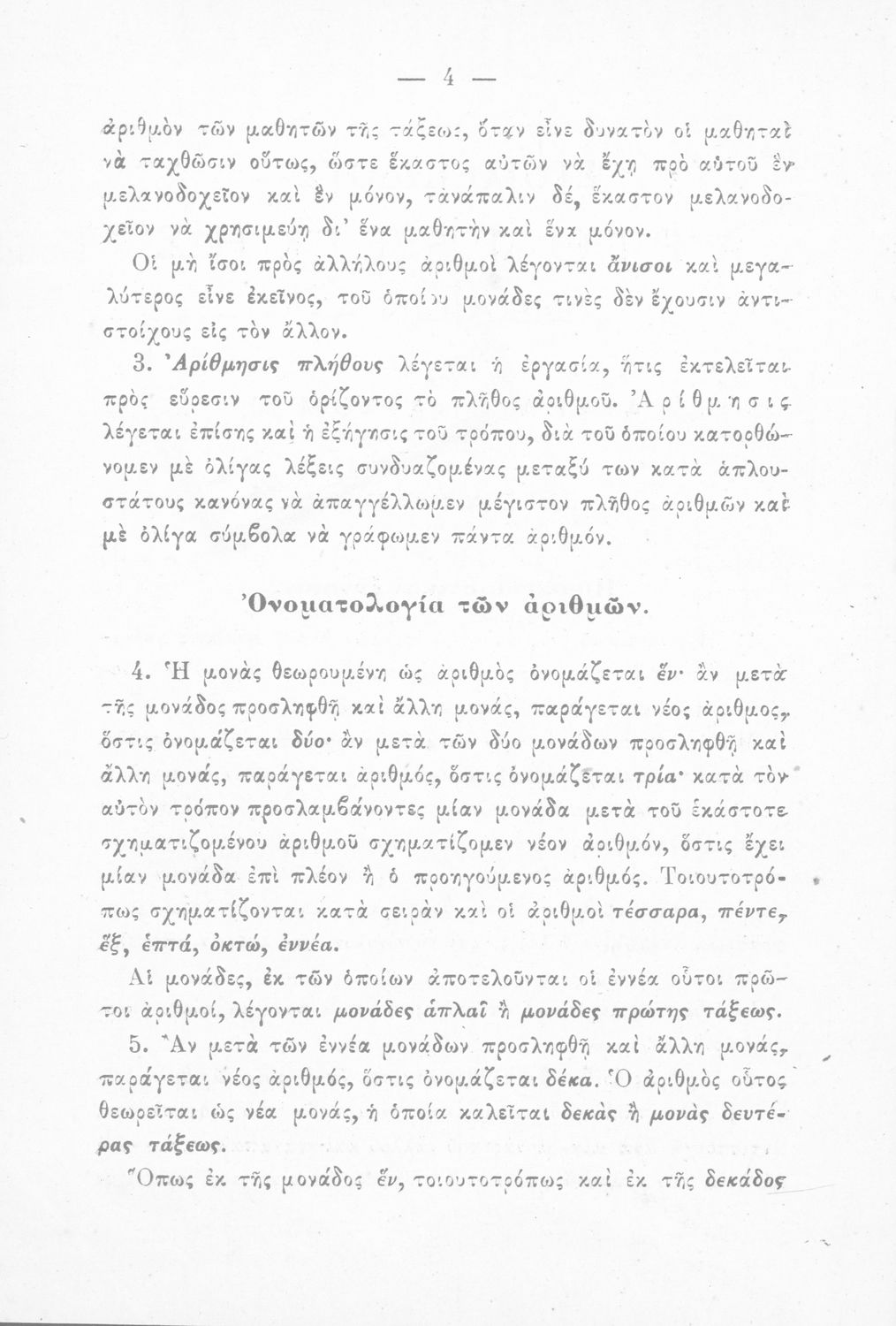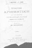 Σχολικό εγχειρίδιο Αριθμητικής για τα Ελληνικά και Αστικά Σχολεία και τα Παρθεναγωγεία που εστιάζει στις αριθμητικές πράξεις, τα κλάσματα, τους δεκαδικούς και συμμιγείς αριθμούς, και τις δυνάμεις. Περιέχει και