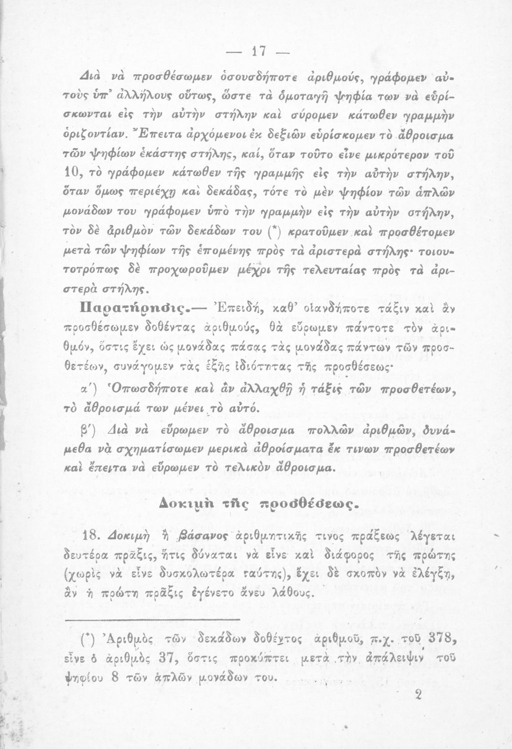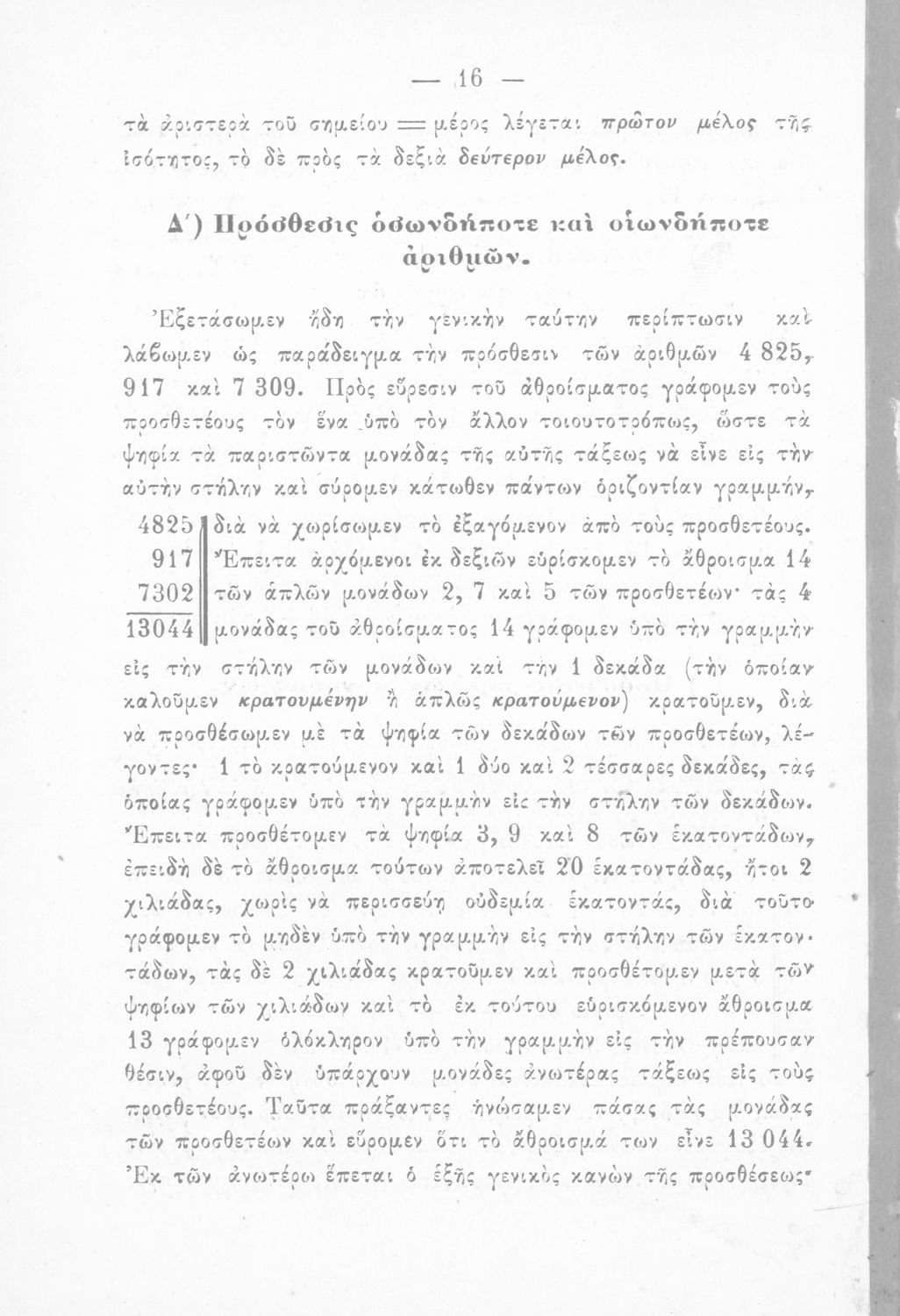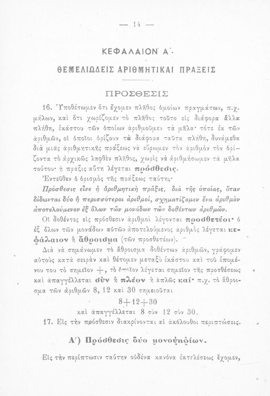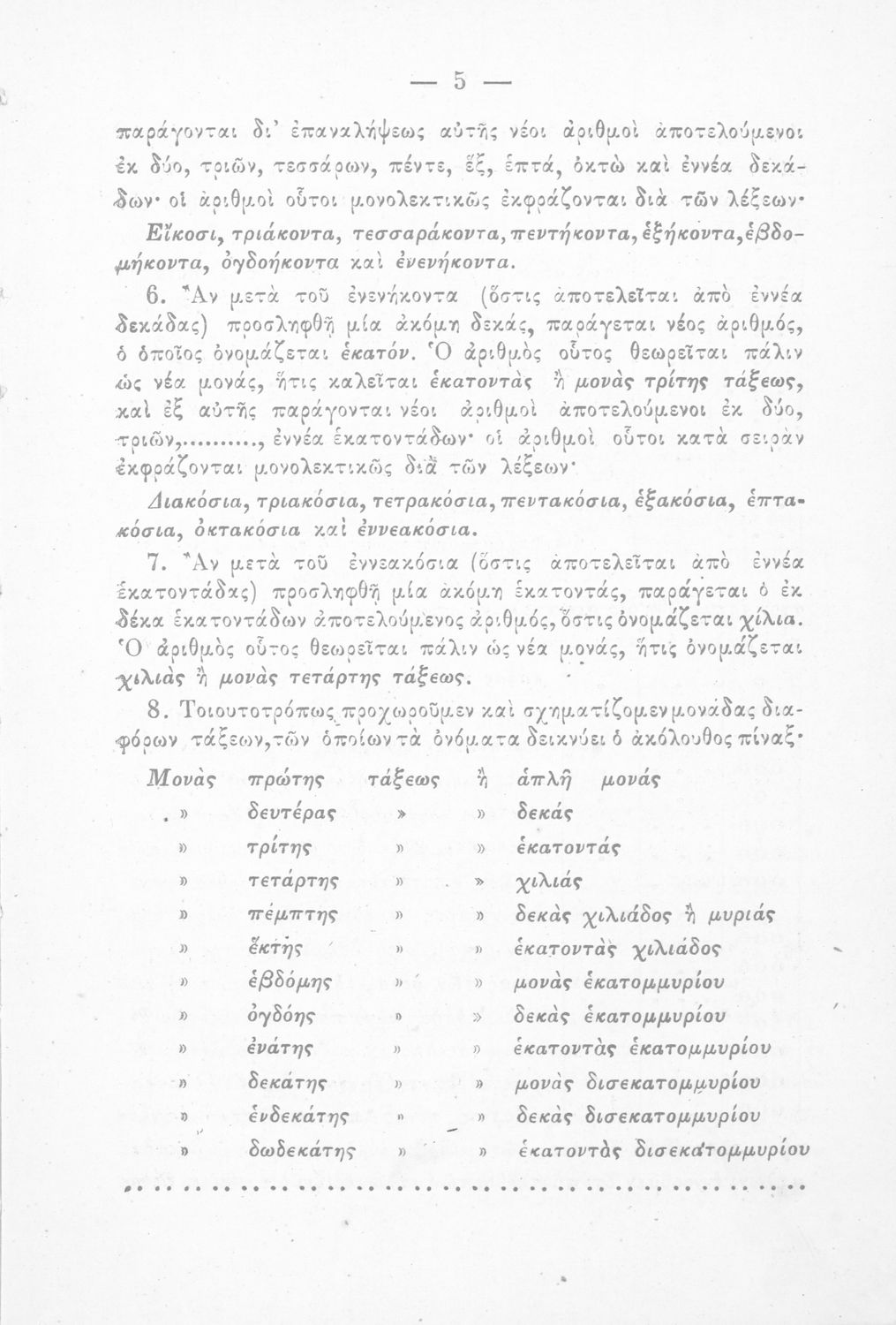 Σχολικό εγχειρίδιο Αριθμητικής για τα Ελληνικά και Αστικά Σχολεία και τα Παρθεναγωγεία που εστιάζει στις αριθμητικές πράξεις, τα κλάσματα, τους δεκαδικούς και συμμιγείς αριθμούς, και τις δυνάμεις. Περιέχει και