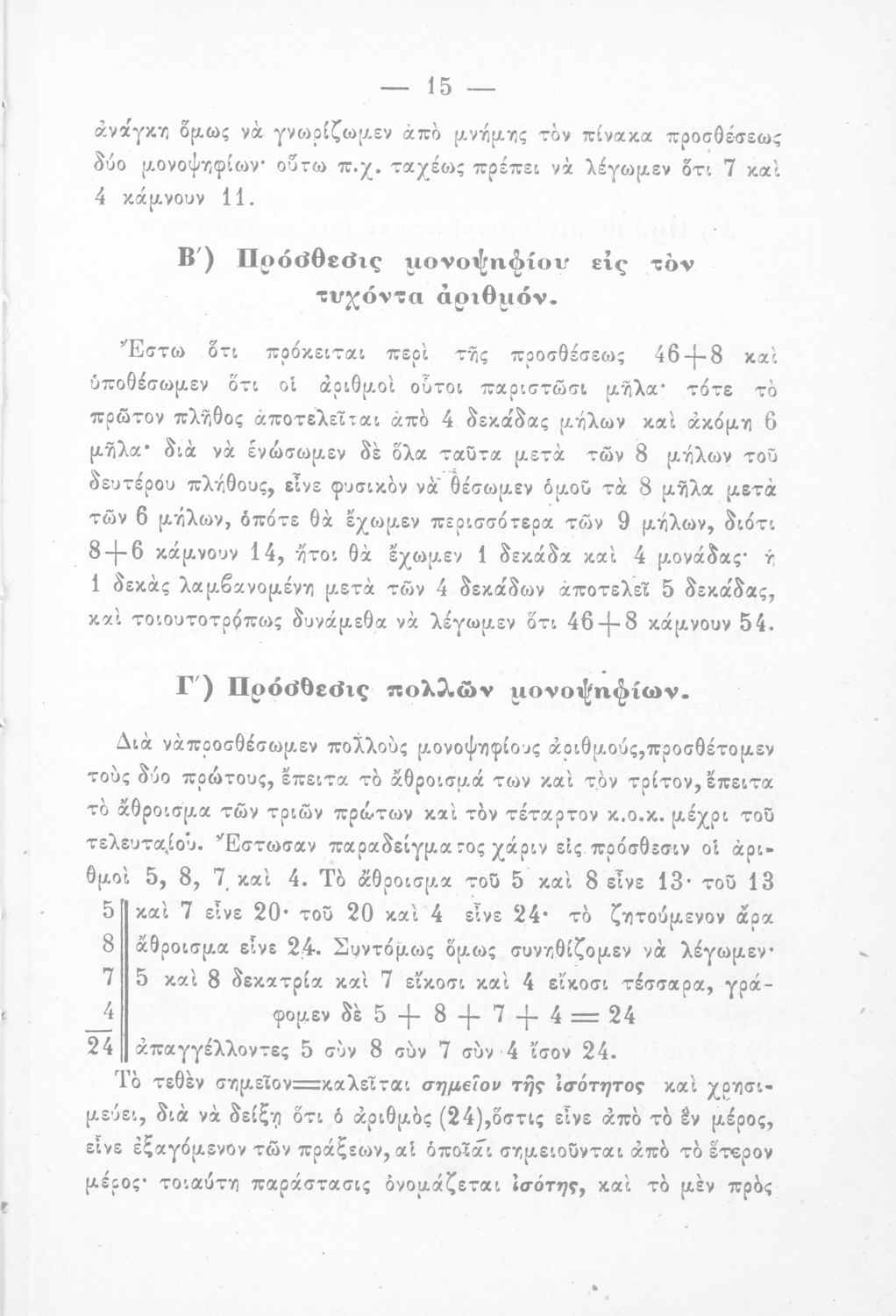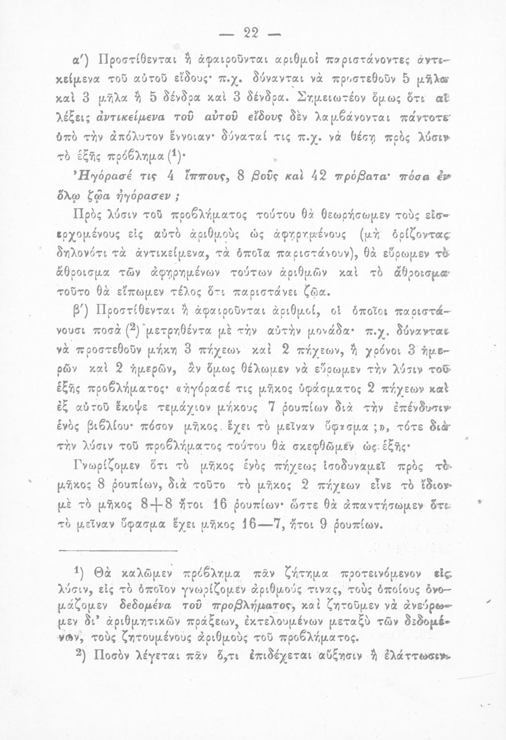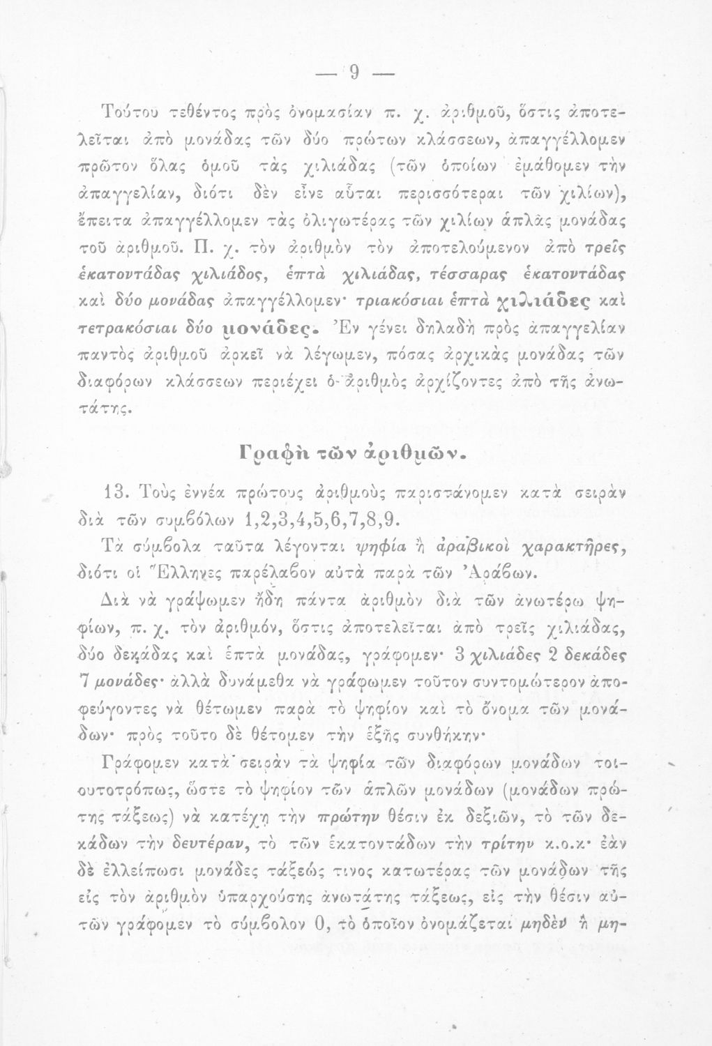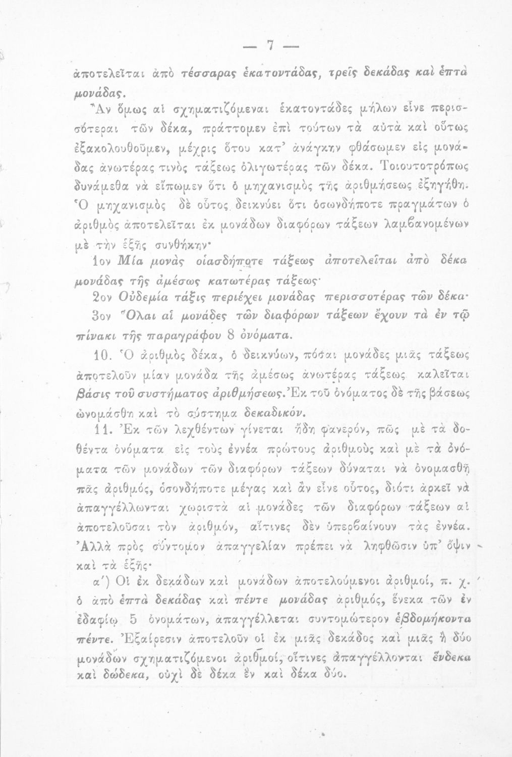 Σχολικό εγχειρίδιο Αριθμητικής για τα Ελληνικά και Αστικά Σχολεία και τα Παρθεναγωγεία που εστιάζει στις αριθμητικές πράξεις, τα κλάσματα, τους δεκαδικούς και συμμιγείς αριθμούς, και τις δυνάμεις. Περιέχει και