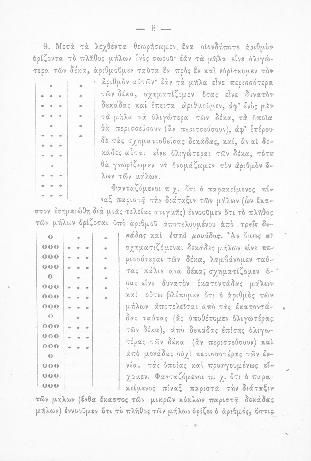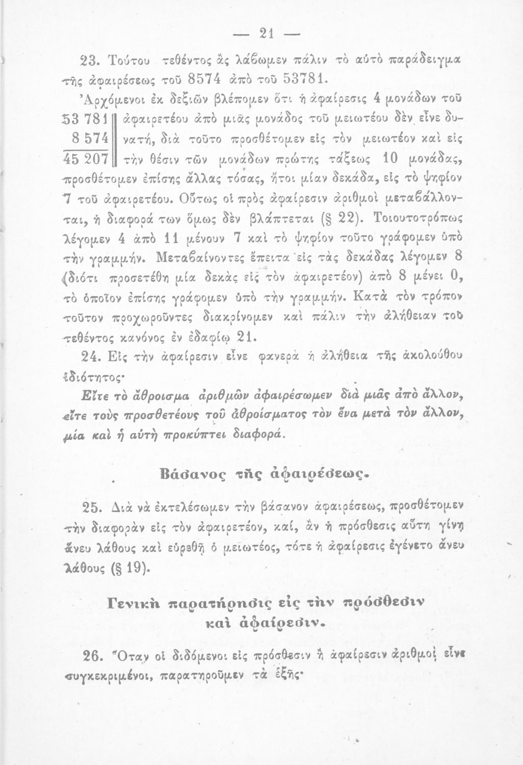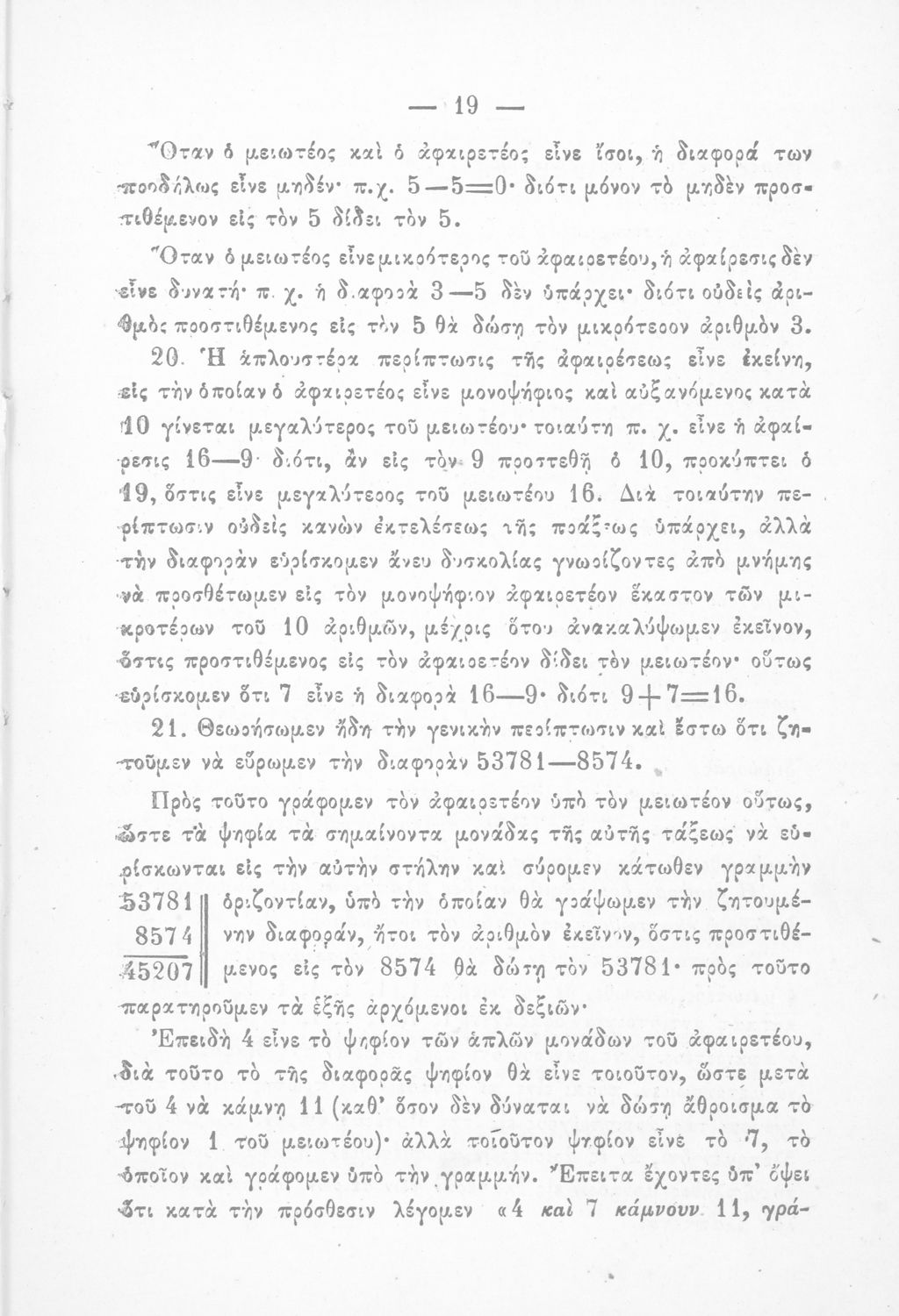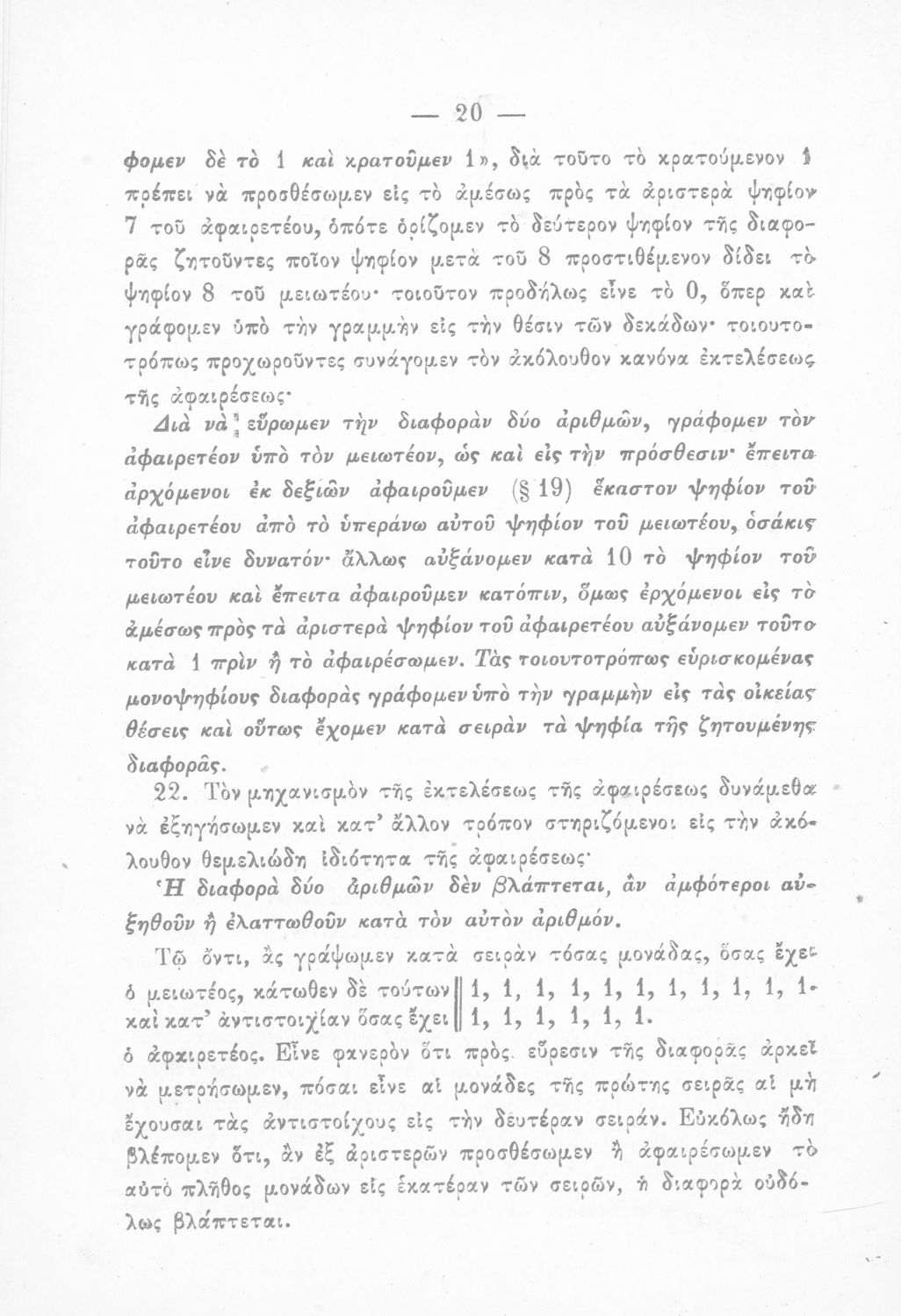 Σχολικό εγχειρίδιο Αριθμητικής για τα Ελληνικά και Αστικά Σχολεία και τα Παρθεναγωγεία που εστιάζει στις αριθμητικές πράξεις, τα κλάσματα, τους δεκαδικούς και συμμιγείς αριθμούς, και τις δυνάμεις. Περιέχει και