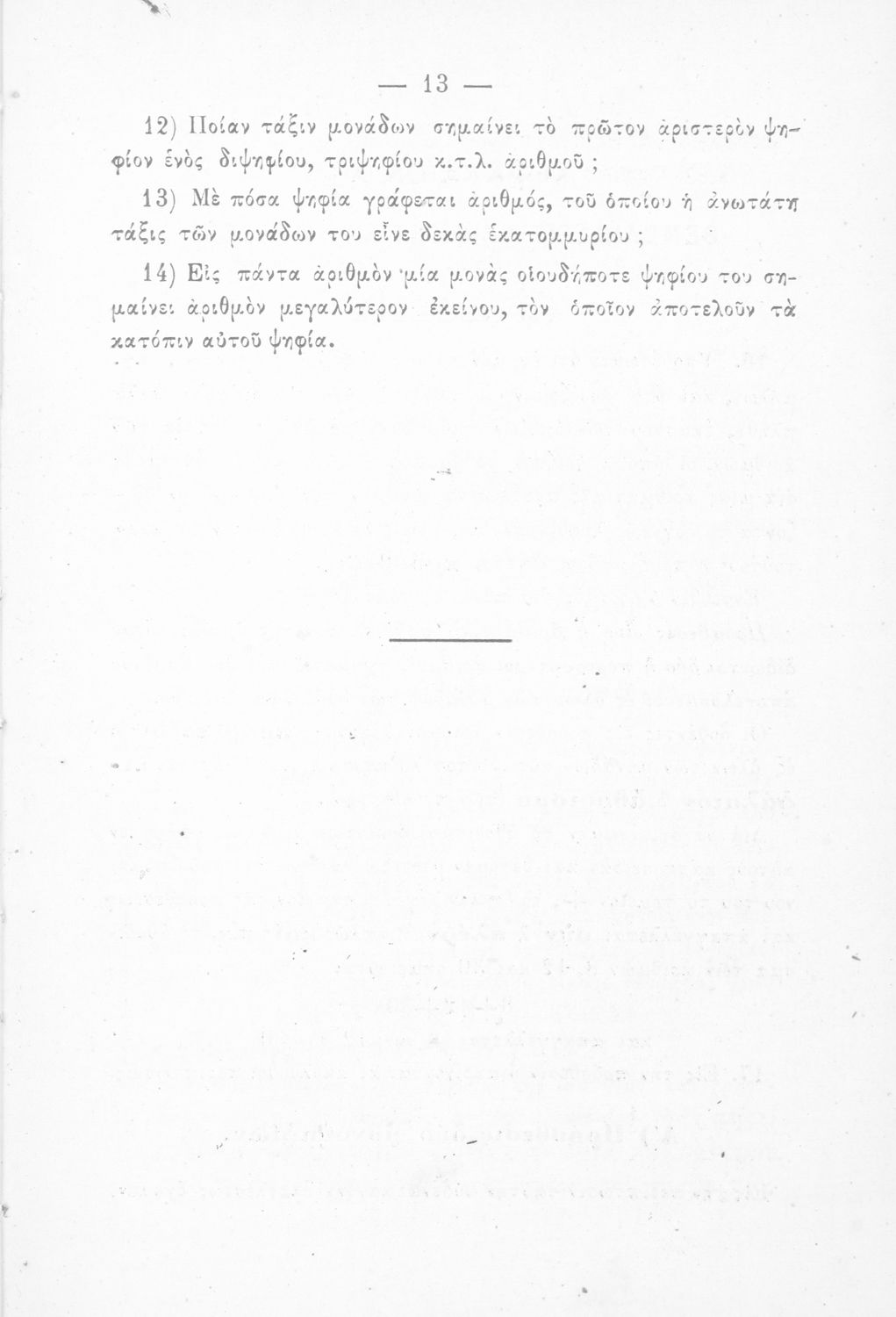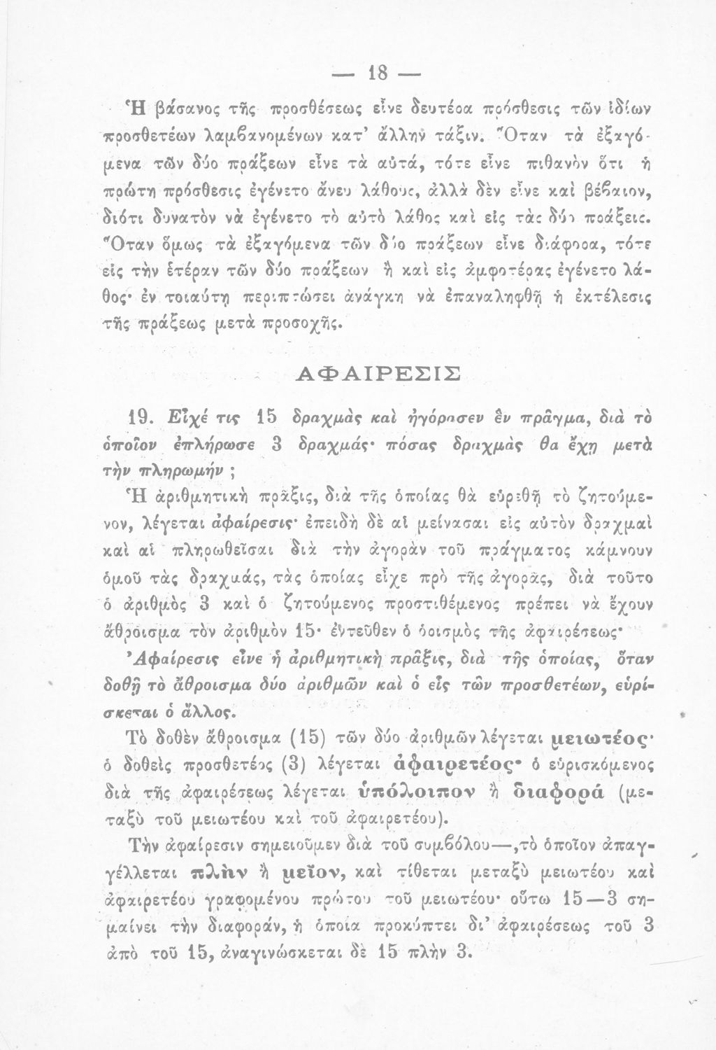 Σχολικό εγχειρίδιο Αριθμητικής για τα Ελληνικά Σχολεία χωρισμένο σε θεωρία και ασκήσεις που εστιάζει στις αριθμητικές πράξεις και τα κλάσματα. Περιέχει και παράρτημα λογιστικής.