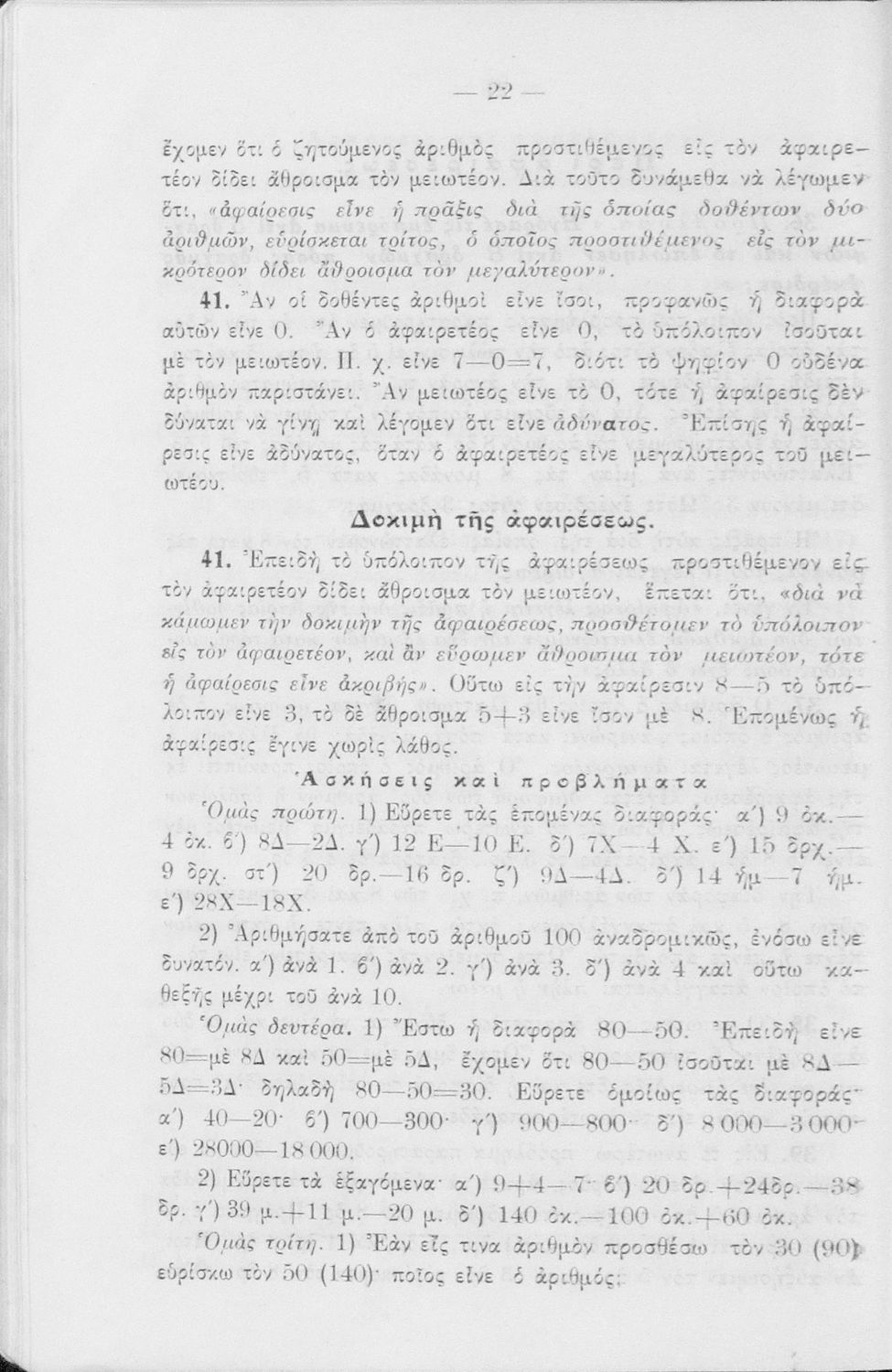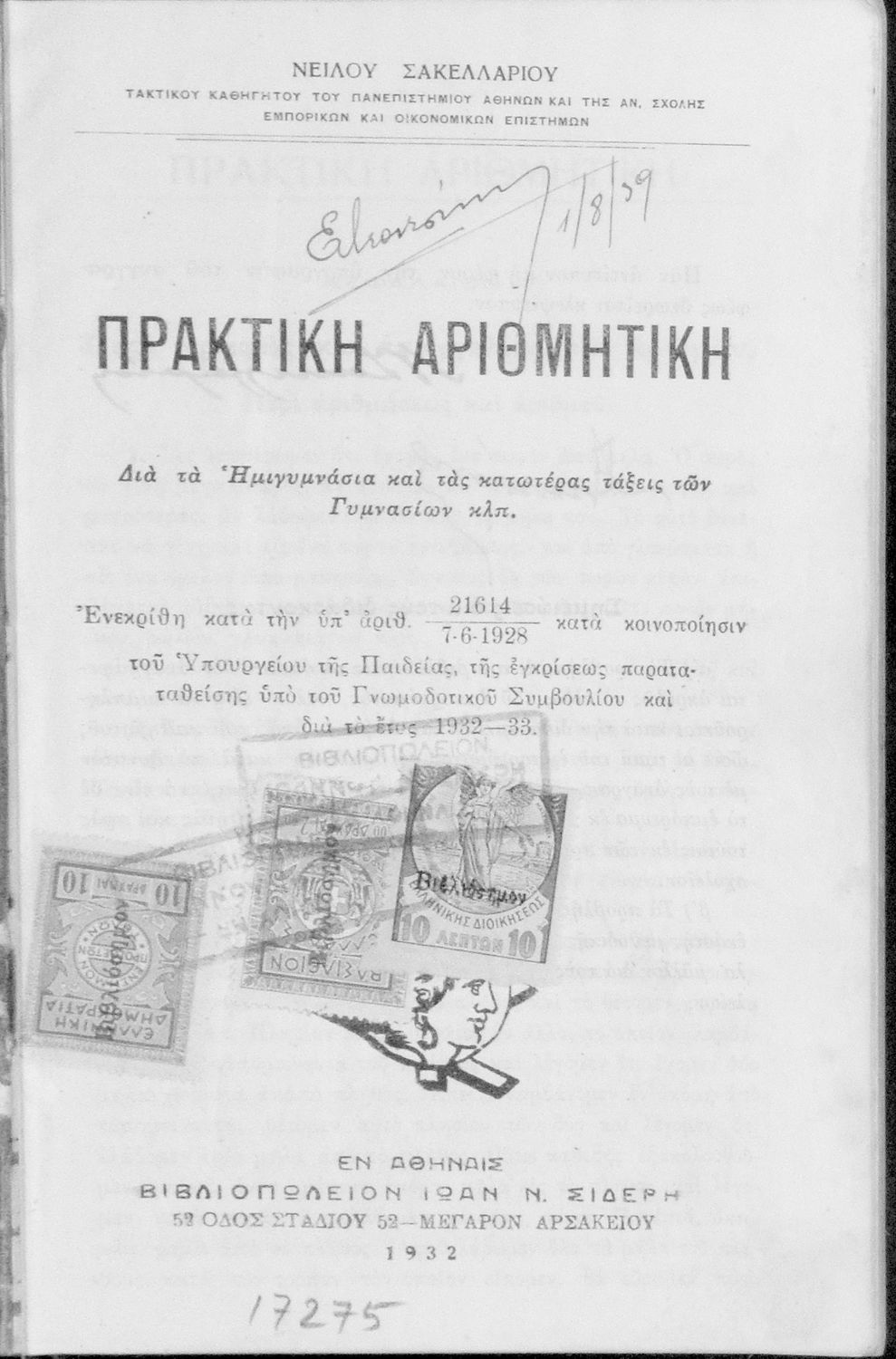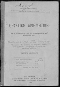 Παρουσίαση περιεχομένου: Σχολικό εγχειρίδιο Αριθμητικής για τα Ημιγυμνάσια και Γυμνάσια χωρισμένο σε θεωρία και ασκήσεις. Περιλαμβάνει και στοιχεία λογιστικής και καταστιχογραφίας. Ο συγγραφέας ήταν καθηγητής στο Πανεπιστήμιο Αθηνών.