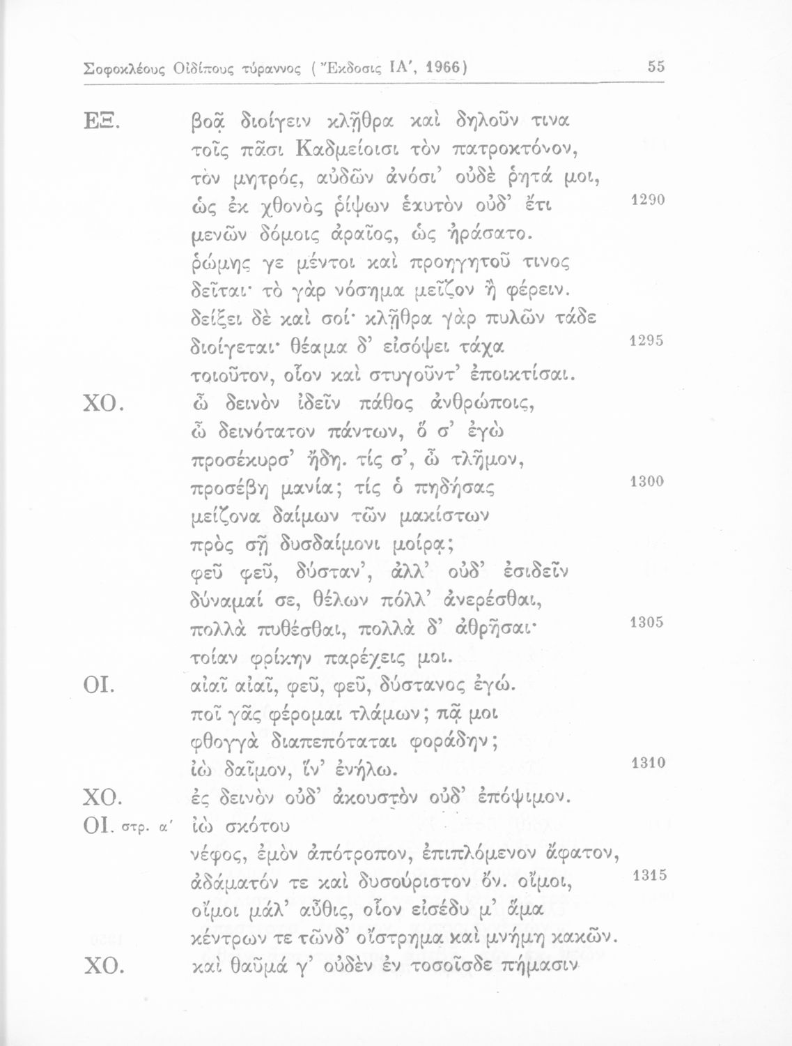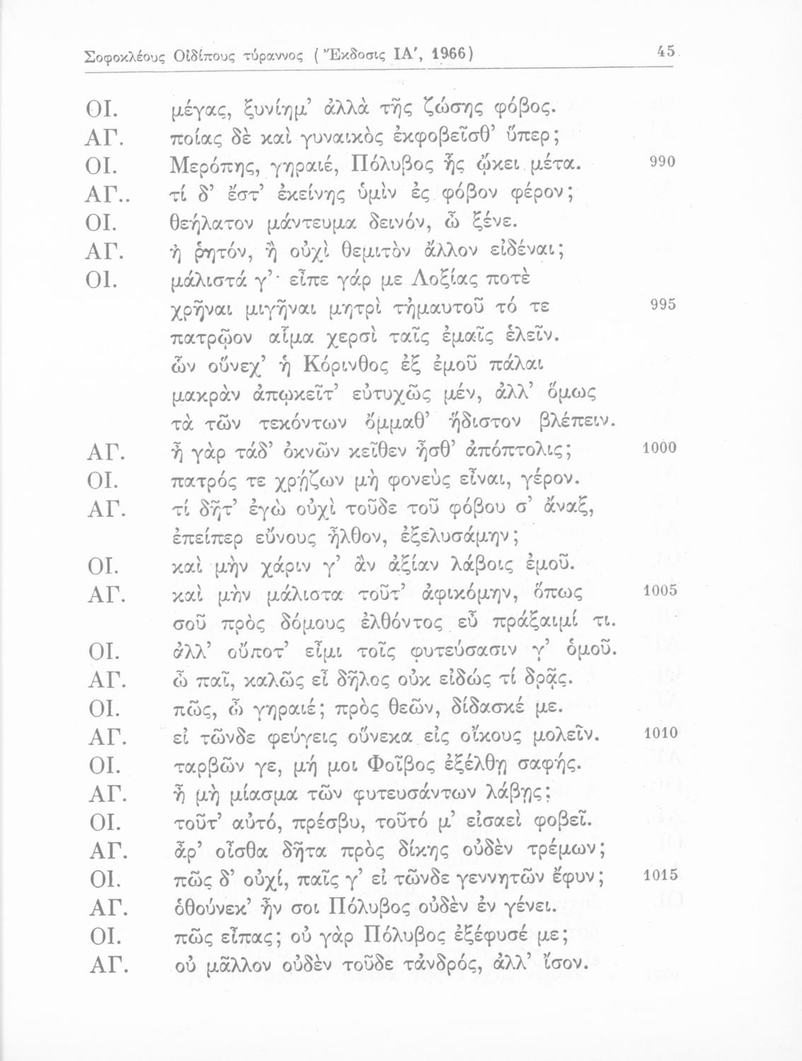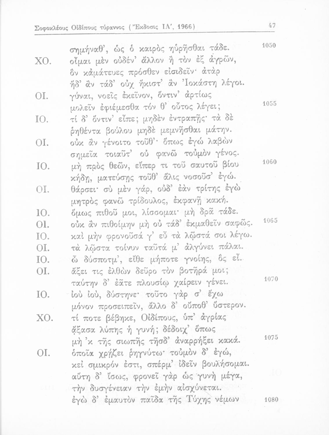 Σχολικό εγχειρίδιο του Γυμνασίου για το μάθημα των Αρχαίων Ελληνικών που περιέχει την τραγωδία του Σοφοκλή Οιδίπους Τύραννος, ερμηνευτικά και πραγματολογικά σχόλια και λεξιλογικές παρατηρήσεις.