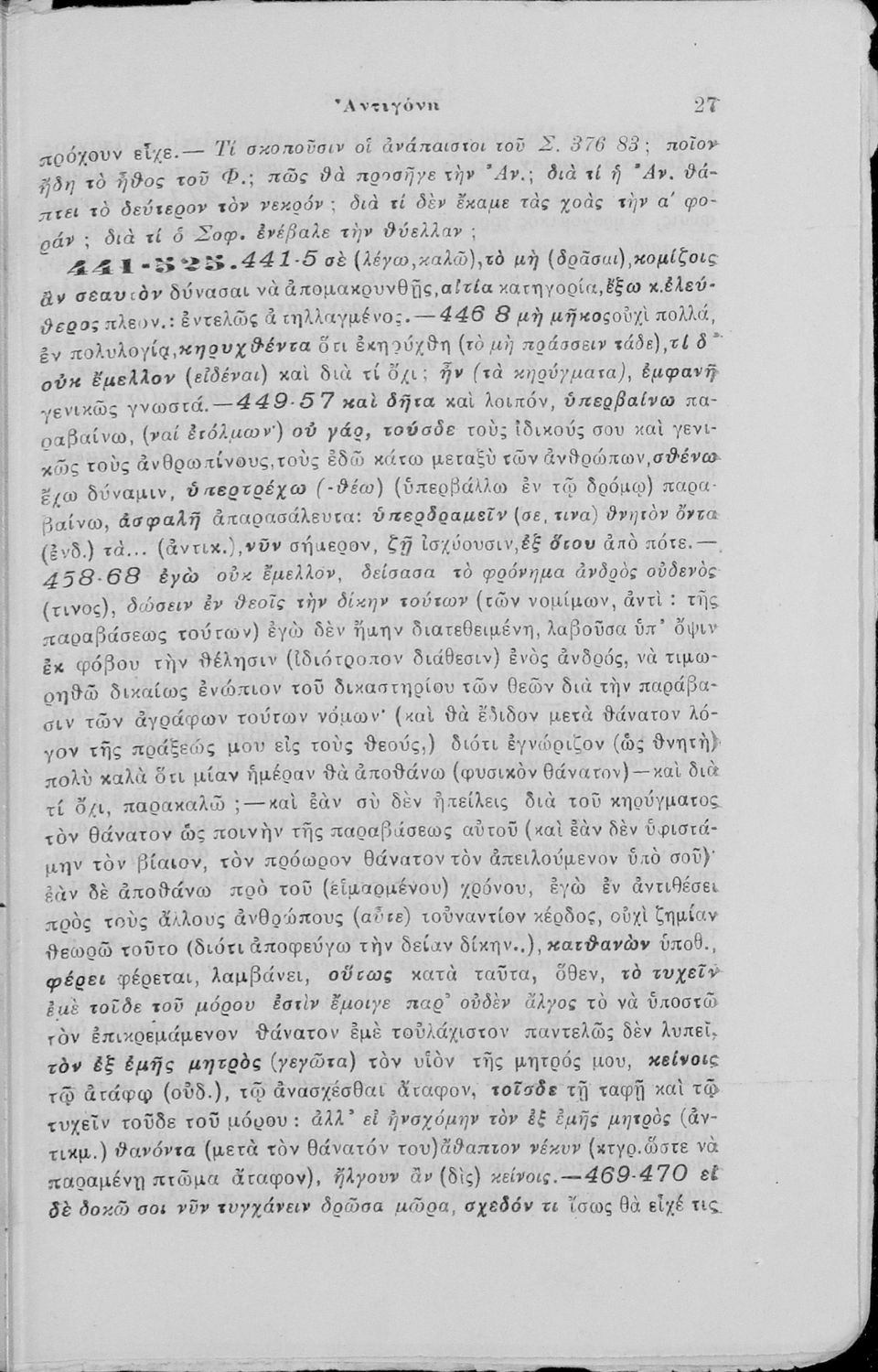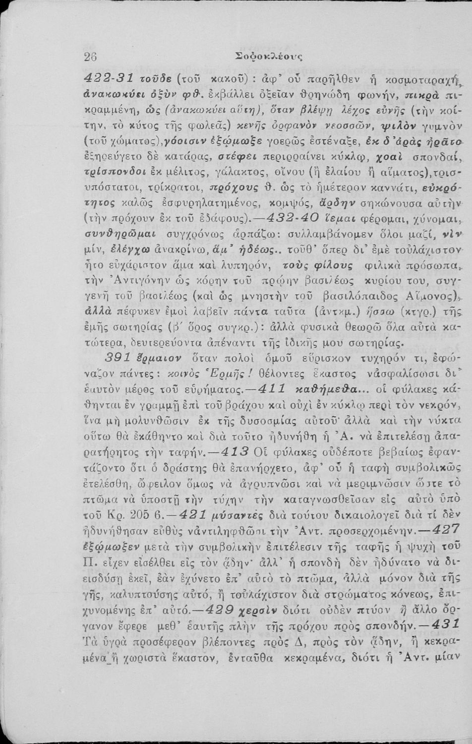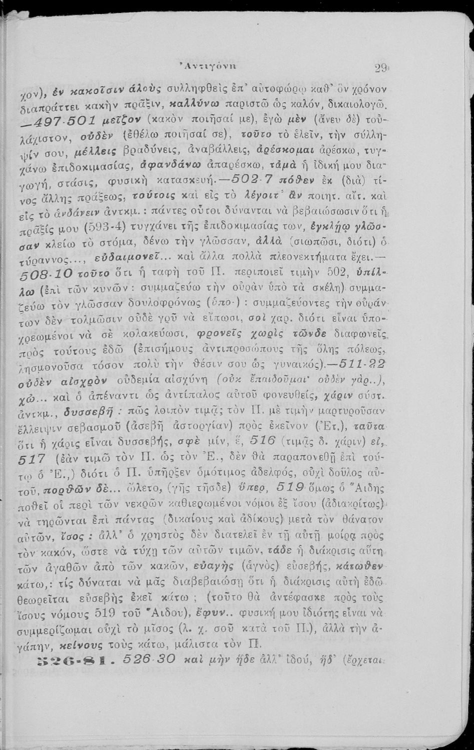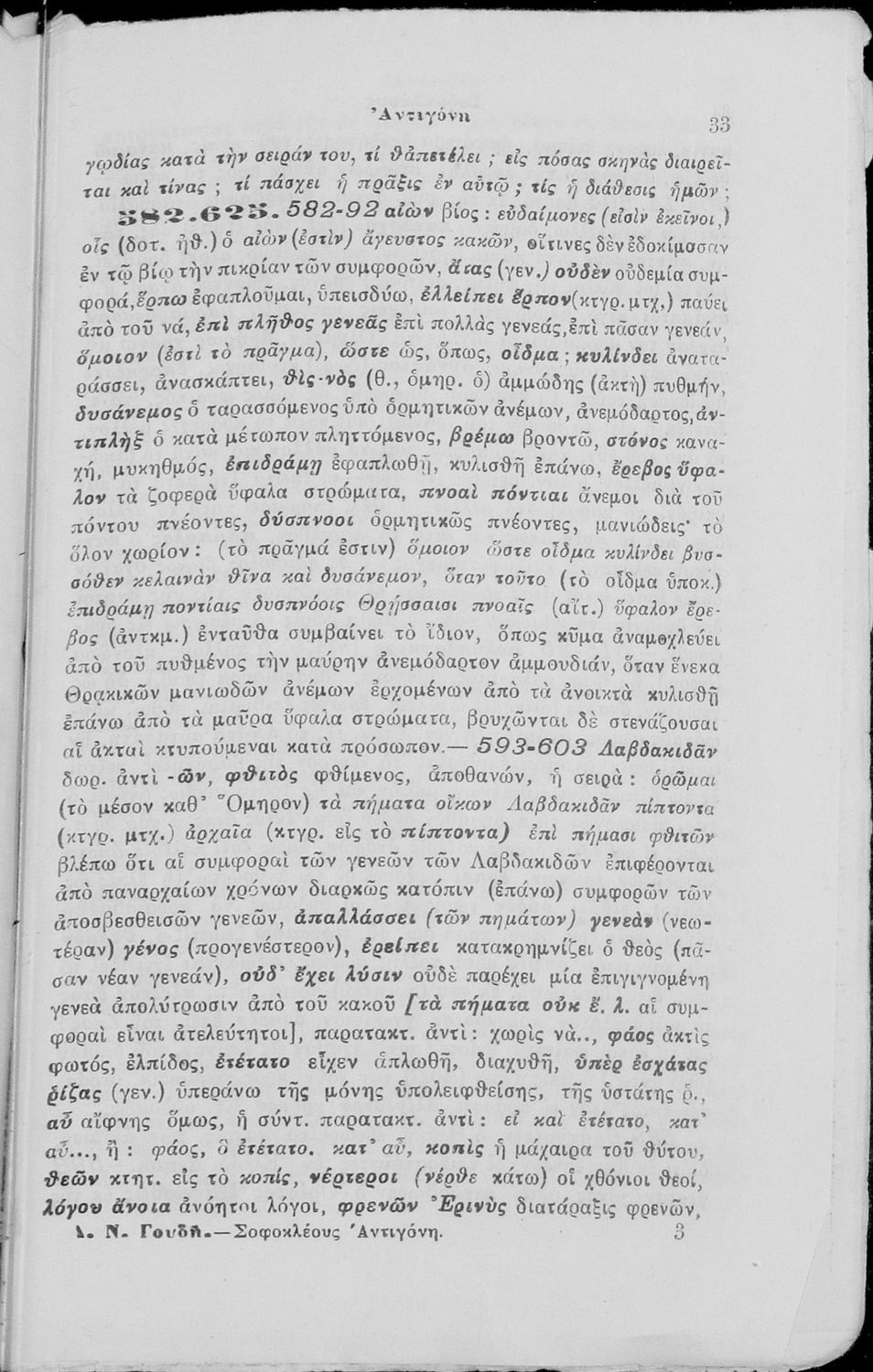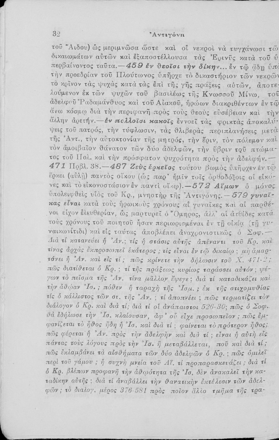 Μαθητικό βοήθημα Αρχαίων Ελληνικών που περιλαμβάνει την τραγωδία του Σοφοκλή Αντιγόνη με εισαγωγή, ερμηνευτικές και πραγματολογικές σημειώσεις. Ο συγγραφέας ήταν πρώτος Γυμνασιάρχης του Πρότυπου Κλασσικού Γυμνασίου και πρώτος Διευθυντής στη Βαρβάκειο Πρότυπο Σχολή.