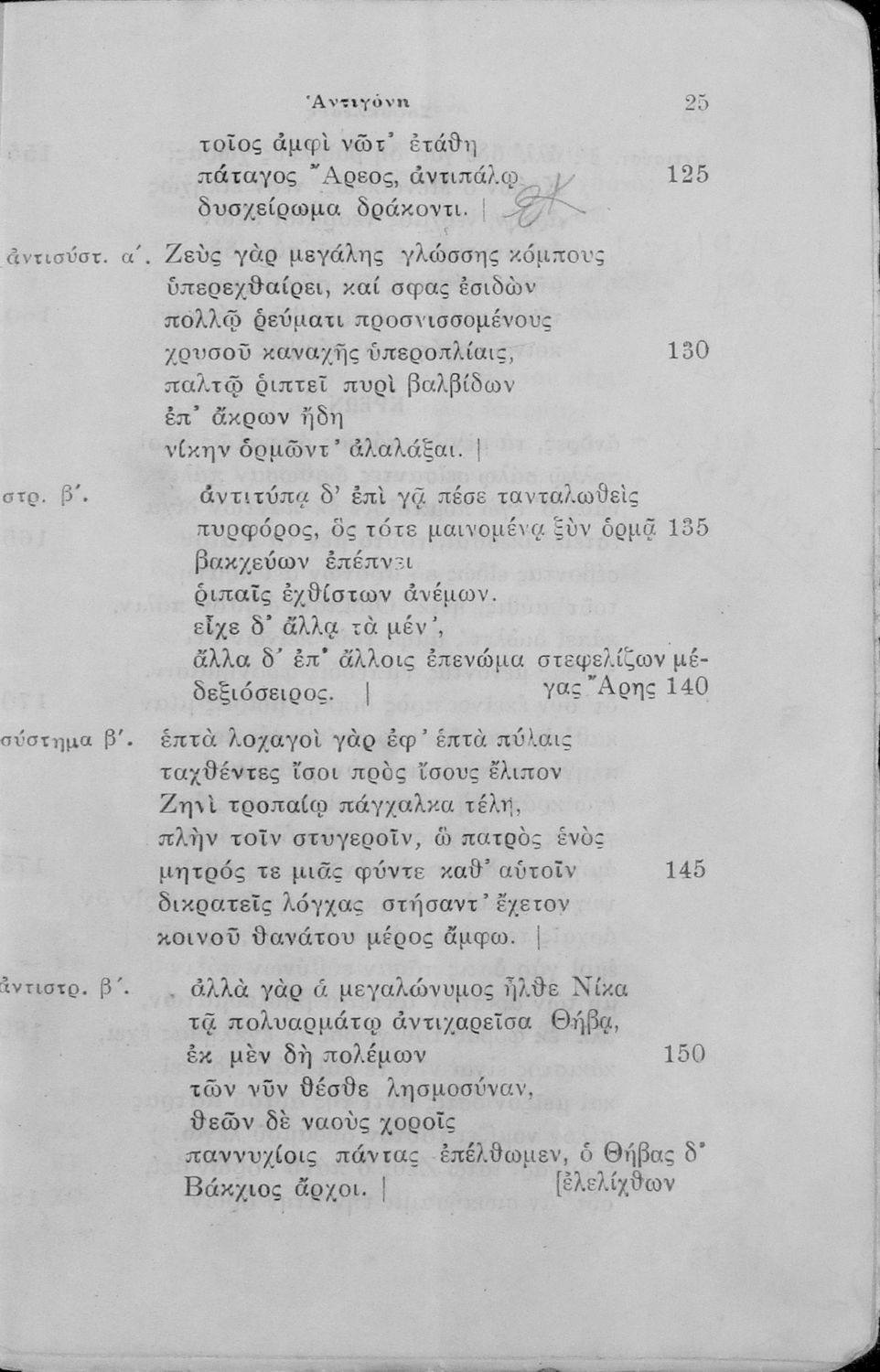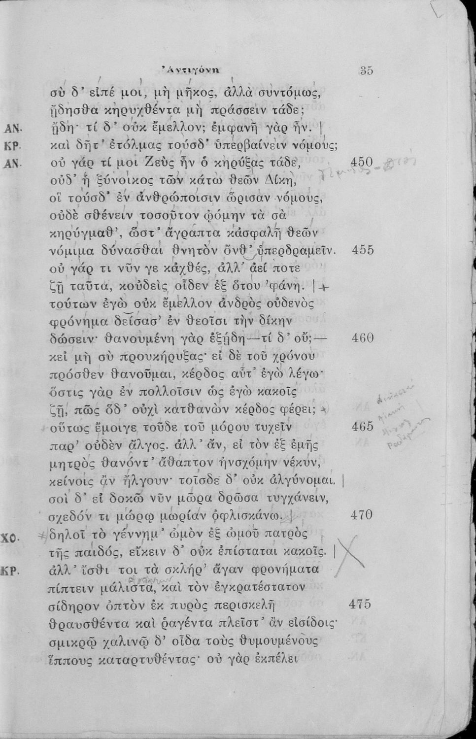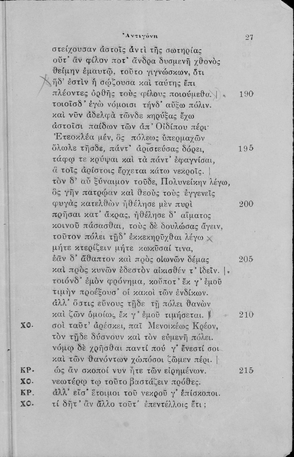 Παιδαγωγικό βοήθημα Αρχαίων Ελληνικών. Περιέχει τη τραγωδία του Σοφοκλή, την Αντιγόνη με σχόλια από τον Μιστριώτη που υπήρξε τακτικός καθηγητής των ελληνικών γραμμάτων στο εθνικό Πανεπιστήμιο.