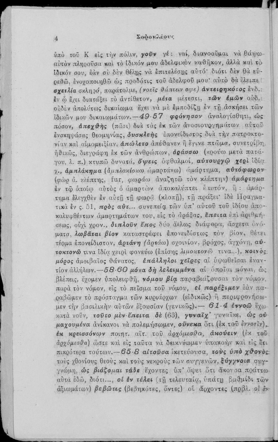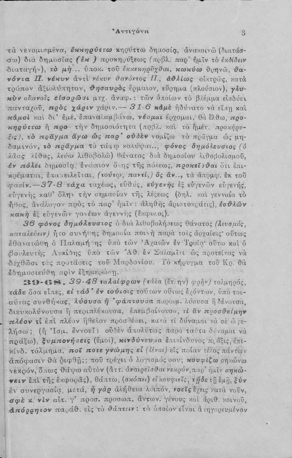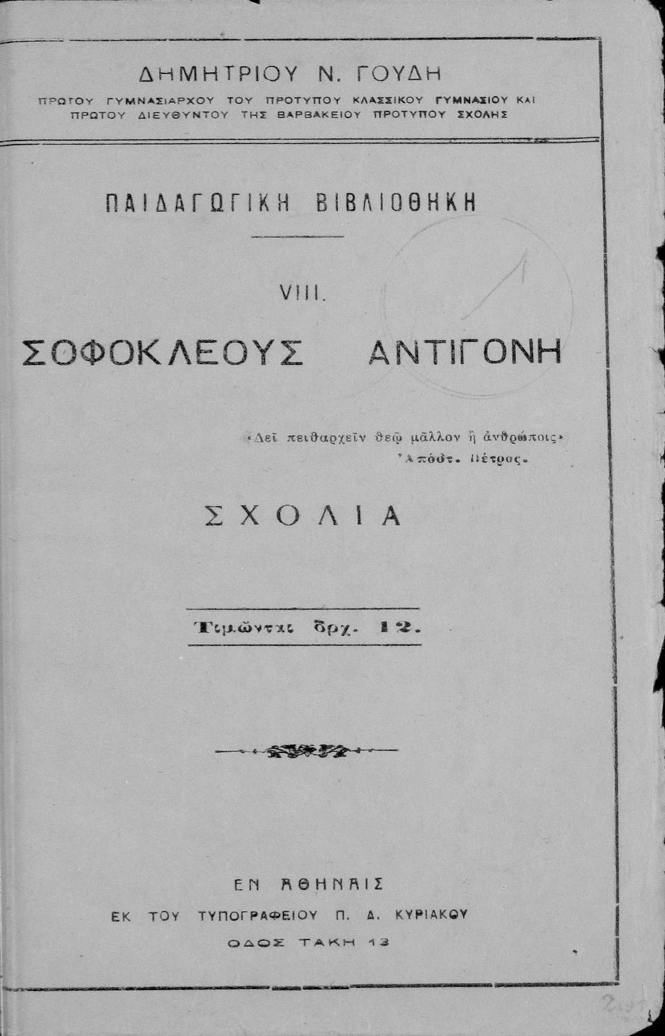 Μαθητικό βοήθημα Αρχαίων Ελληνικών που περιλαμβάνει την τραγωδία του Σοφοκλή Αντιγόνη με εισαγωγή, ερμηνευτικές και πραγματολογικές σημειώσεις. Ο συγγραφέας ήταν πρώτος Γυμνασιάρχης του Πρότυπου Κλασσικού Γυμνασίου και πρώτος Διευθυντής στη Βαρβάκειο Πρότυπο Σχολή.