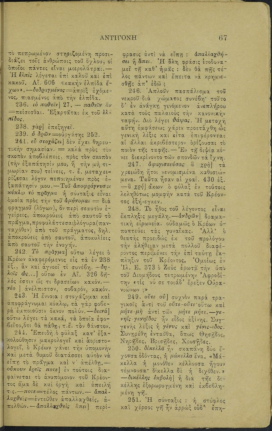 Παιδαγωγικό βοήθημα Αρχαίων Ελληνικών. Περιέχει τη τραγωδία του Σοφοκλή, την Αντιγόνη με σχόλια από τον Μιστριώτη που υπήρξε τακτικός καθηγητής των ελληνικών γραμμάτων στο εθνικό Πανεπιστήμιο.