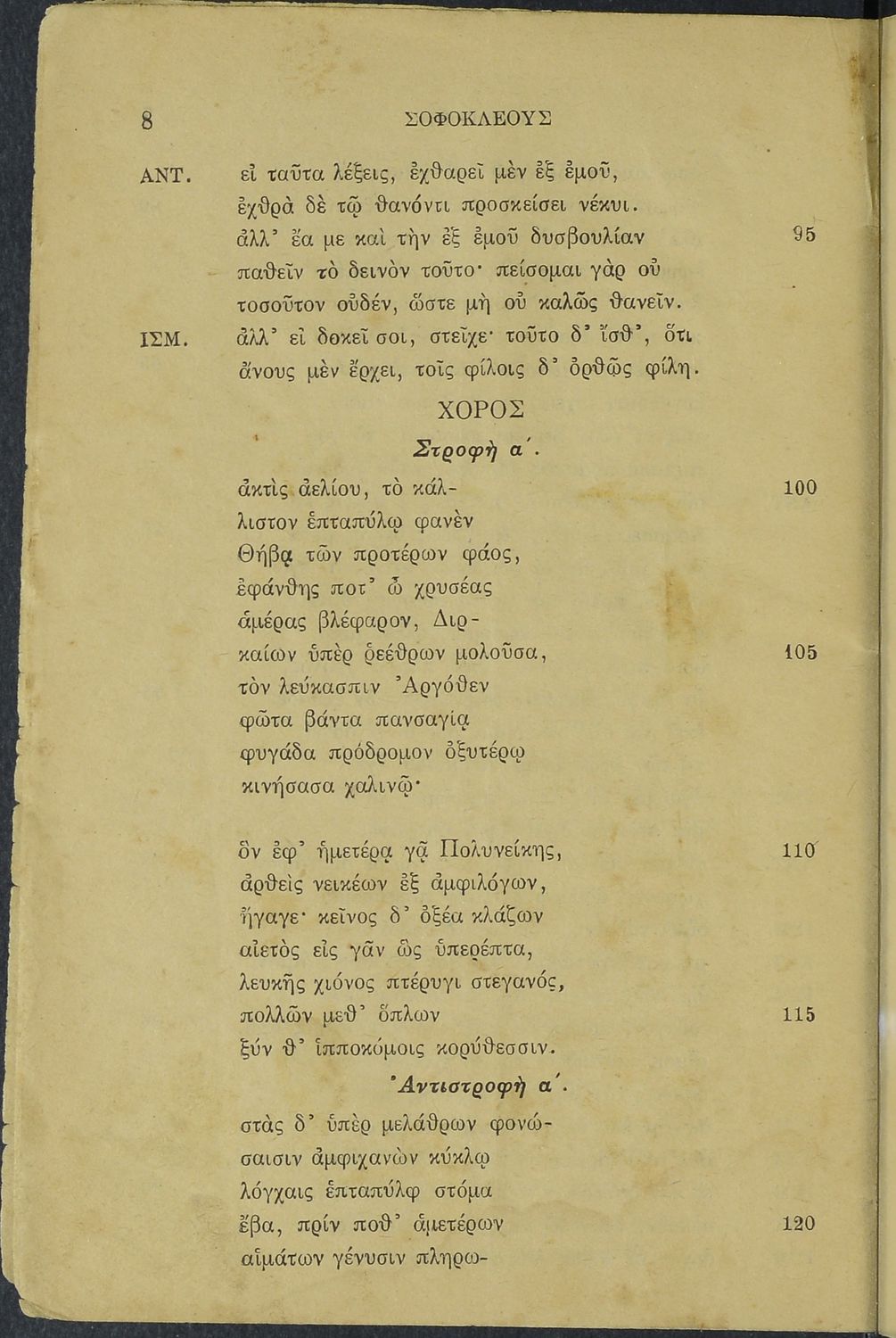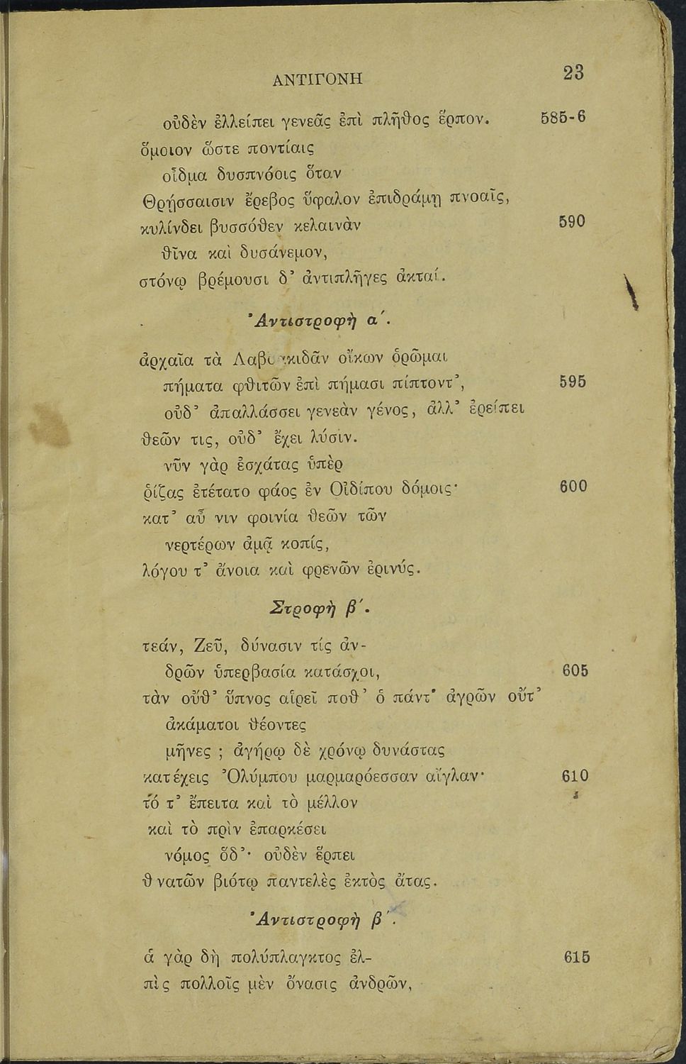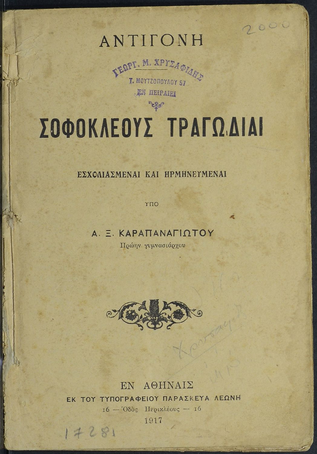 Παιδαγωγικό βοήθημα Αρχαίων Ελληνικών. Περιέχει τη τραγωδία του Σοφοκλή, την Αντιγόνη με σχόλια από τον Μιστριώτη που υπήρξε τακτικός καθηγητής των ελληνικών γραμμάτων στο εθνικό Πανεπιστήμιο.