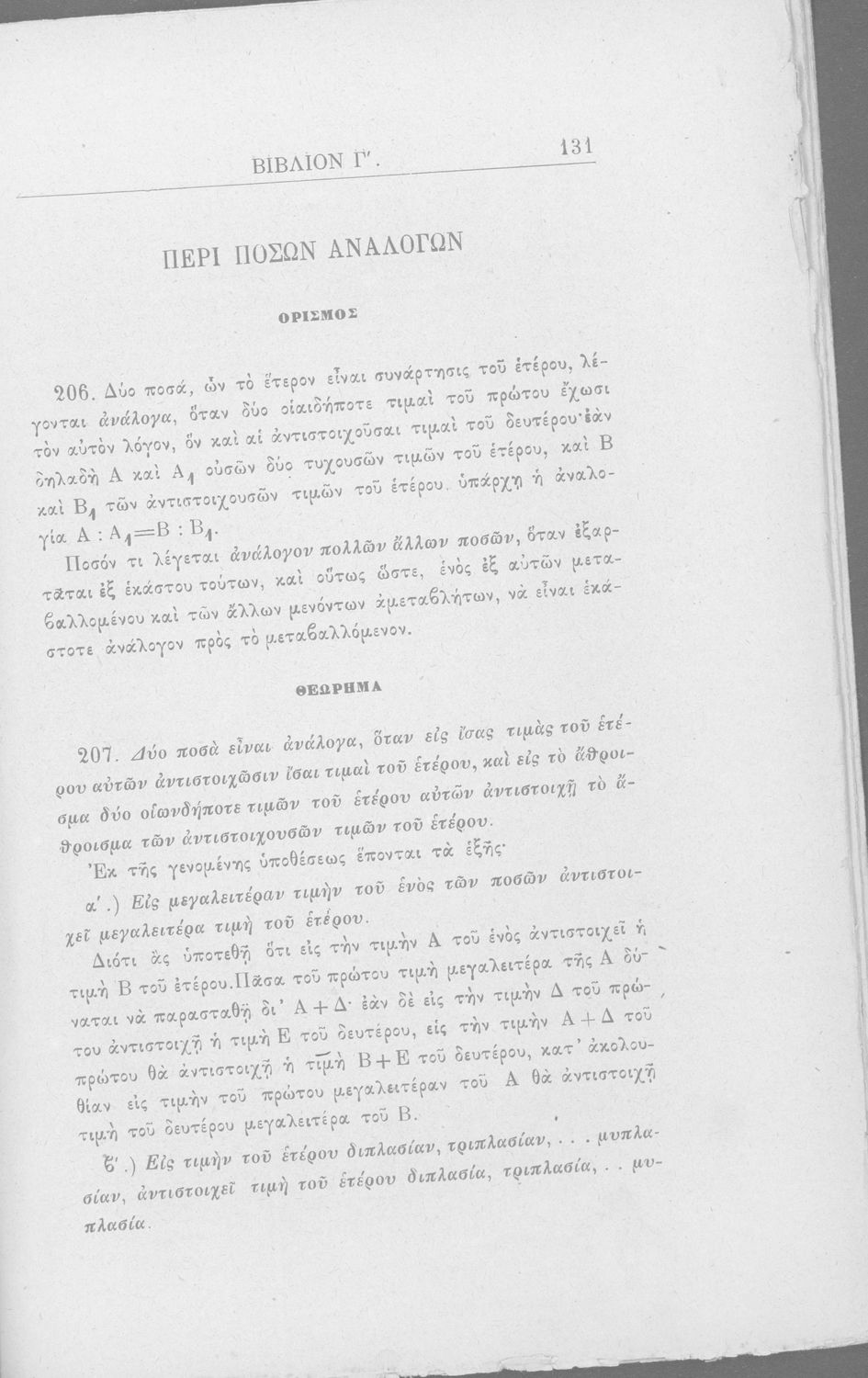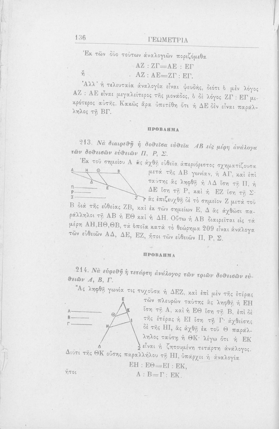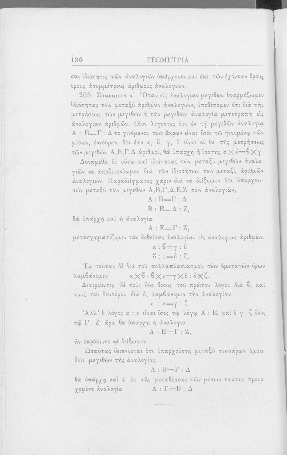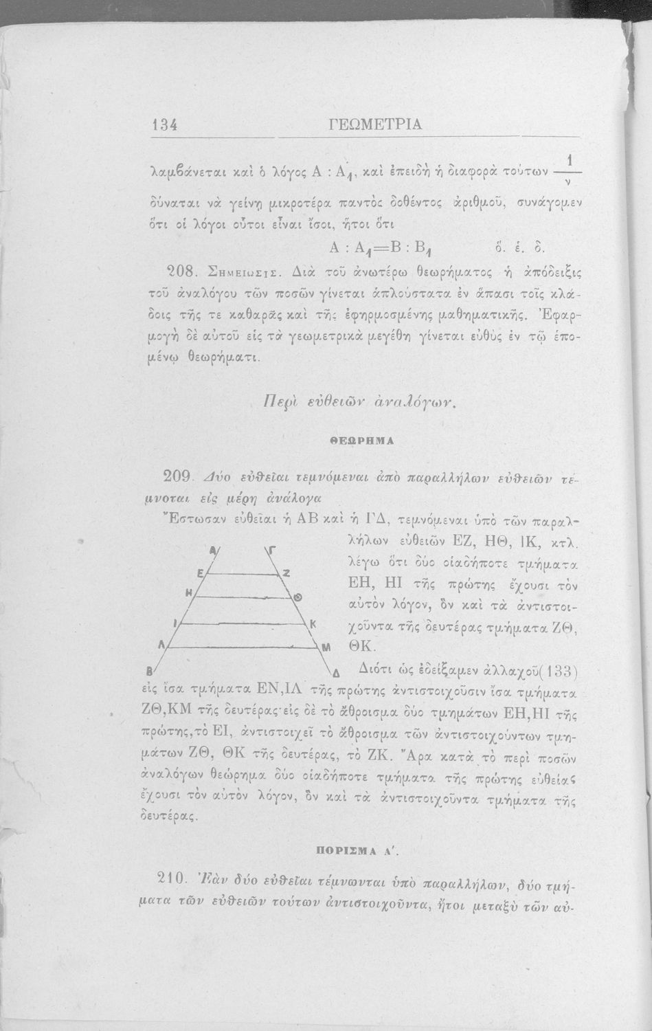 Σχολικό εγχειρίδιο Γεωμετρίας που είναι χωρισμένο σε αξιώματα, θεωρήματα και πορίσματα και εστιάζει στην Επίπεδη Γεωμετρία και τη Στερεομετρία.