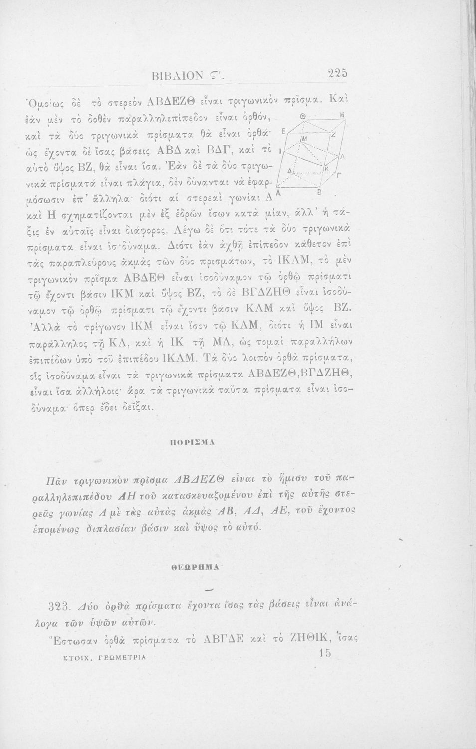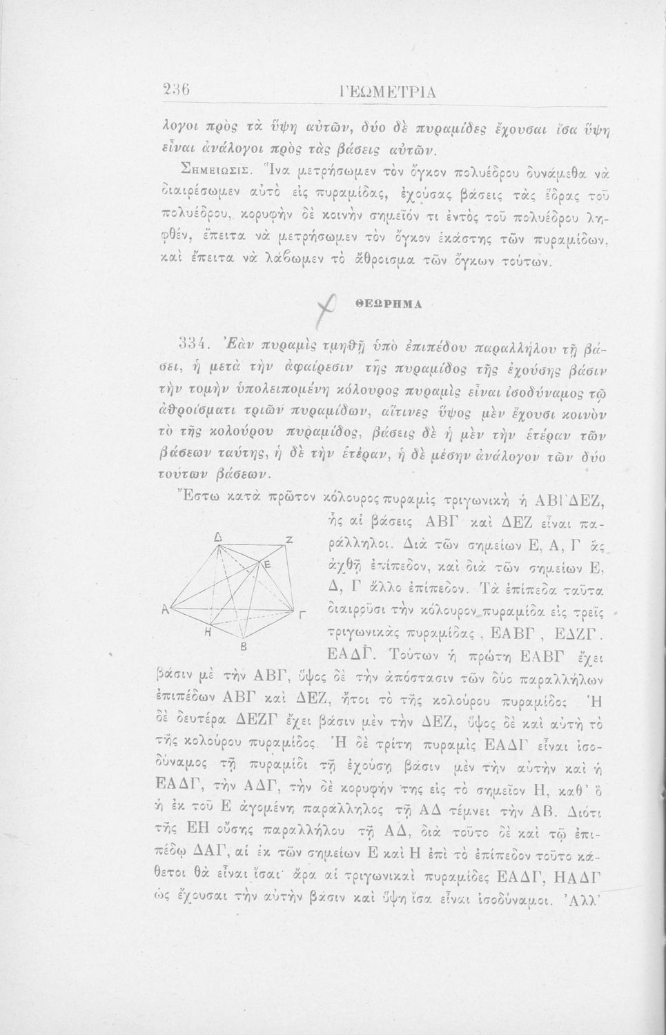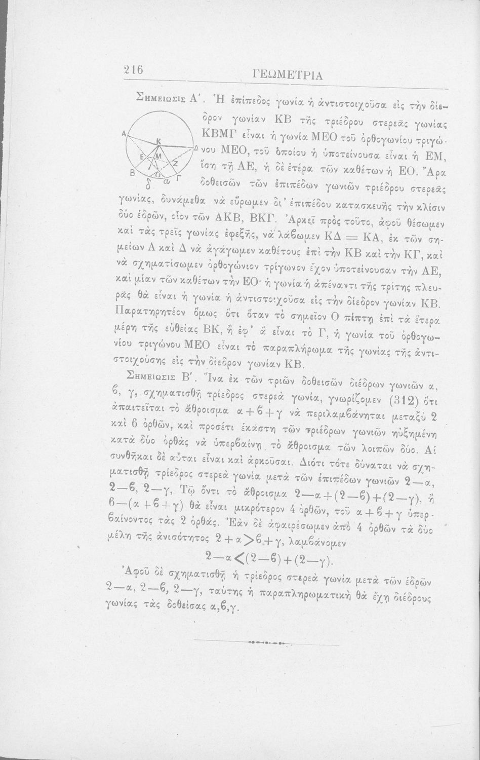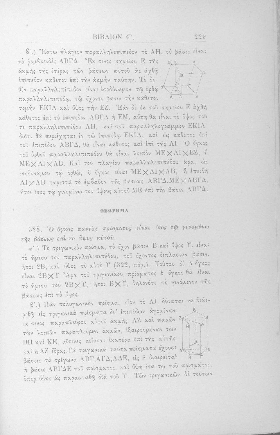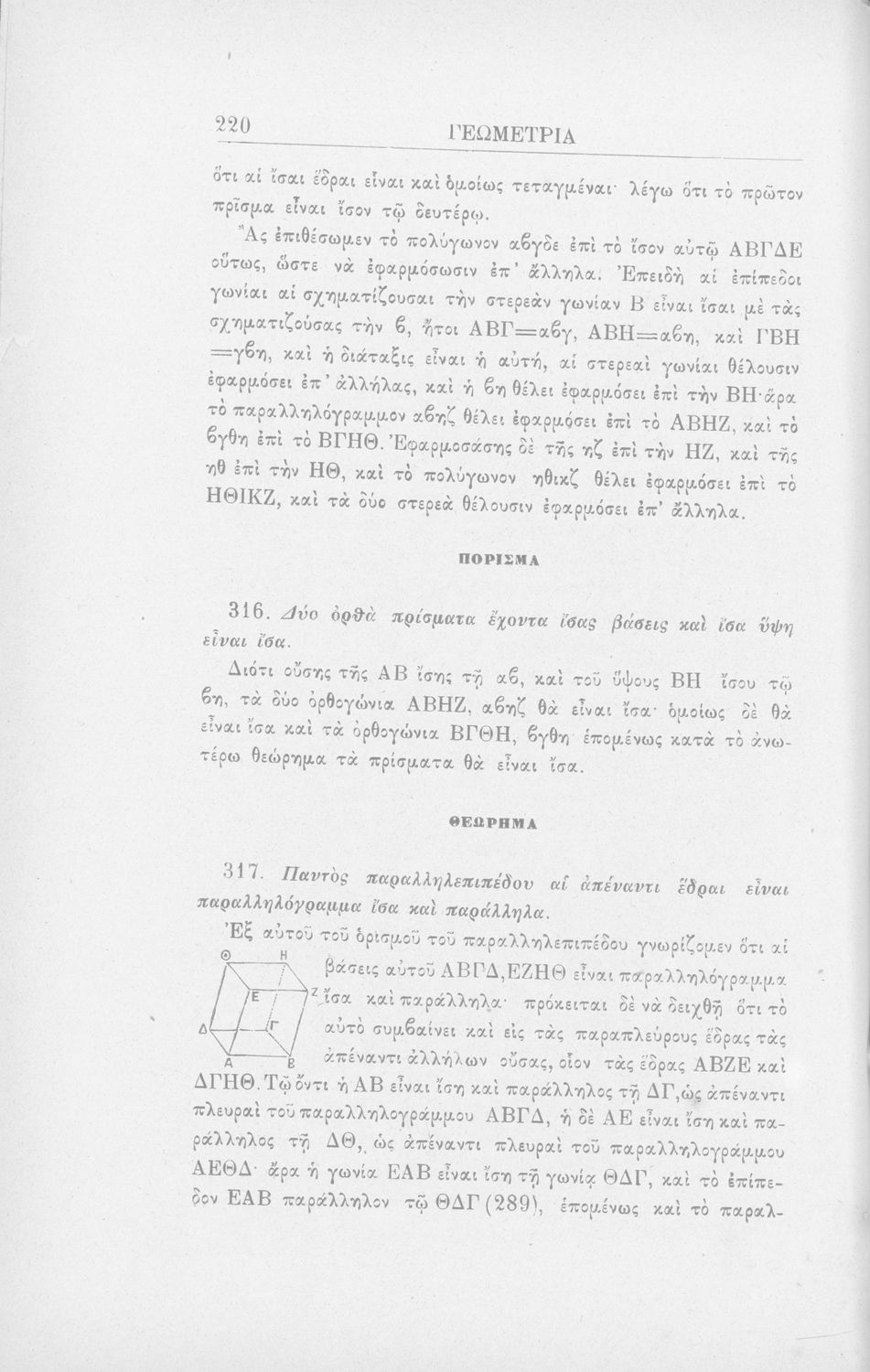 Σχολικό εγχειρίδιο Γεωμετρίας που είναι χωρισμένο σε αξιώματα, θεωρήματα και πορίσματα και εστιάζει στην Επίπεδη Γεωμετρία και τη Στερεομετρία.