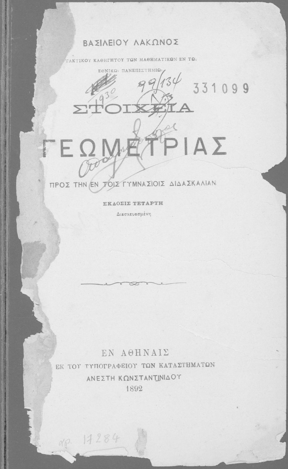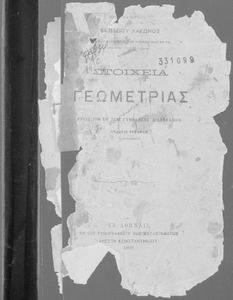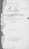 Βαθμίδα εκπαίδευσης: Δευτεροβάθμια Τάξη: Γυμνάσιο Μάθημα: Μαθηματικά Γλώσσα: Καθαρεύουσα Παρουσίαση περιεχομένου: Σχολικό εγχειρίδιο Γεωμετρίας που είναι χωρισμένο σε αξιώματα, θεωρήματα και πορίσματα και εστιάζει στην Επίπεδη Γεωμετρία και τη Στερεομετρία. |