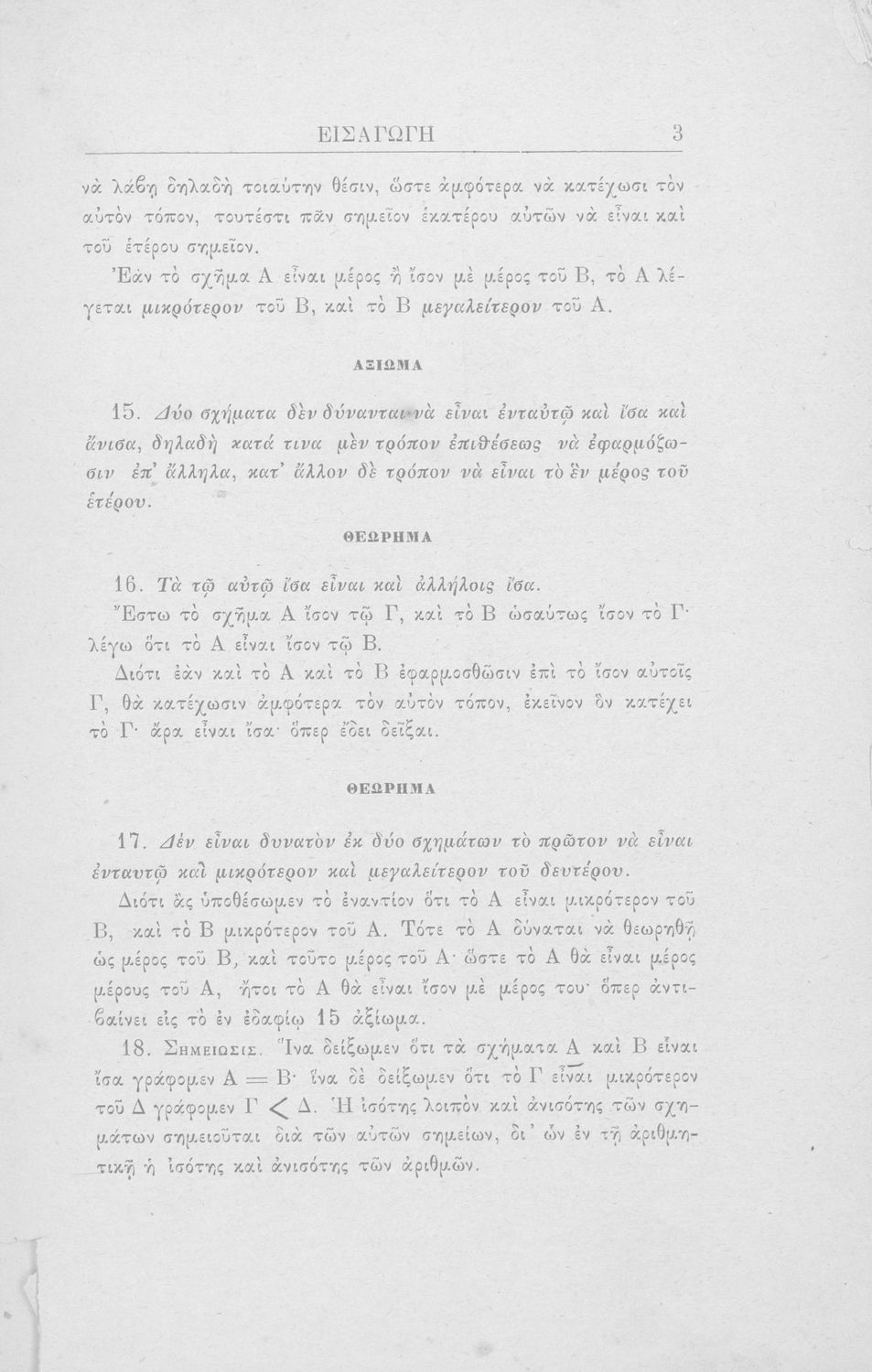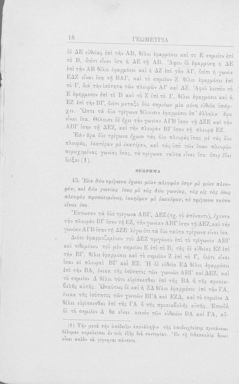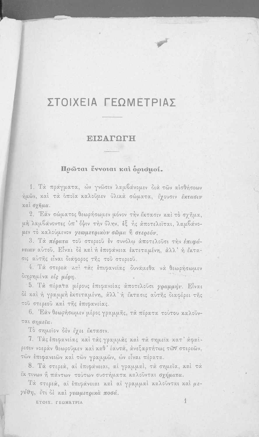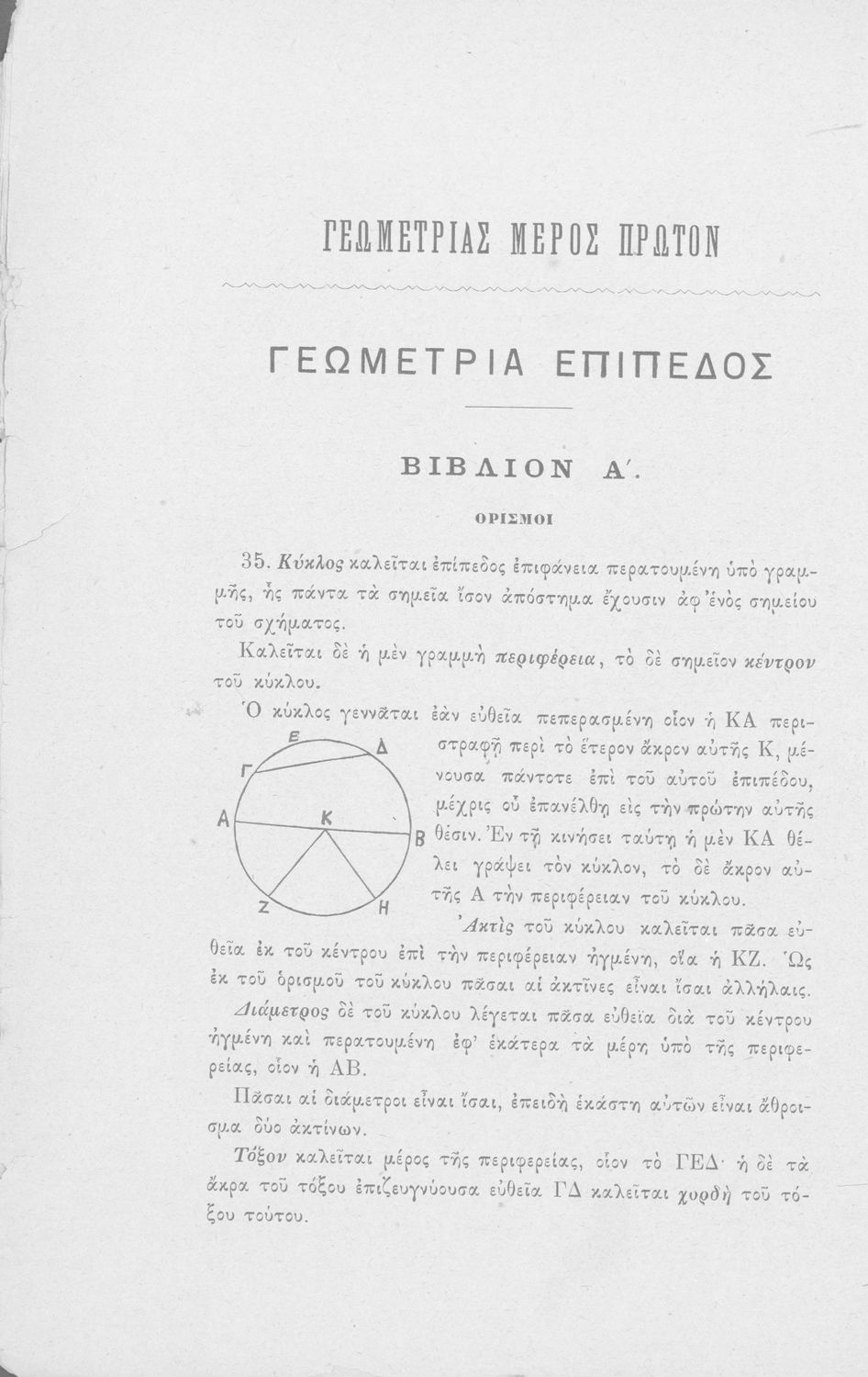 Σχολικό εγχειρίδιο Γεωμετρίας που είναι χωρισμένο σε αξιώματα, θεωρήματα και πορίσματα και εστιάζει στην Επίπεδη Γεωμετρία και τη Στερεομετρία.