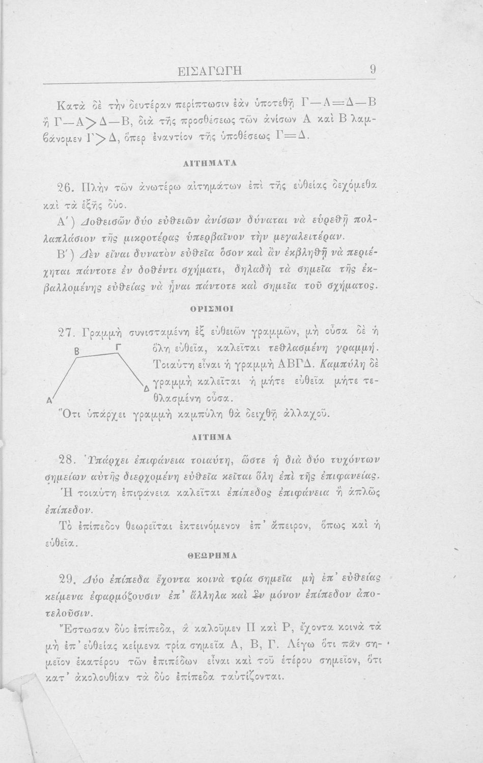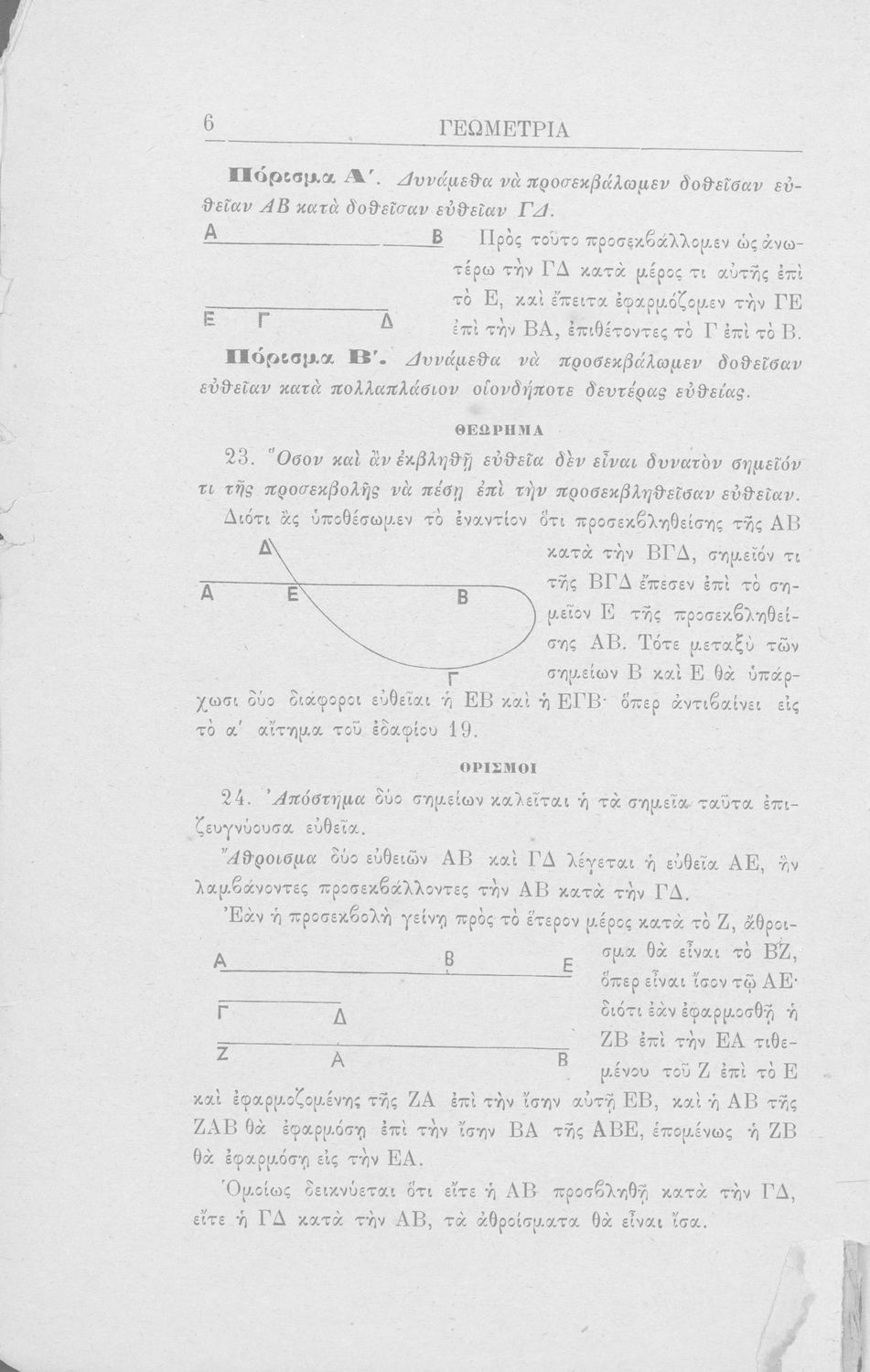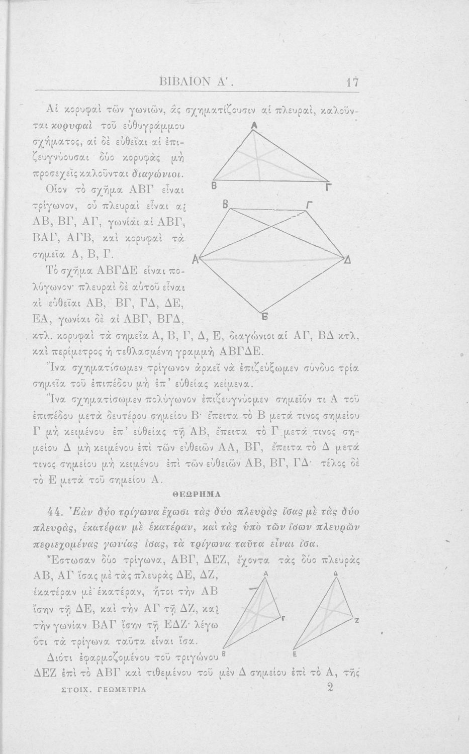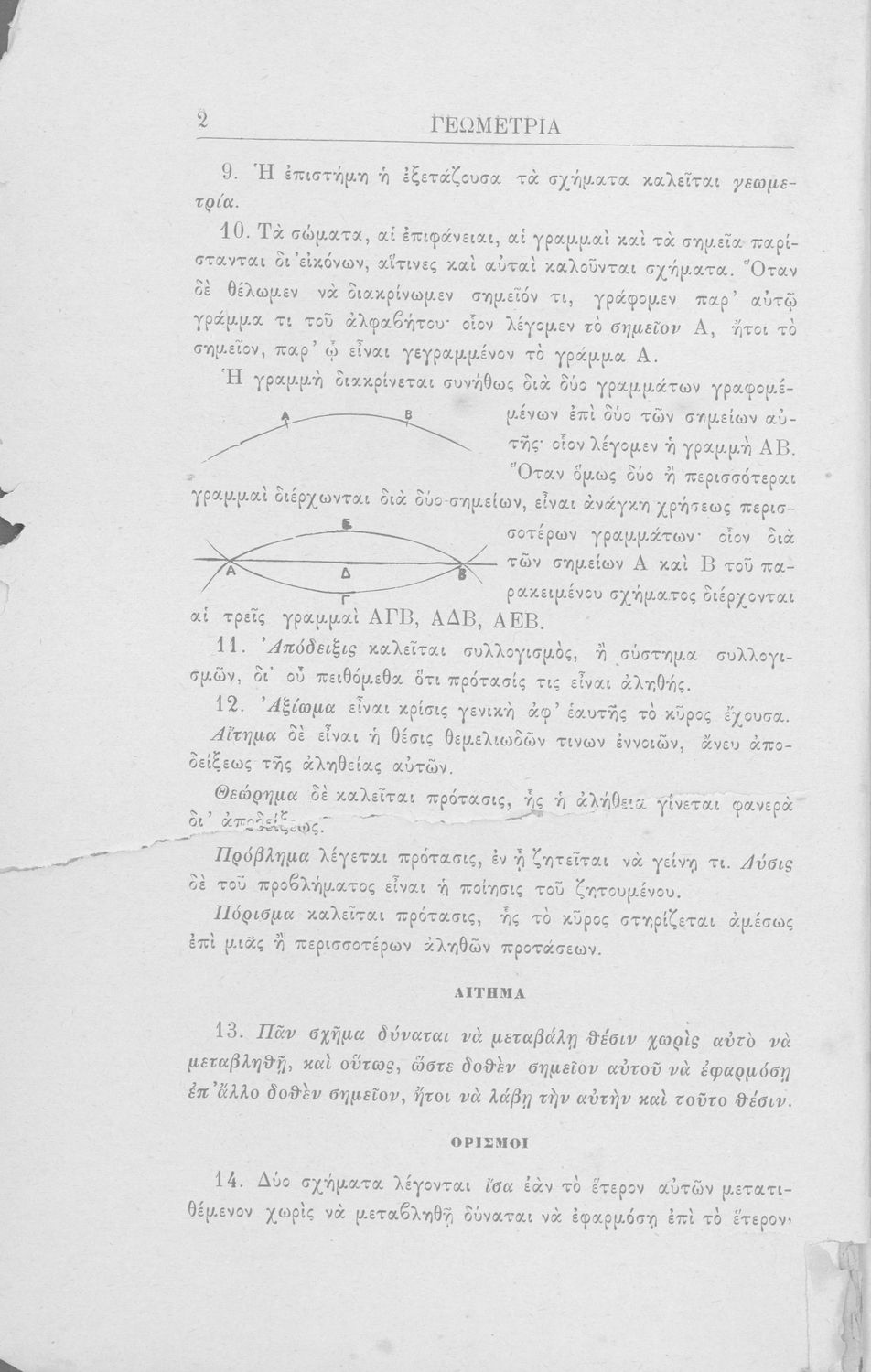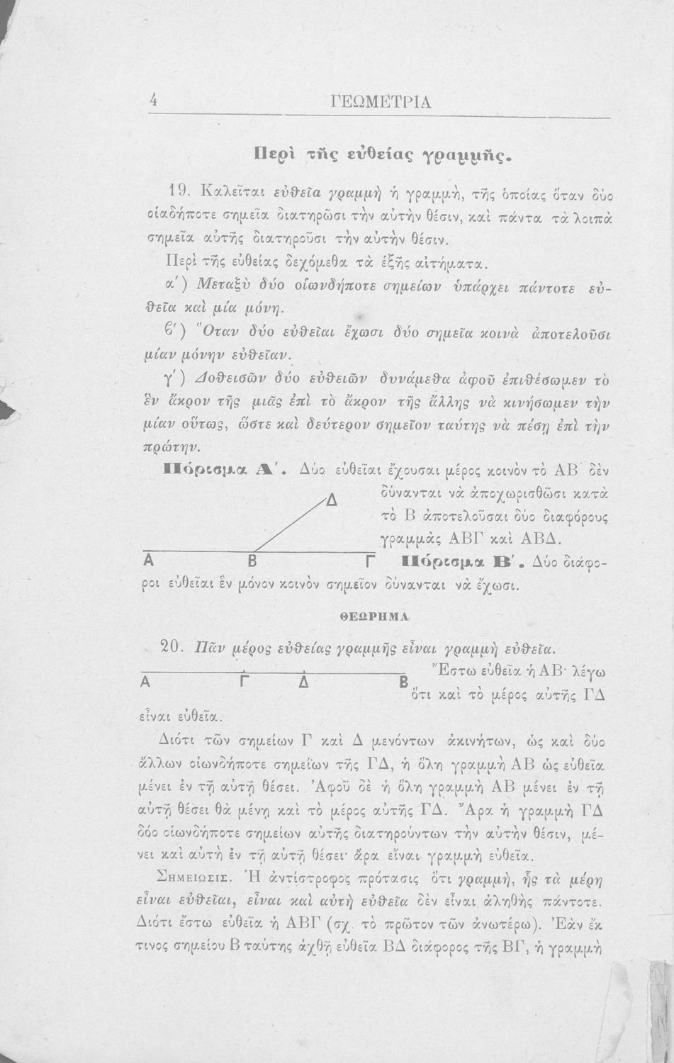 Σχολικό εγχειρίδιο Γεωμετρίας που είναι χωρισμένο σε αξιώματα, θεωρήματα και πορίσματα και εστιάζει στην Επίπεδη Γεωμετρία και τη Στερεομετρία.