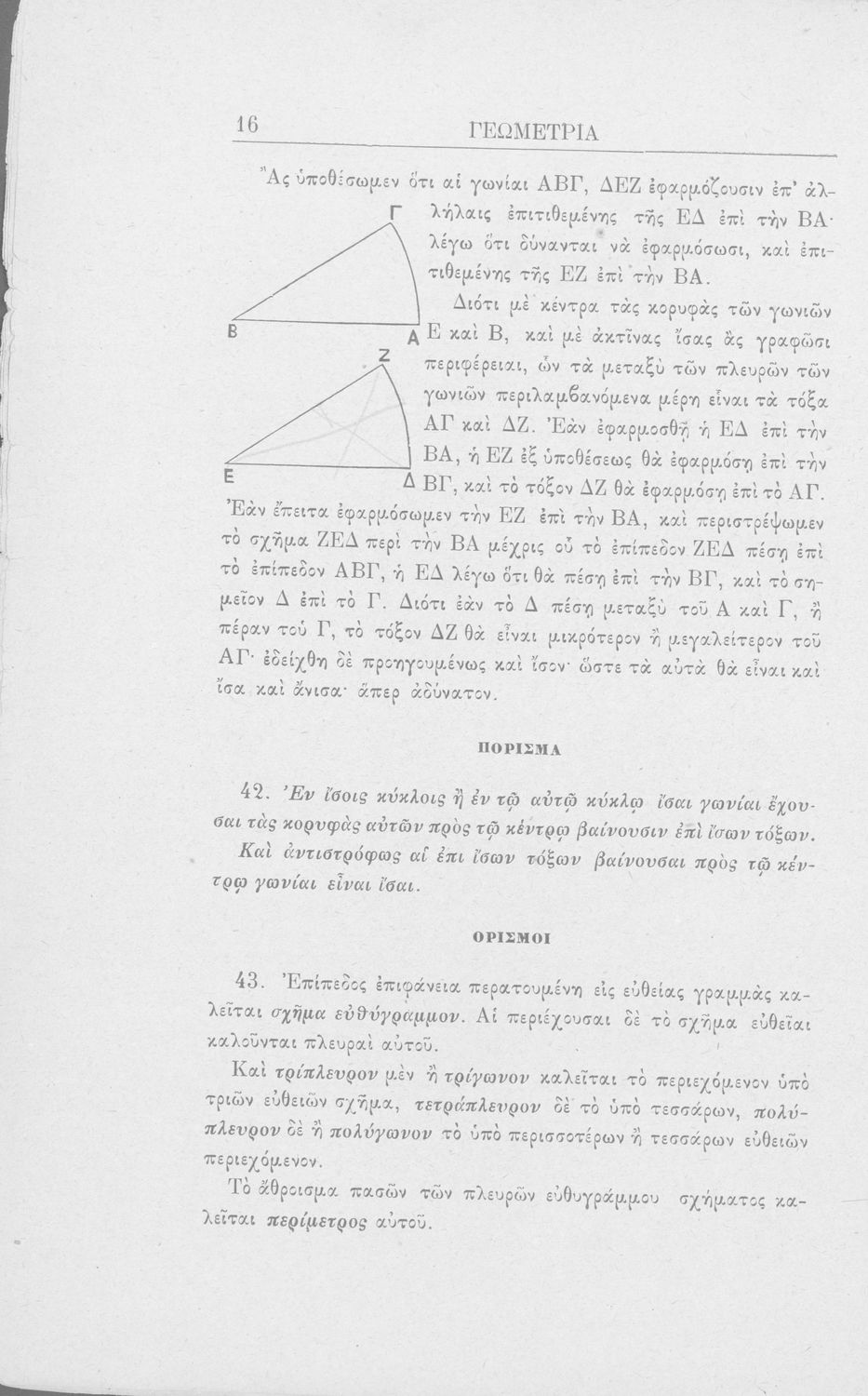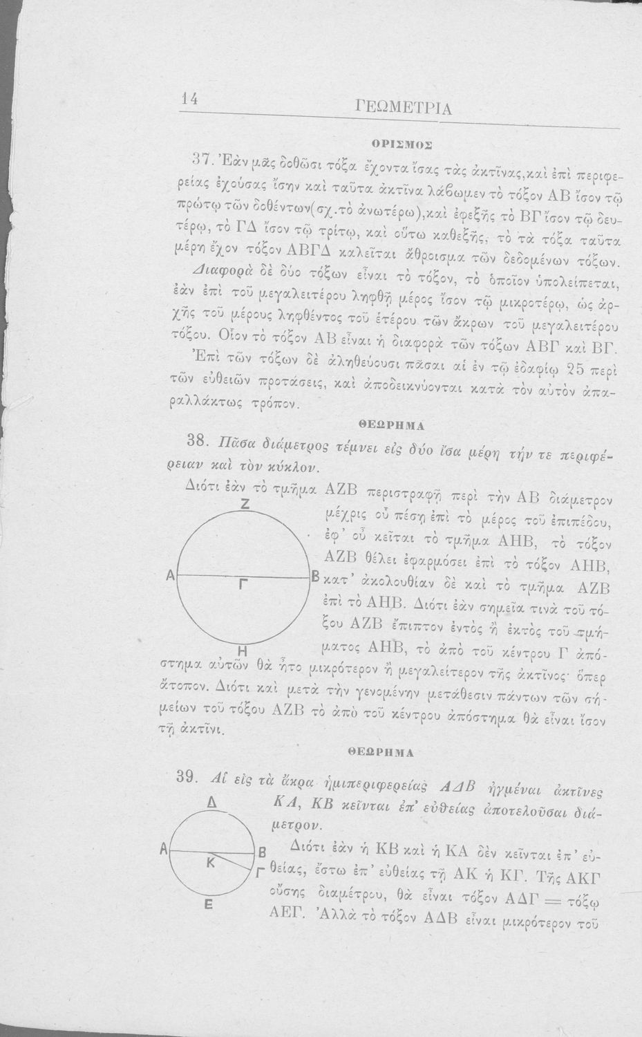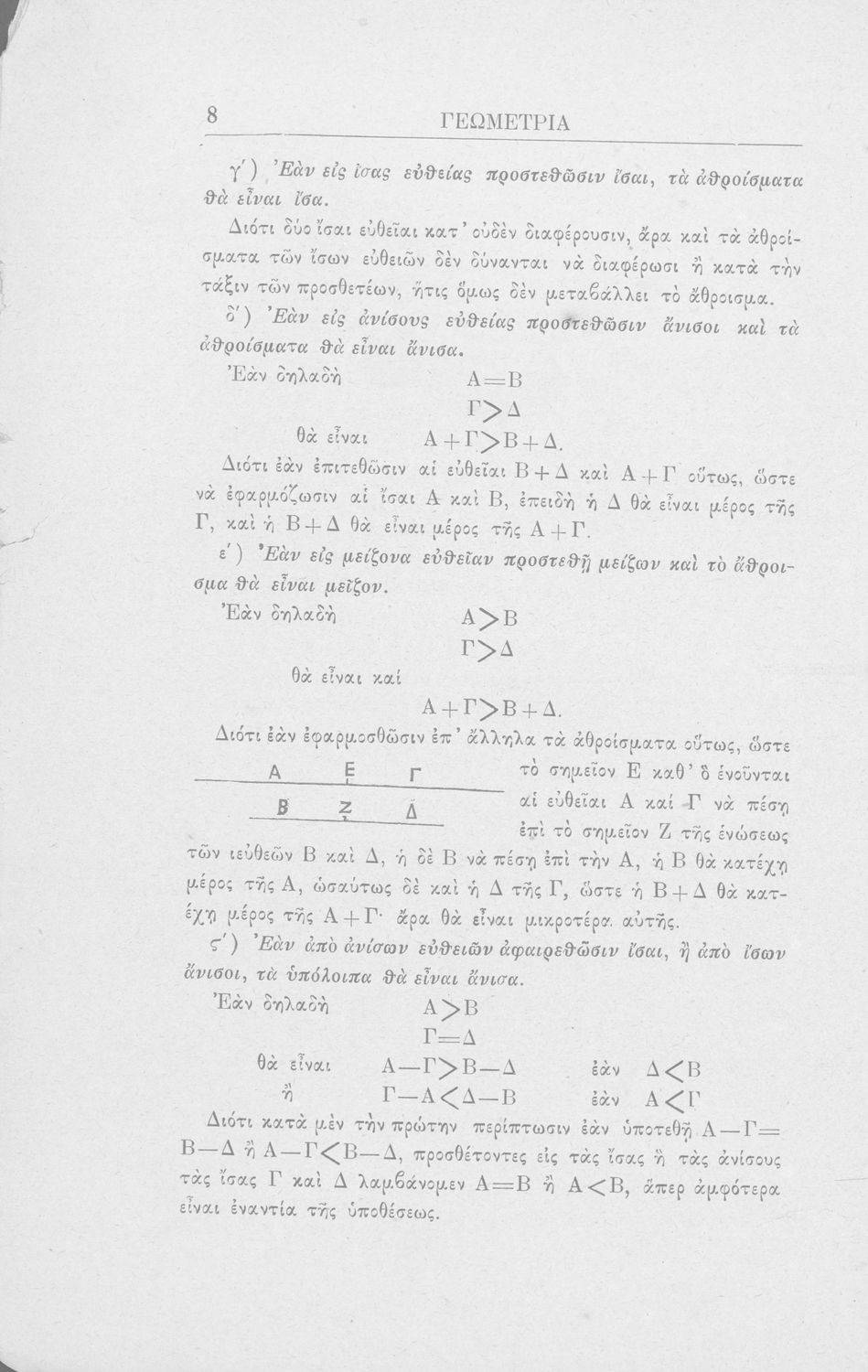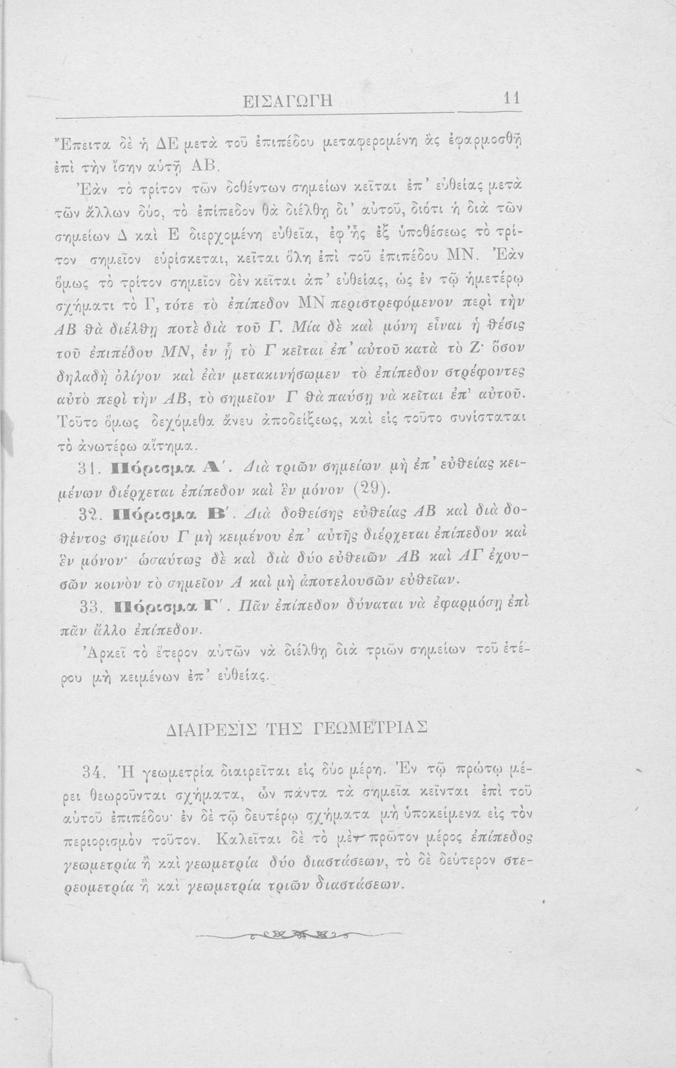 Σχολικό εγχειρίδιο Γεωμετρίας που είναι χωρισμένο σε αξιώματα, θεωρήματα και πορίσματα και εστιάζει στην Επίπεδη Γεωμετρία και τη Στερεομετρία.