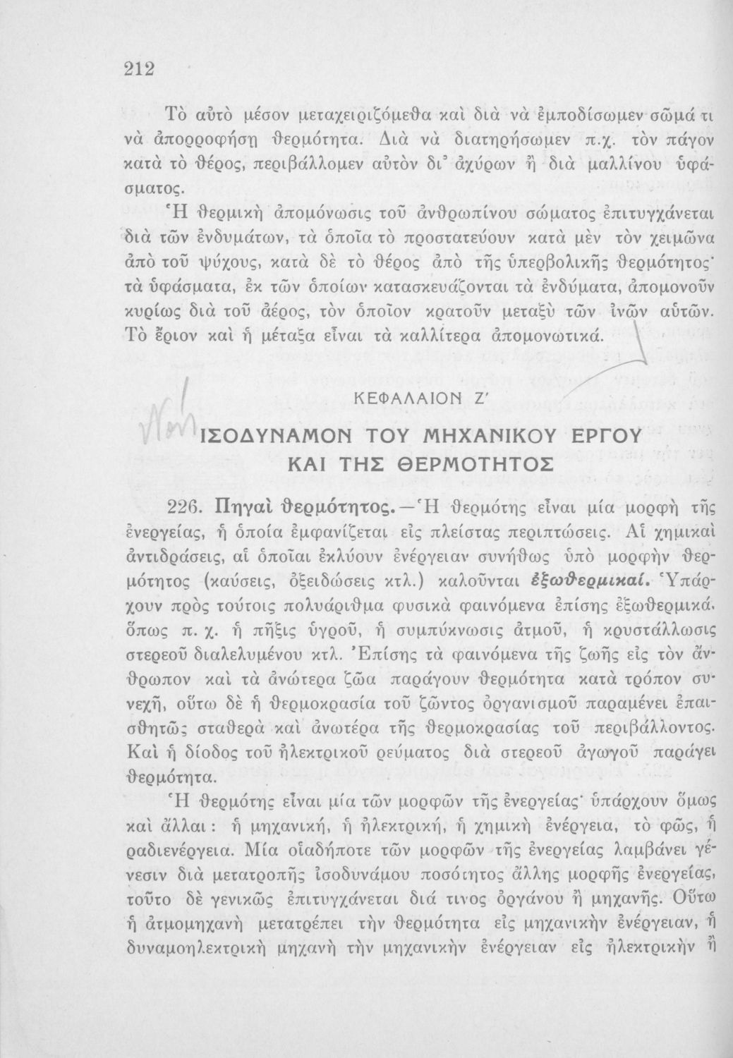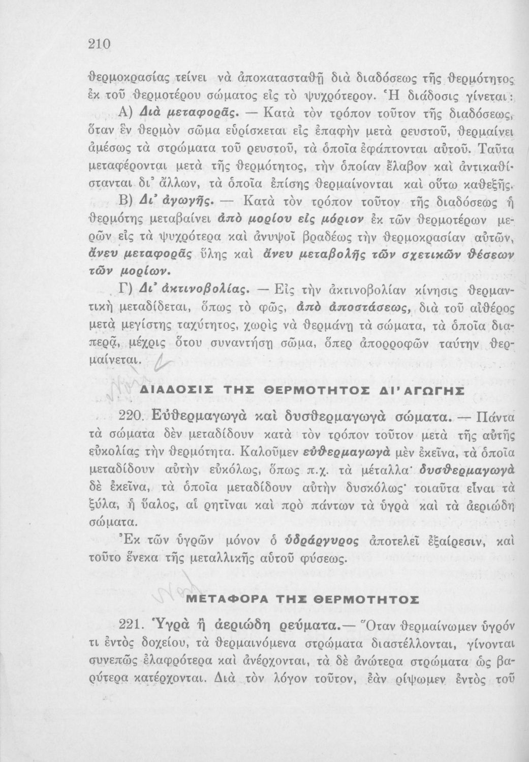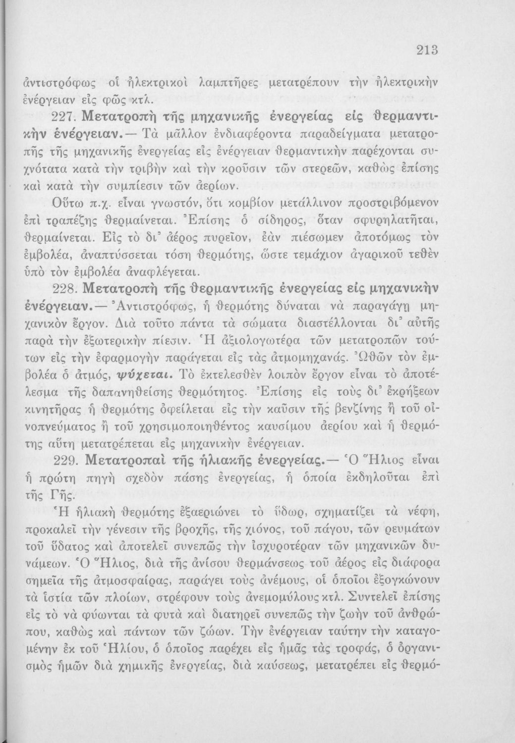 Σχολικό εγχειρίδιο της Ε΄ Τάξης των Γυμνασίων Παλαιού Τύπου για το μάθημα της Φυσικής. Παρέχει βασικές γνώσεις της Φυσικής επιστήμης. Αναλύει τα φαινόμενα της μηχανικής, της βαρύτητας, της υδροστατικής της αεροστατικής, της θερμότητας και τέλος της μετεωρολογίας. Αναφέρεται στην πρακτική εφαρμογή της φυσικής στην καθημερινότητά. Επίσης, περιλαμβάνει πολλά από τα όργανα, που χρησιμοποιούνται στη φυσική. Περιέχει εικόνες και σχεδιαγράμματα τα οποία βοηθούν τη διδασκαλία.