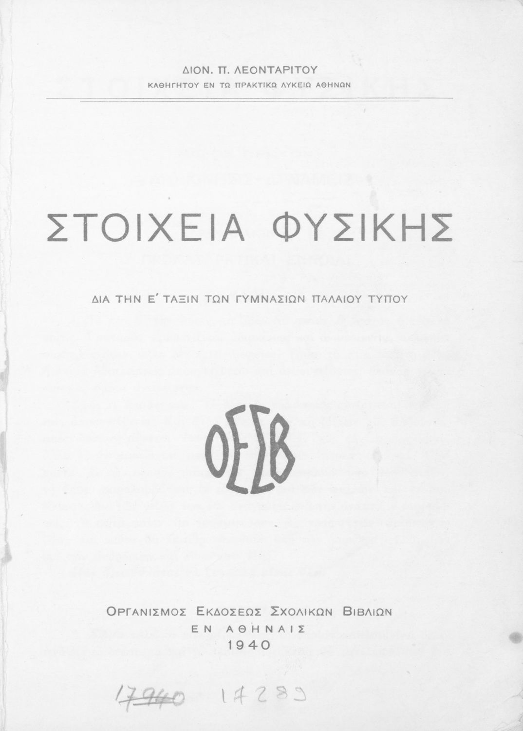 Κωδικός αναγνώρισης: 01-17289 Τίτλος: Στοιχεία Φυσικής δια την Ε΄ Τάξιν των Γυμνασίων Παλαιού Τύπου Συγγραφέας: Διον. Π. Λεονταρίτης Μέγεθος και υπόστρωμα: Σχολικό εγχειρίδιο, μαλακό εξώφυλλο, 272 σελίδες. Σκίτσα, σχεδιαγράμματα (ασπρόμαυρα). |