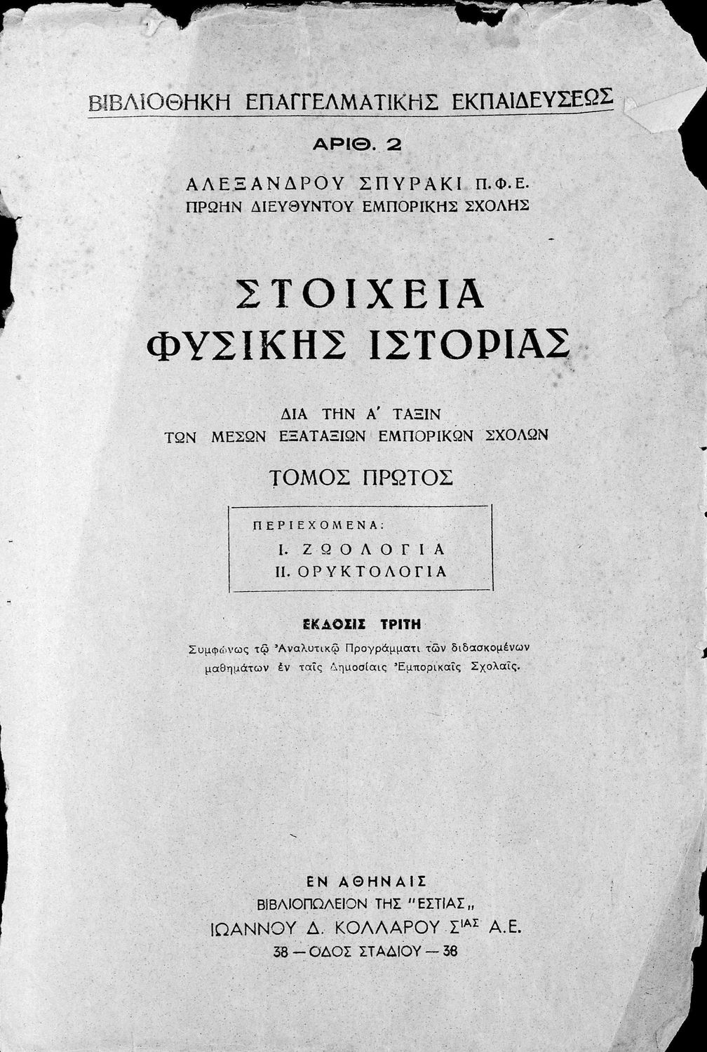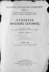 Τίτλος: Στοιχεία Φυσικής Ιστορίας δια την Α΄ Τάξιν των μέσων Εξαταξίων Εμπορικών Σχολών. Τόμος Πρώτος