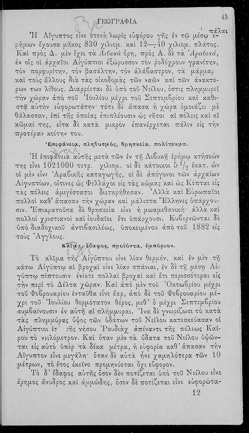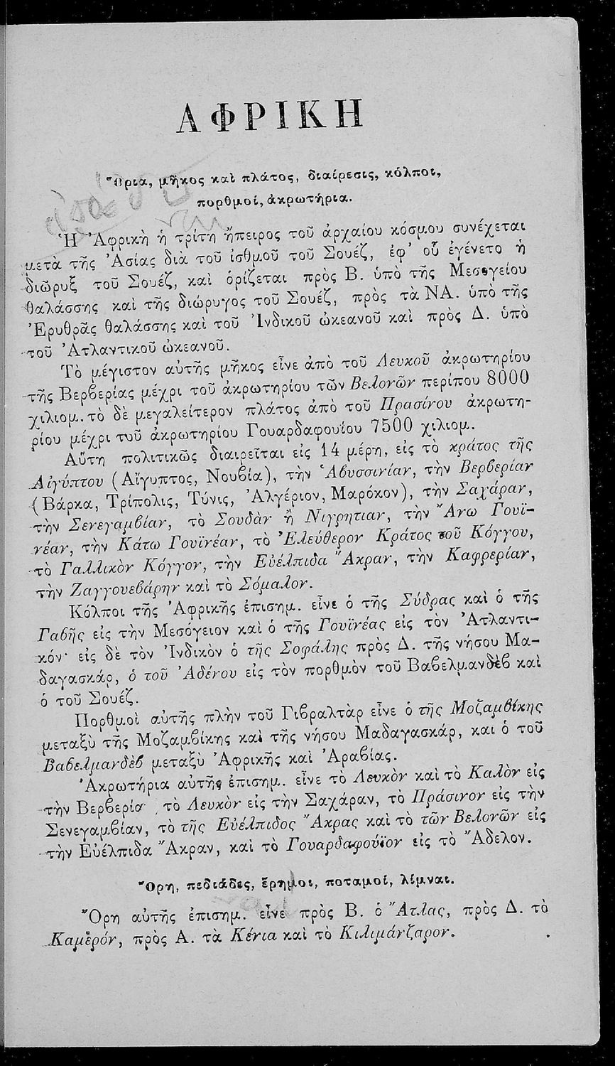 Σχολικό εγχειρίδιο Γεωγραφίας για τα Ελληνικά Σχολεία που περιλαμβάνει εισαγωγή στις βασικές έννοιες και ορισμούς της επιστήμης, και στοιχεία μαθηματικής, φυσικής και πολιτικής γεωγραφίας των πέντε ηπείρων.