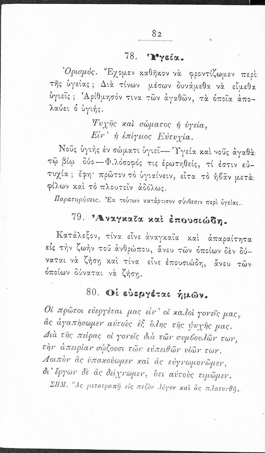 Σχολικό εγχειρίδιο Αρχαίων Ελληνικών για τα Ελληνικά Σχολεία, Παρθεναγωγεία και Γυμνάσια που περιέχει τους κανόνες γραμματικής και είναι χωρισμένο σε φθογγολογικό, τυπολογικό και ετυμολογικό μέρος.