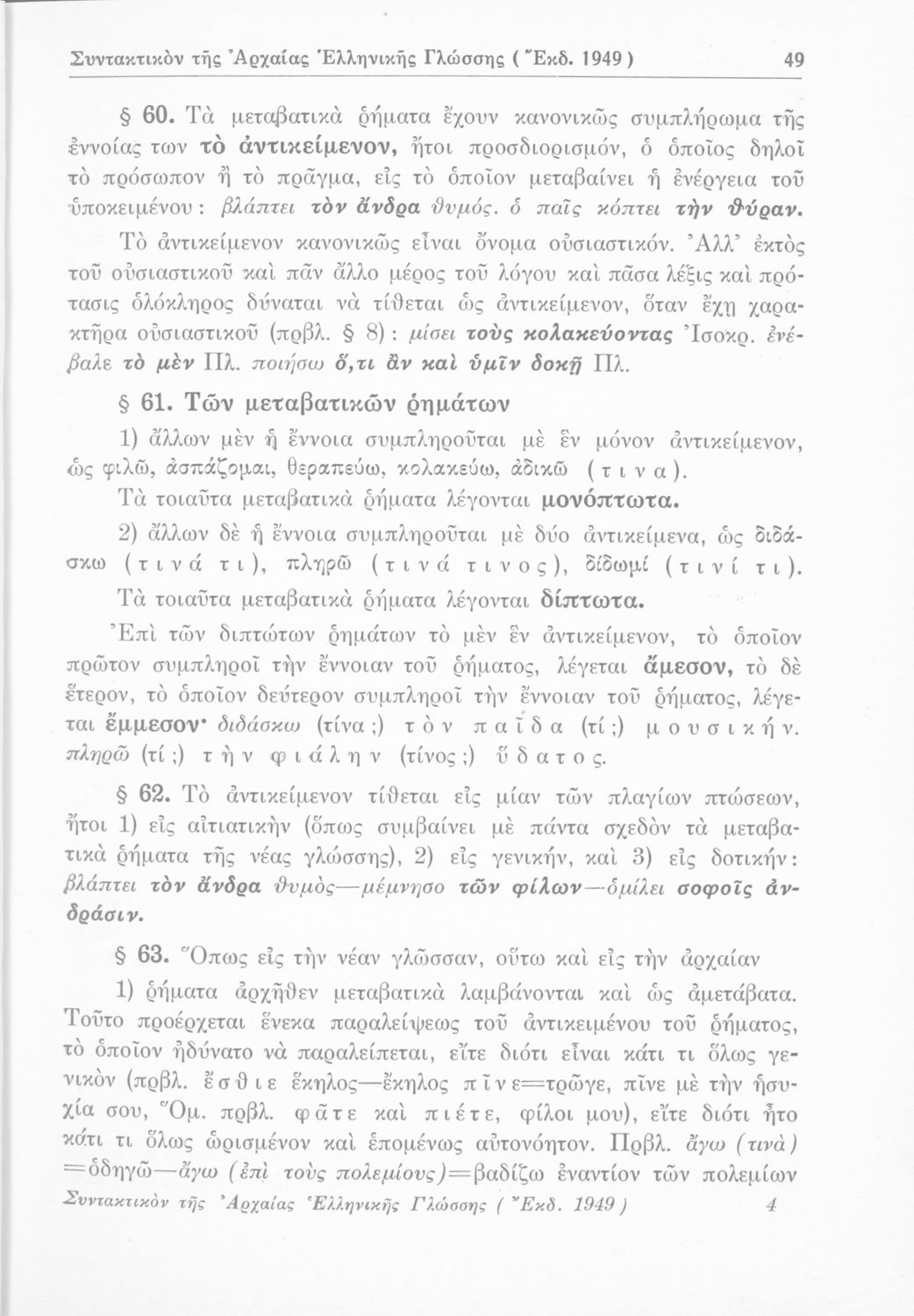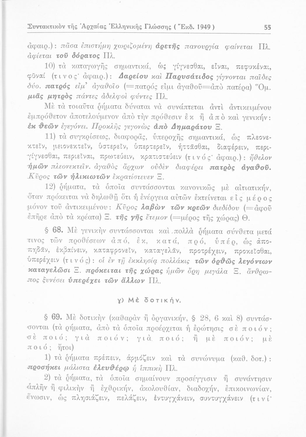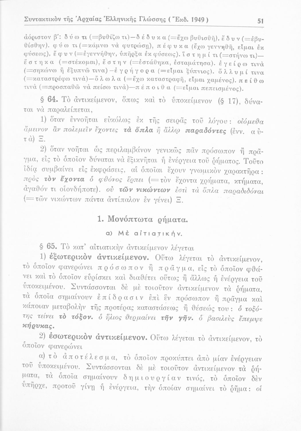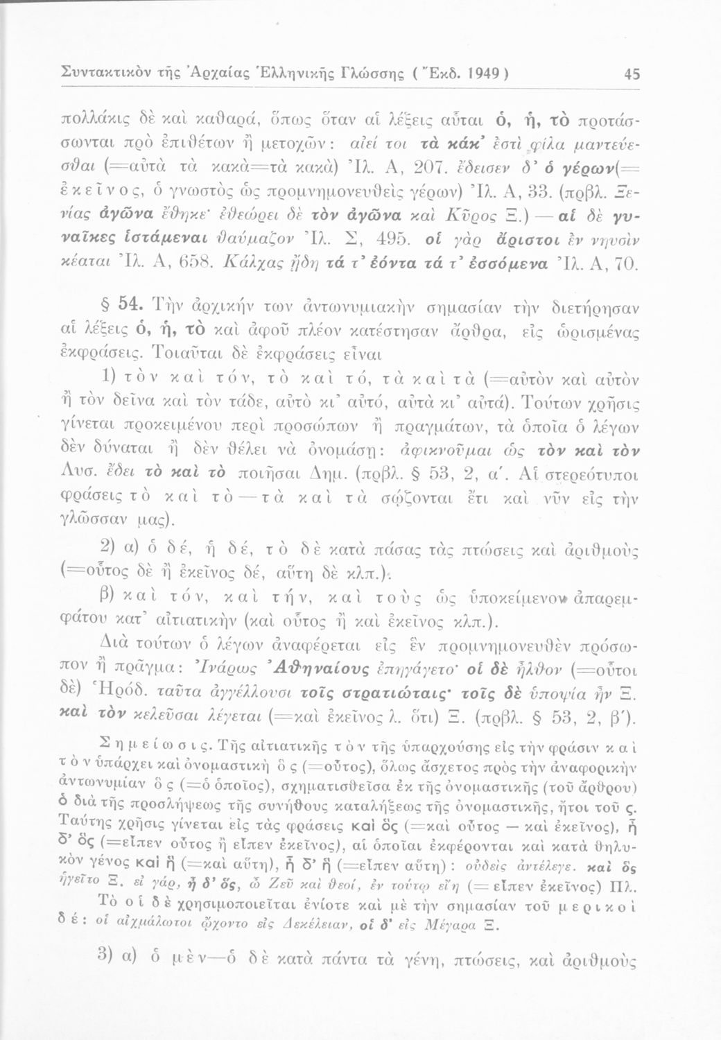 Σχολικό εγχειρίδιο Αρχαίων Ελληνικών Γυμνασίου που εξετάζει τα μέρη του λόγου και την σύνταξή τους.
