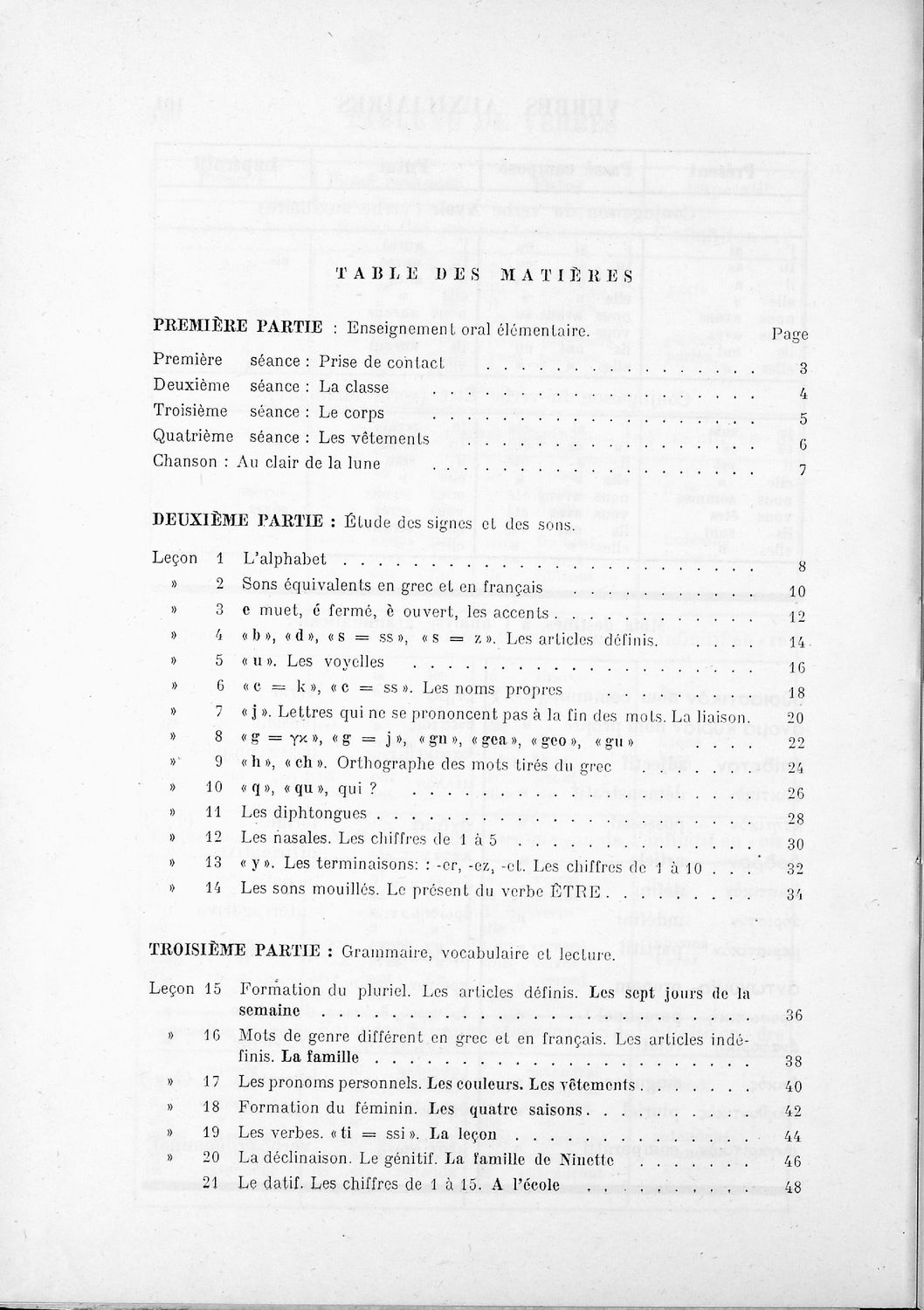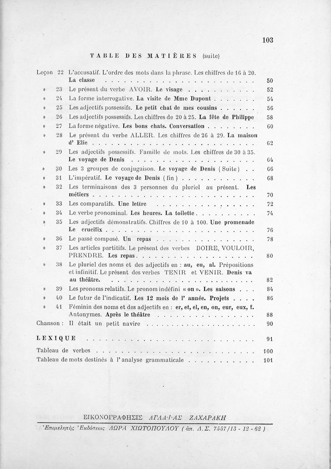 Σχολικό εγχειρίδιο Γαλλικών για τα Ελληνικά Σχολεία που περιέχει τους βασικούς κανόνες γραμματικής της γαλλικής γλώσσας καθώς και σειρά ασκήσεων για πρακτική εξάσκηση των μαθητών. Περιλαμβάνεται και λεξιλόγιο.