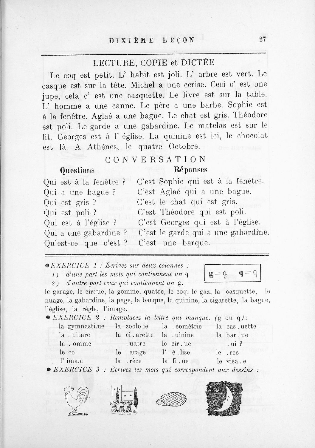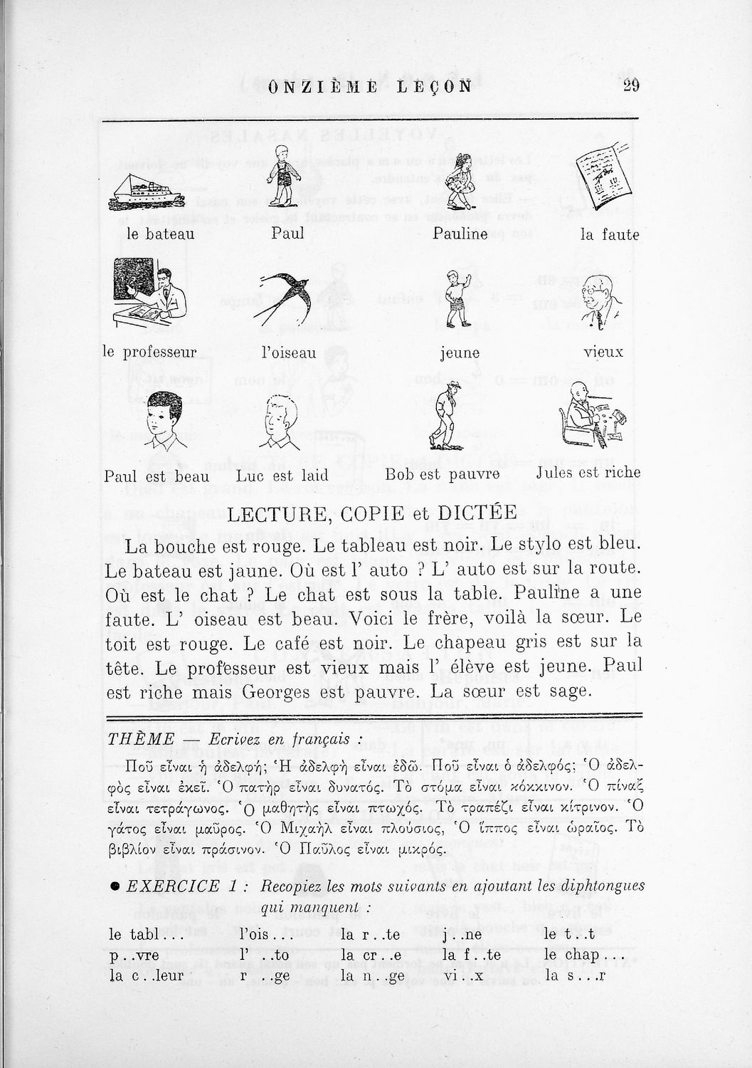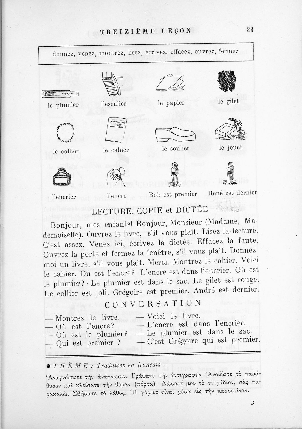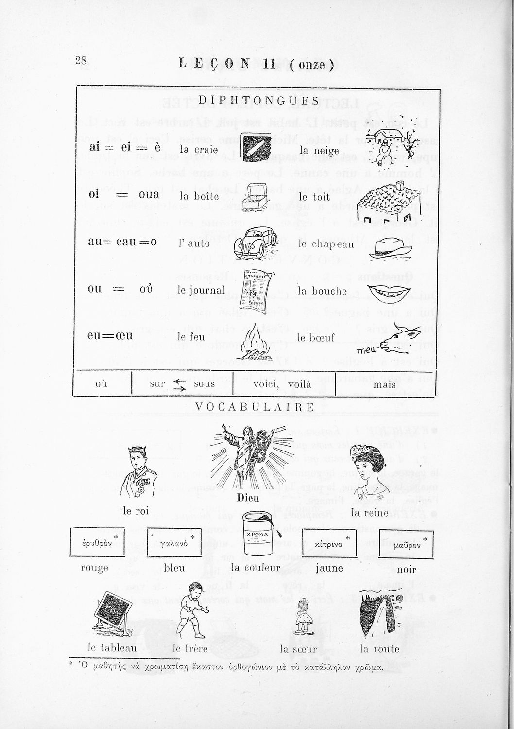 Κωδικός αναγνώρισης: 01-17302 Τίτλος: Cours de langue francaise Συγγραφέας: Gisele Vivier, Paul Scarpetis, Δώρα Χιωτοπούλου (επιμέλεια) Εικονογράφος: Αγλαΐα Ζαχαράκη Μέγεθος και υπόστρωμα: Σχολικό εγχειρίδιο, 24εκ., σκληρό εξώφυλλο, 103 σελίδες. Σκίτσα (ασπρόμαυρα). |