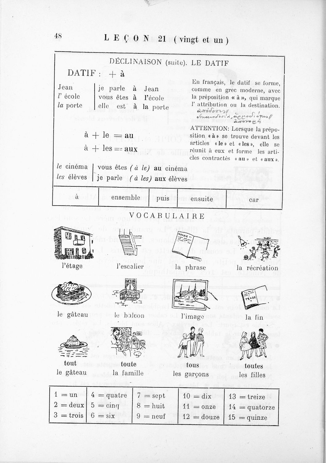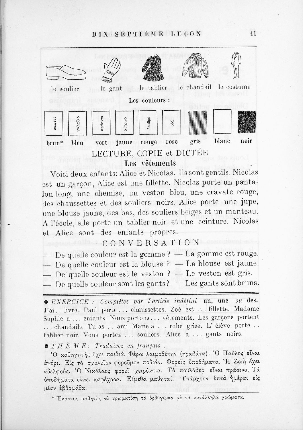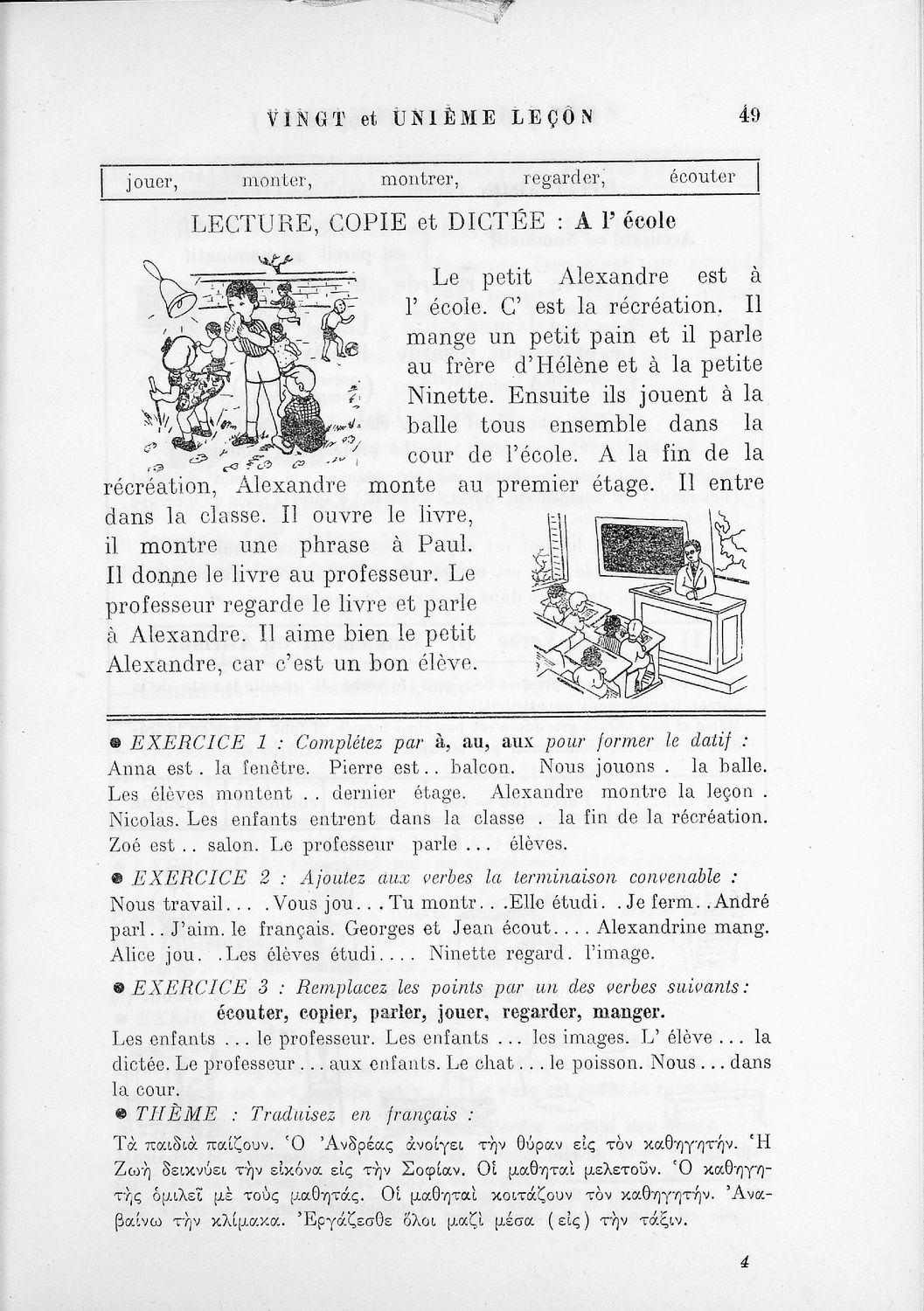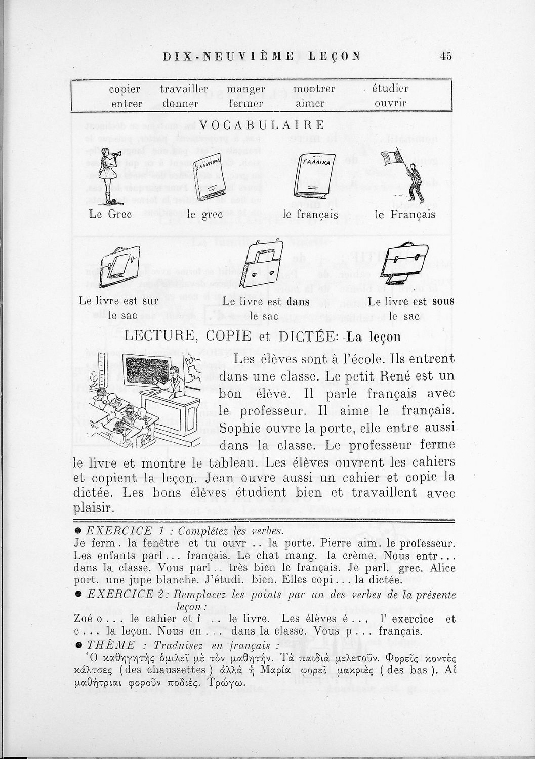Σχολικό εγχειρίδιο Γαλλικών για τα Ελληνικά Σχολεία που περιέχει τους βασικούς κανόνες γραμματικής της γαλλικής γλώσσας καθώς και σειρά ασκήσεων για πρακτική εξάσκηση των μαθητών. Περιλαμβάνεται και λεξιλόγιο.