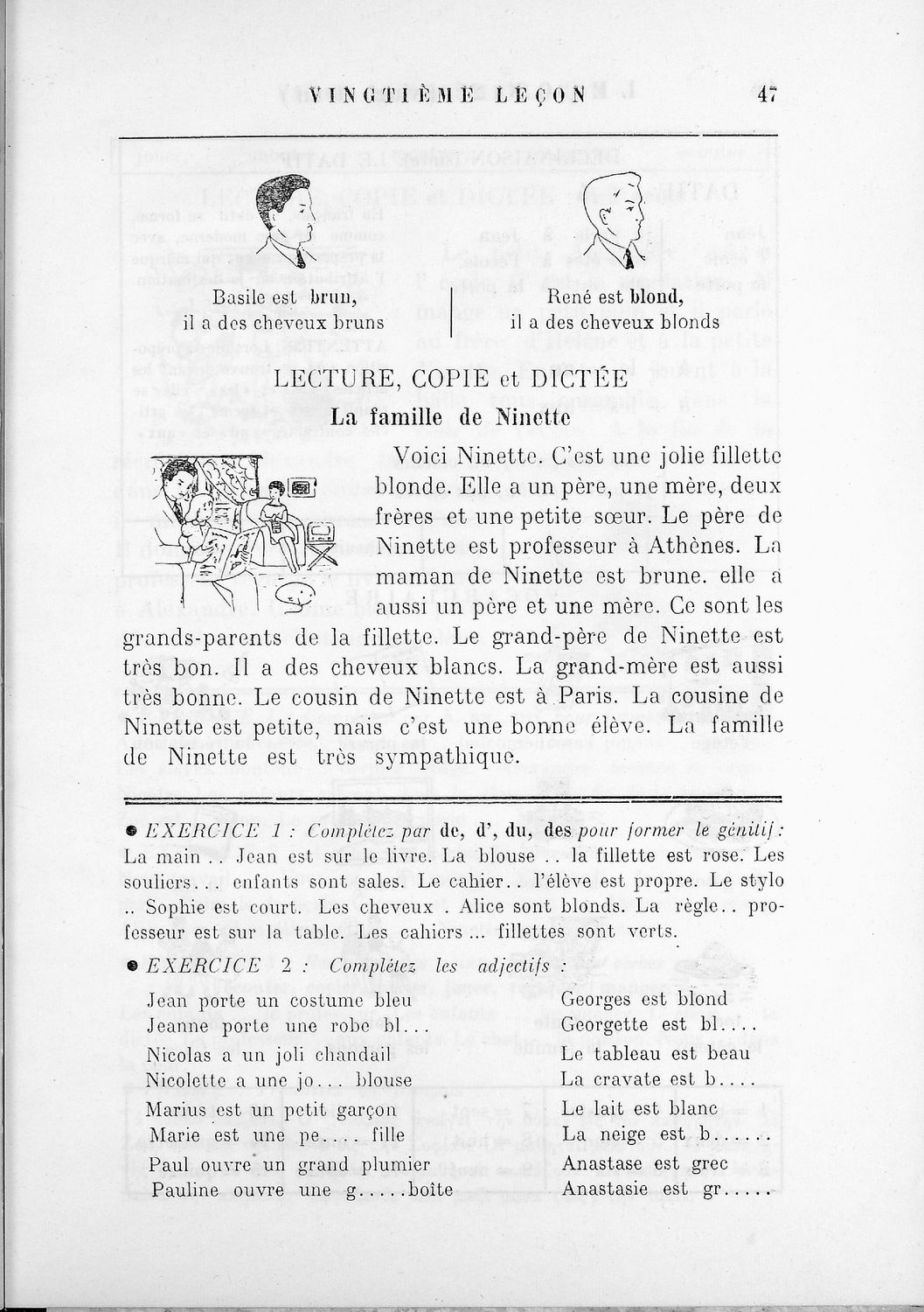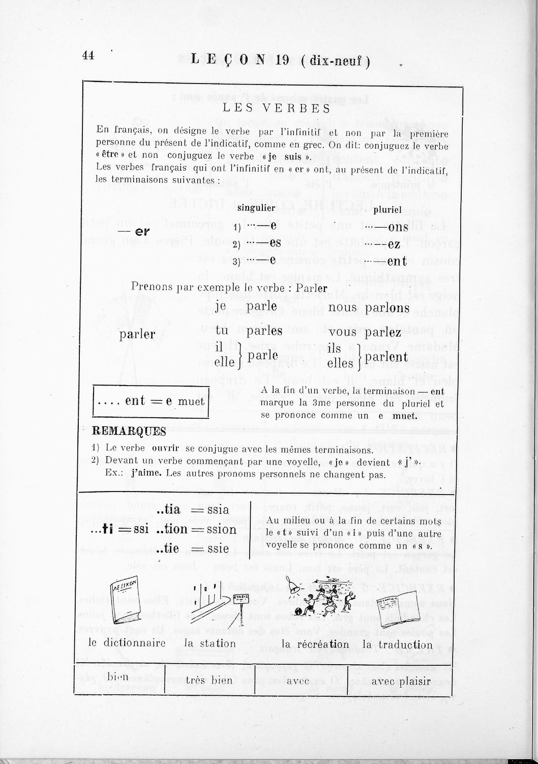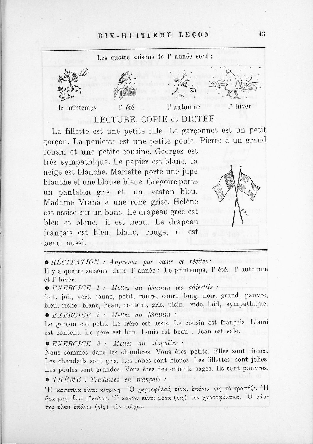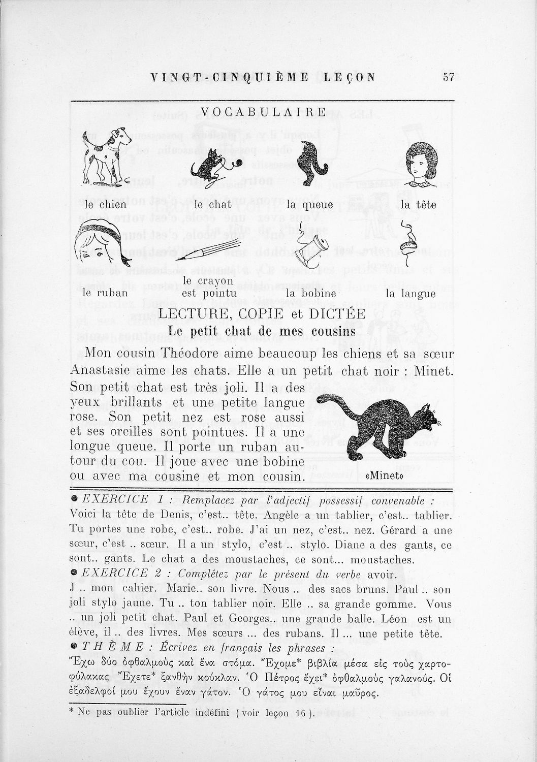 Σχολικό εγχειρίδιο Γαλλικών για τα Ελληνικά Σχολεία που περιέχει τους βασικούς κανόνες γραμματικής της γαλλικής γλώσσας καθώς και σειρά ασκήσεων για πρακτική εξάσκηση των μαθητών. Περιλαμβάνεται και λεξιλόγιο.