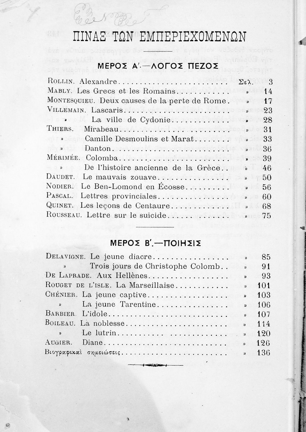 Σχολικό εγχειρίδιο Γαλλικής γλώσσας των τάξεων της Γ΄ Γυμνάσιου, Β΄ Διδασκαλείου Θηλέων και Α' Διδασκαλείου Αρρένων που περιέχει σειρά ποιημάτων και πεζών Γάλλων συγγραφέων, σύντομα βιογραφικά σημειώματα, ...