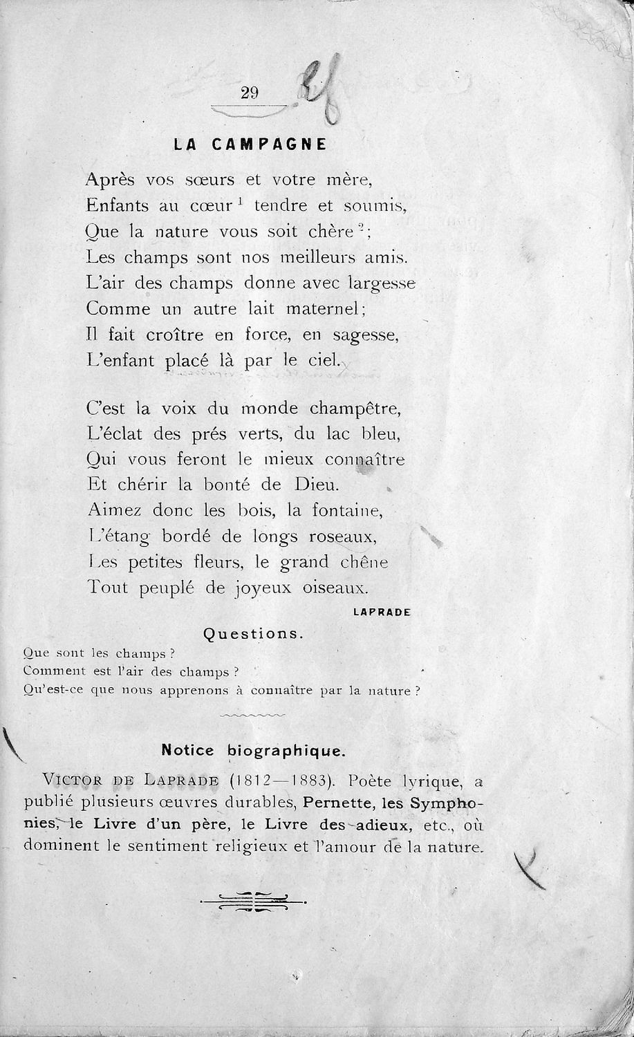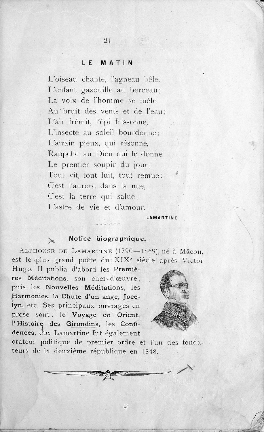 Σχολικό εγχειρίδιο Γαλλικής γλώσσας των τάξεων της Γ΄ Γυμνάσιου, Β΄ Διδασκαλείου Θηλέων και Α' Διδασκαλείου Αρρένων που περιέχει σειρά ποιημάτων και πεζών Γάλλων συγγραφέων, σύντομα βιογραφικά σημειώματα, ...