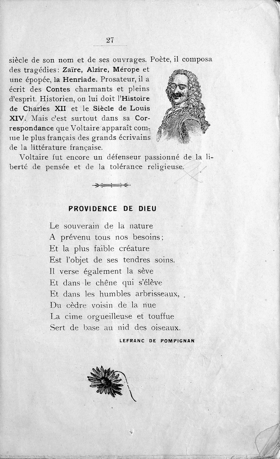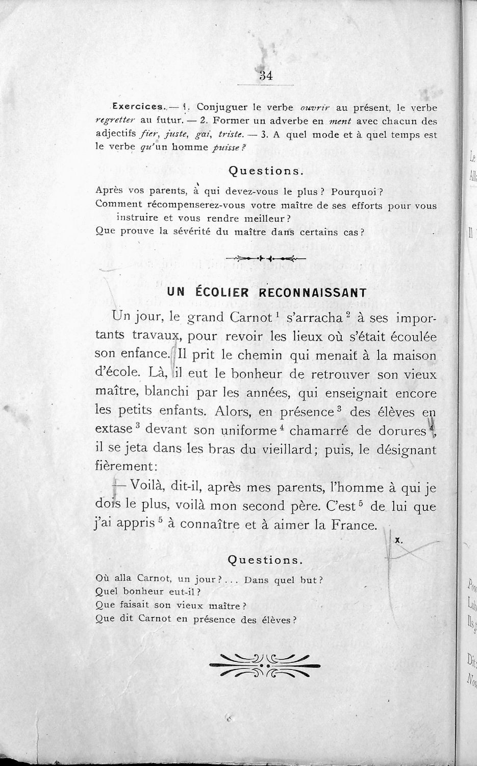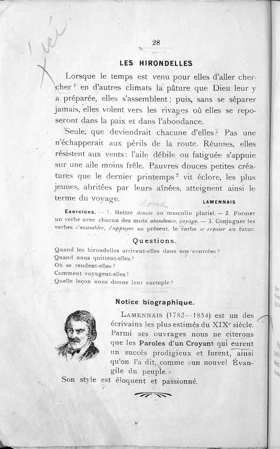 Σχολικό εγχειρίδιο Γαλλικών για τις Γ΄ Γυμνάσιου, Β΄ Διδασκαλείου Θηλέων και Α' Διδασκαλείου Αρρένων που περιέχει αποσπάσματα έργων Γάλλων συγγραφέων, και γλωσσικά και ερμηνευτικά σχόλια.