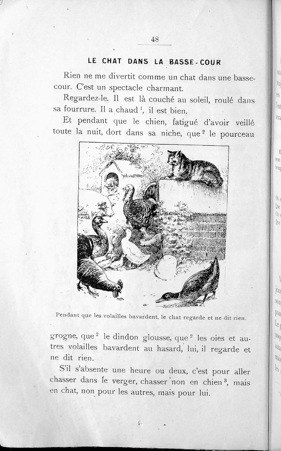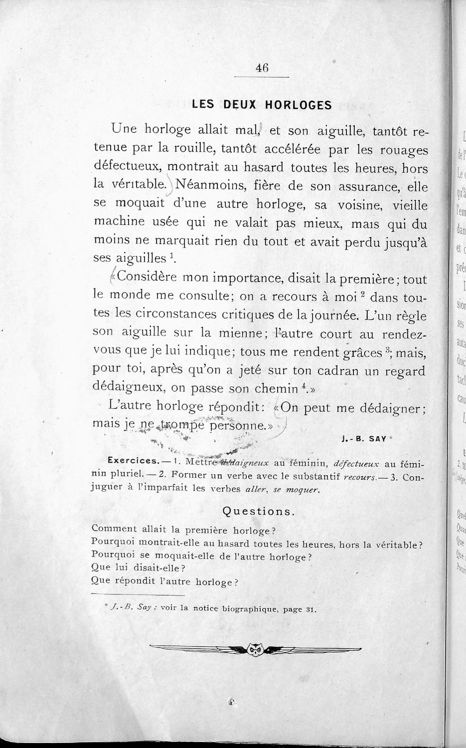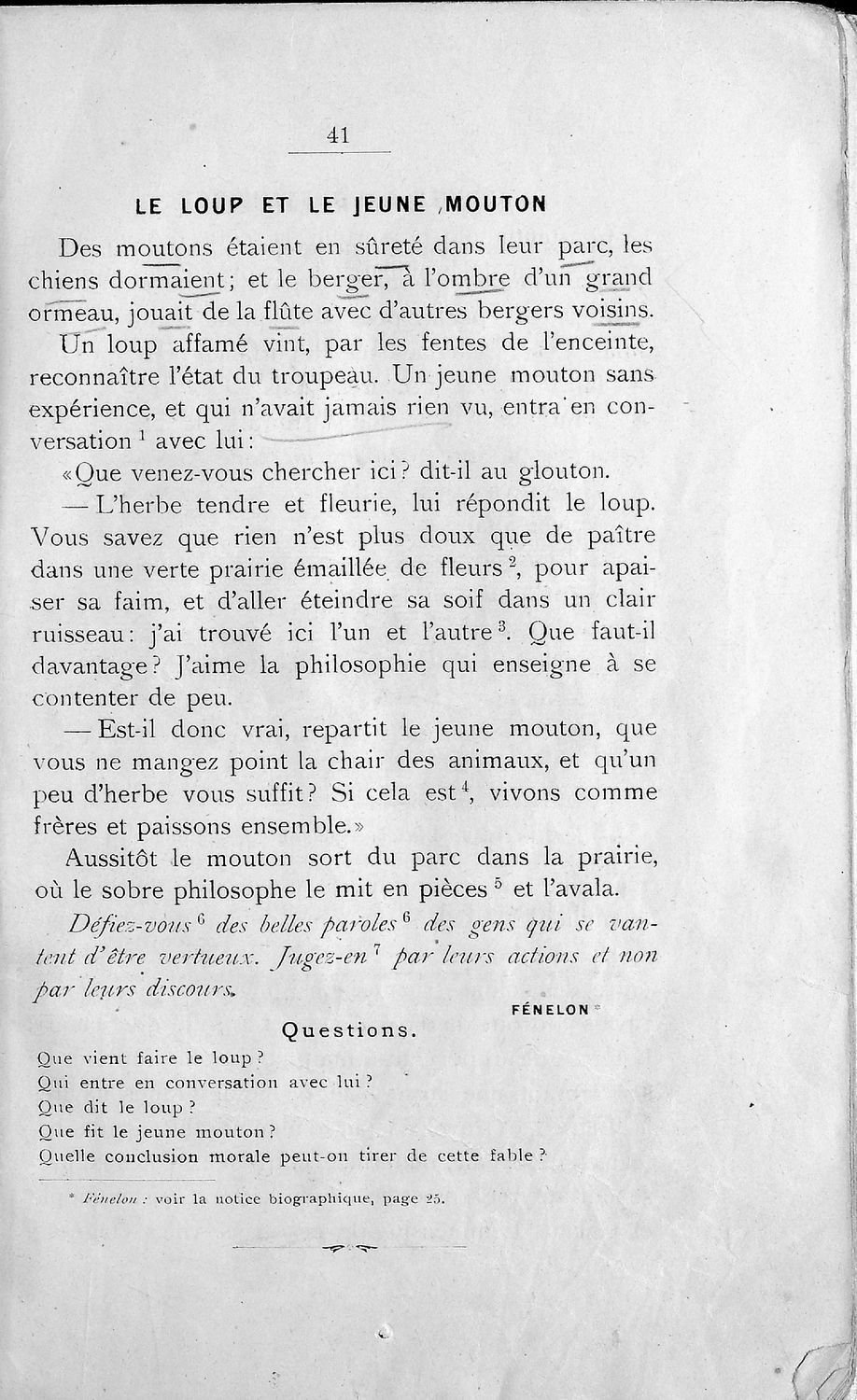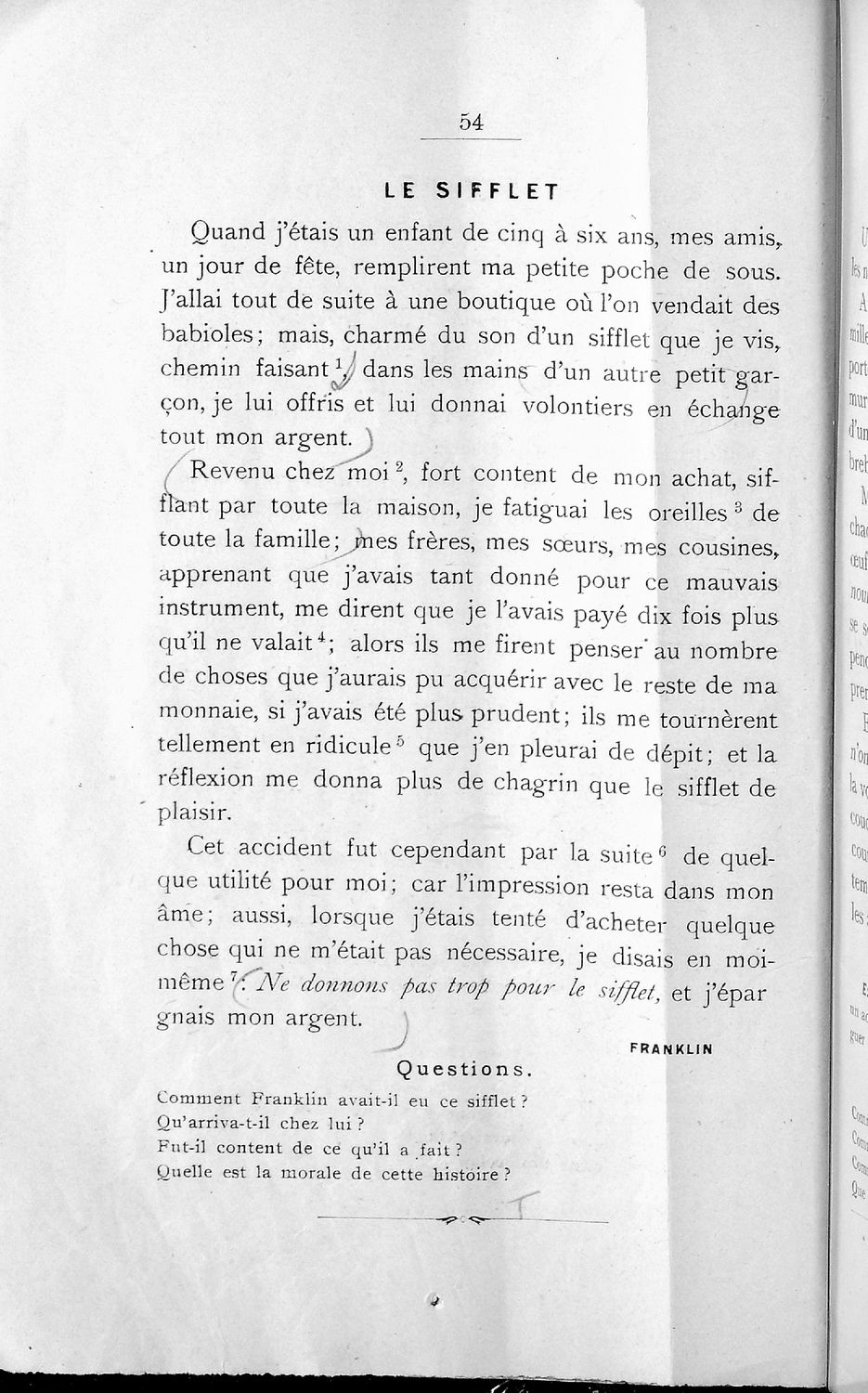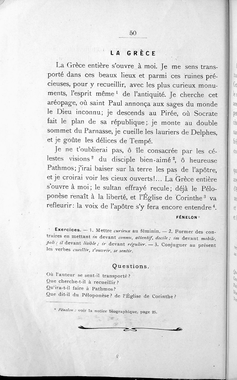 Σχολικό εγχειρίδιο Γαλλικών για τις Γ΄ Γυμνάσιου, Β΄ Διδασκαλείου Θηλέων και Α' Διδασκαλείου Αρρένων που περιέχει αποσπάσματα έργων Γάλλων συγγραφέων, και γλωσσικά και ερμηνευτικά σχόλια.