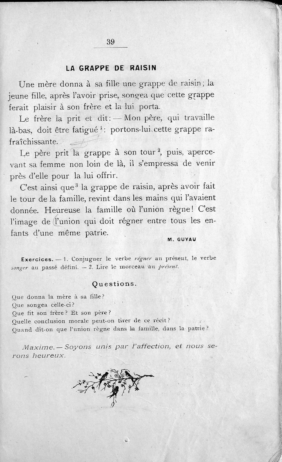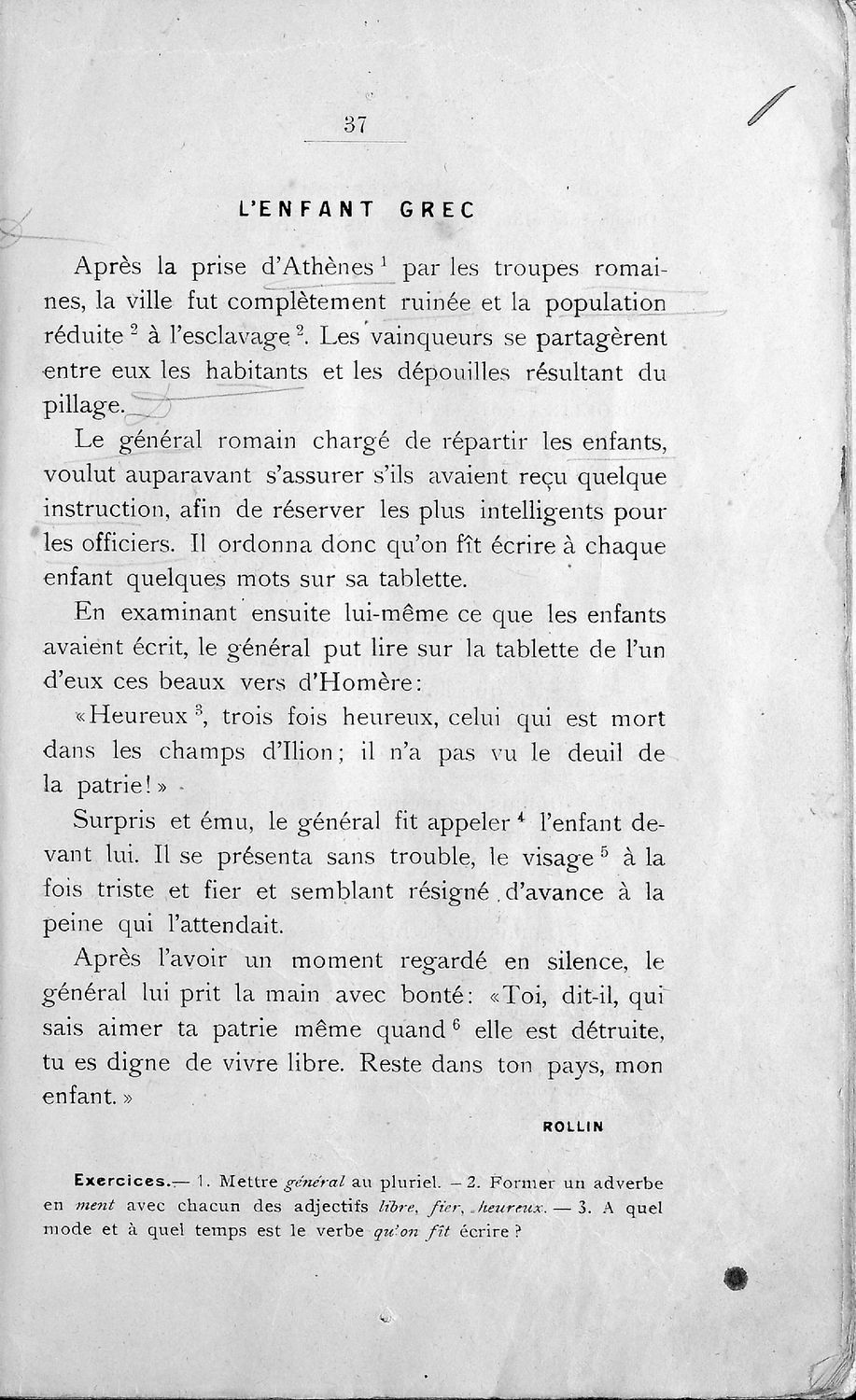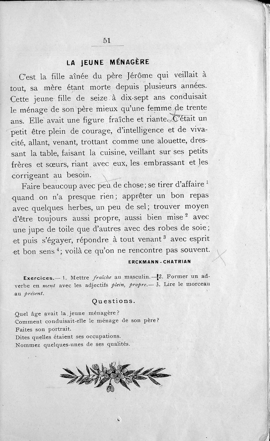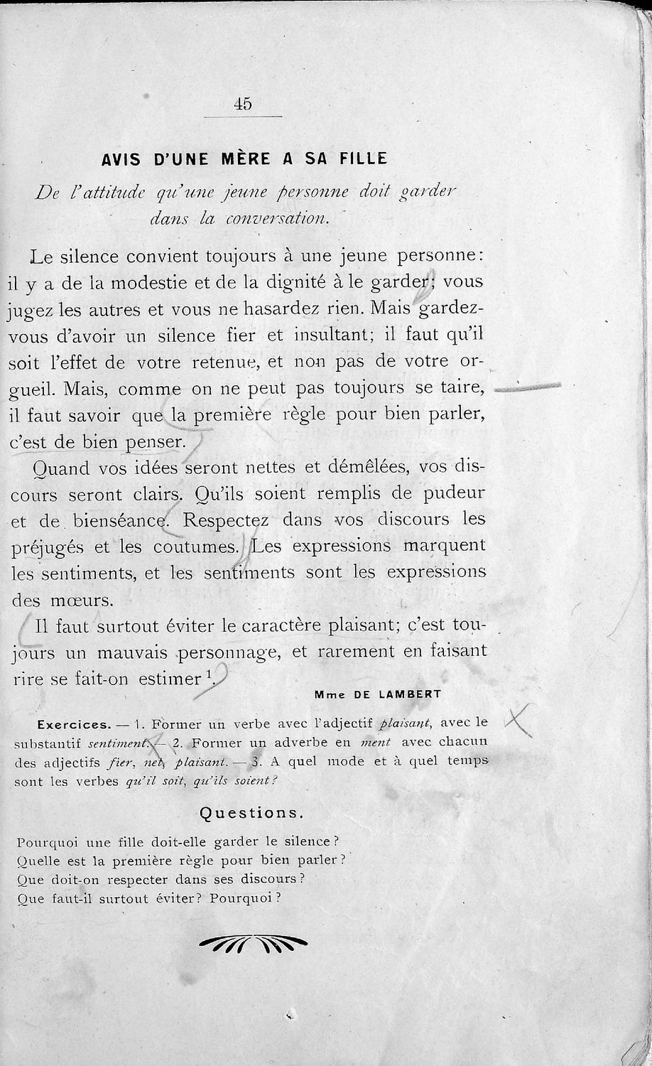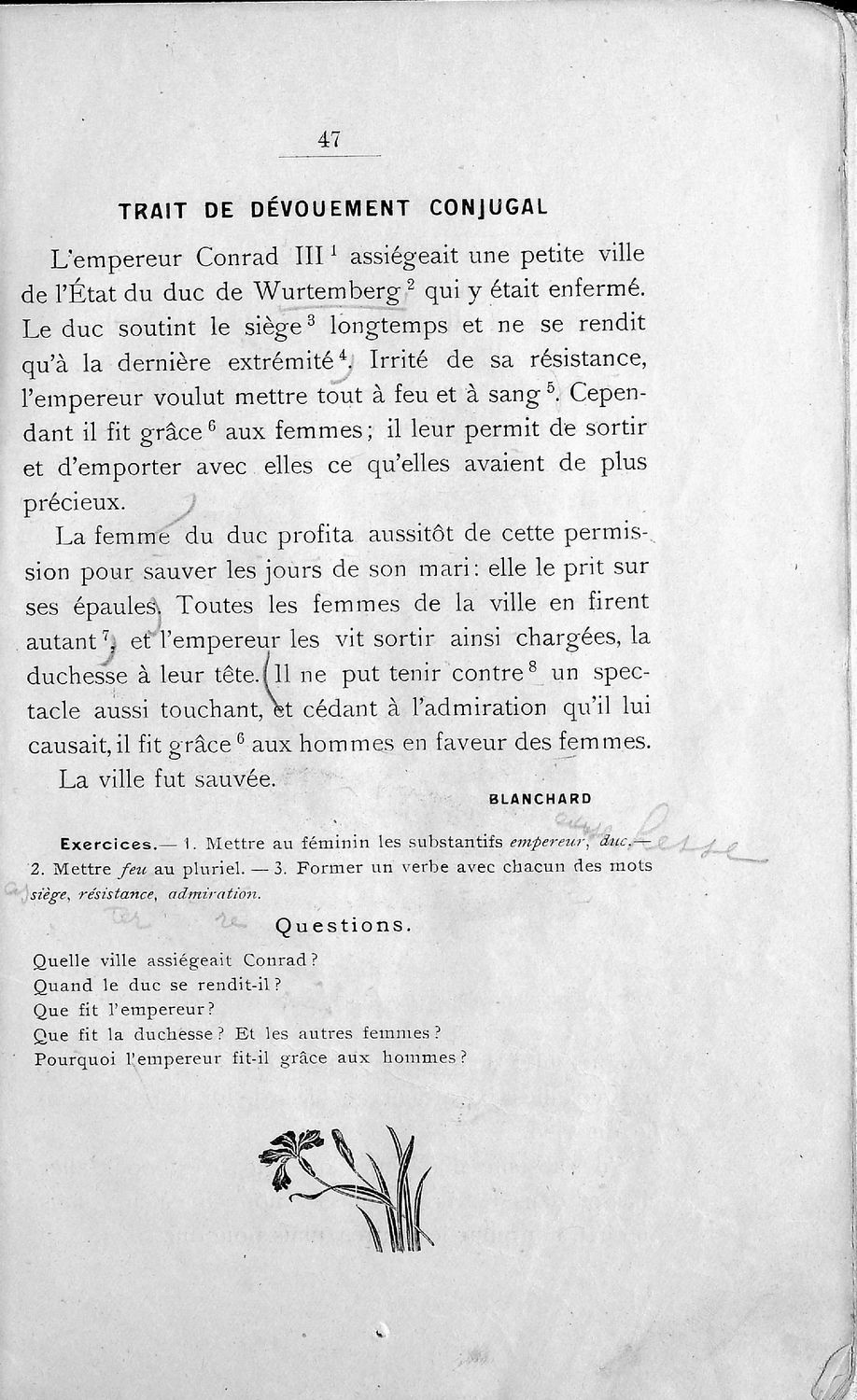 Σχολικό εγχειρίδιο Γαλλικών για τις Γ΄ Γυμνάσιου, Β΄ Διδασκαλείου Θηλέων και Α' Διδασκαλείου Αρρένων που περιέχει αποσπάσματα έργων Γάλλων συγγραφέων, και γλωσσικά και ερμηνευτικά σχόλια.