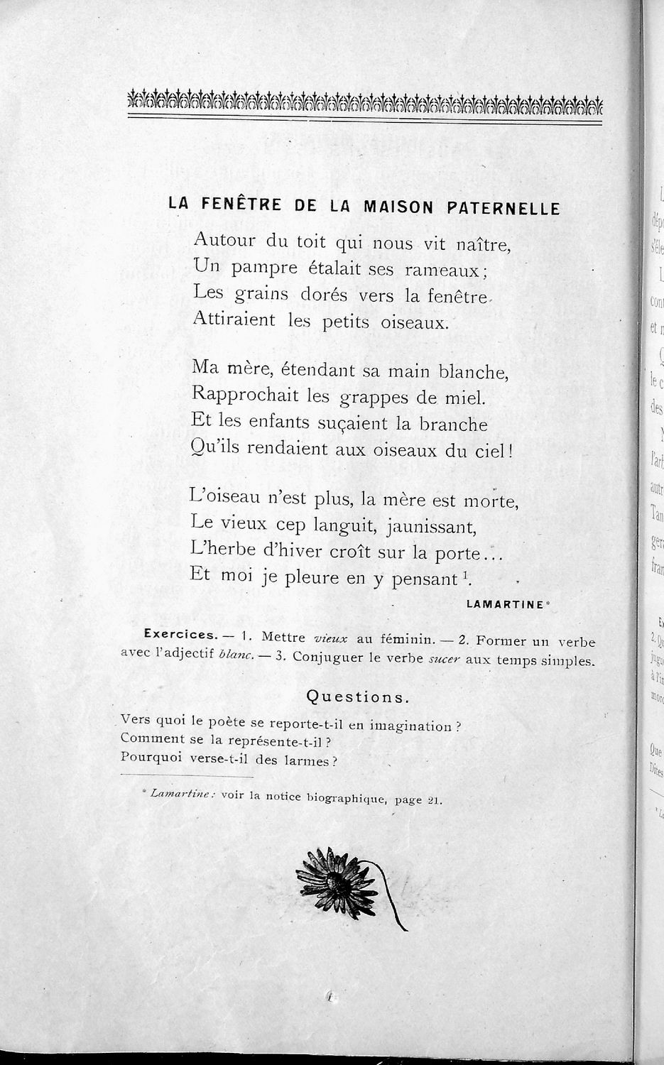 Σχολικό εγχειρίδιο Γαλλικής γλώσσας των τάξεων της Γ΄ Γυμνάσιου, Β΄ Διδασκαλείου Θηλέων και Α' Διδασκαλείου Αρρένων που περιέχει σειρά ποιημάτων και πεζών Γάλλων συγγραφέων, σύντομα βιογραφικά σημειώματα, ...