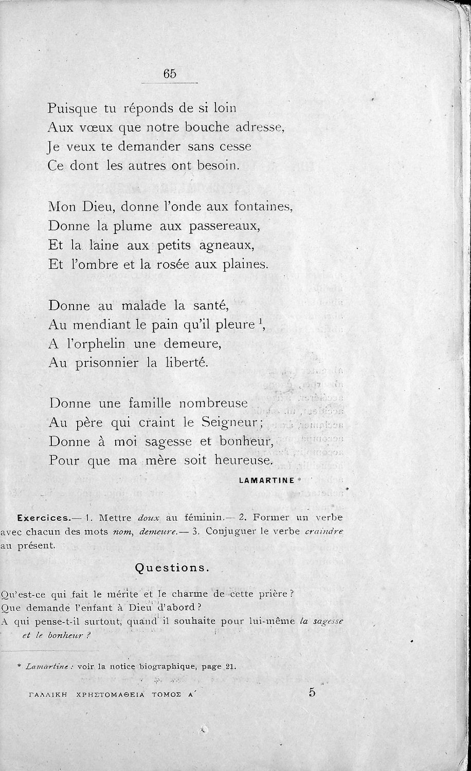 Σχολικό εγχειρίδιο Γαλλικής γλώσσας των τάξεων της Γ΄ Γυμνάσιου, Β΄ Διδασκαλείου Θηλέων και Α' Διδασκαλείου Αρρένων που περιέχει σειρά ποιημάτων και πεζών Γάλλων συγγραφέων, σύντομα βιογραφικά σημειώματα, ...