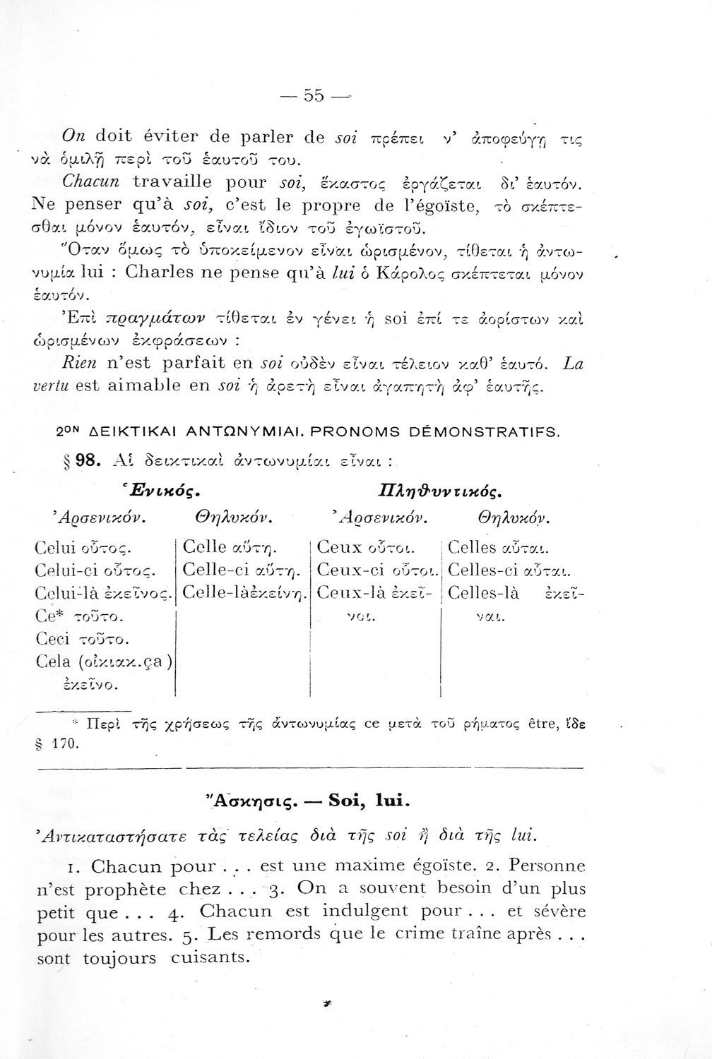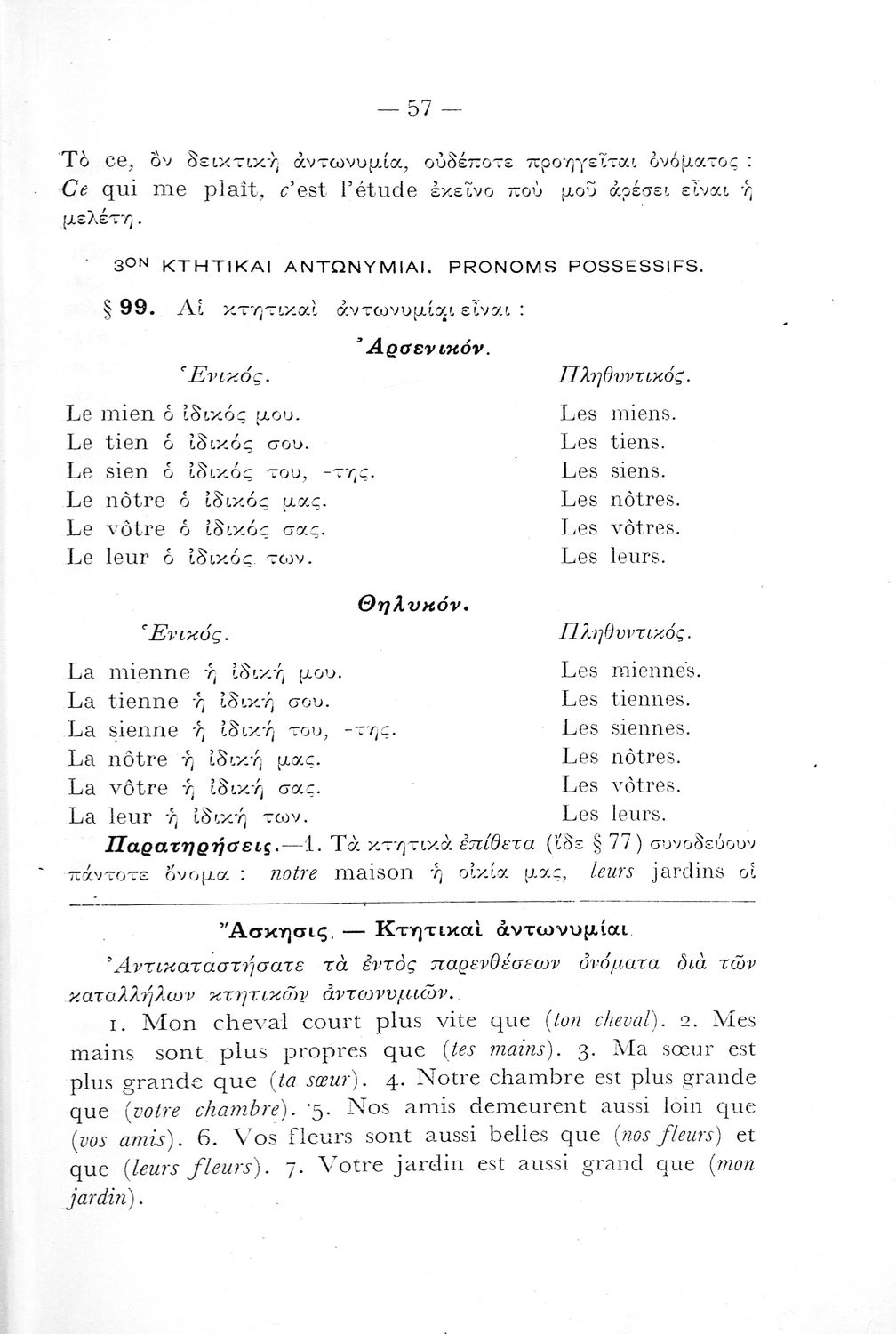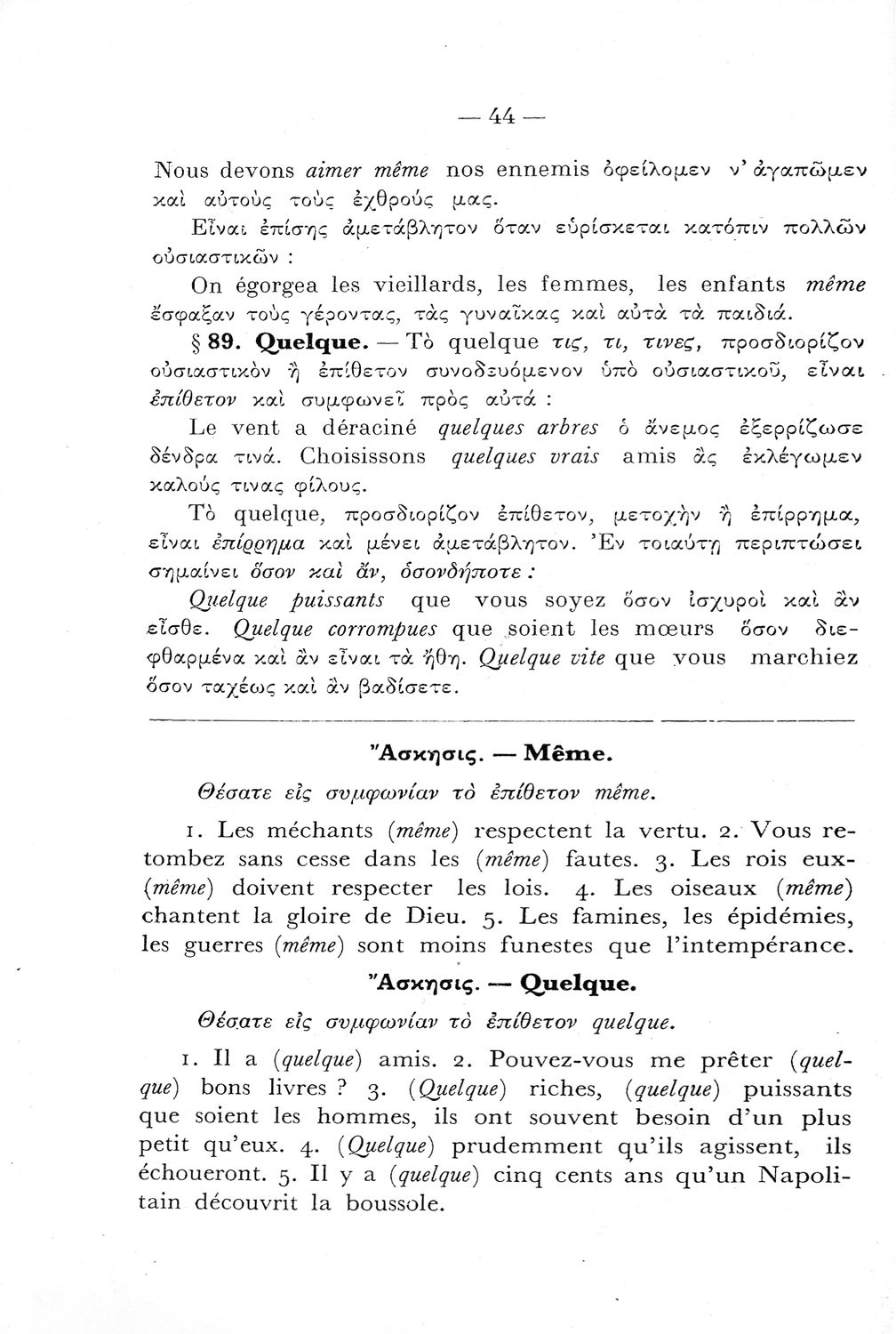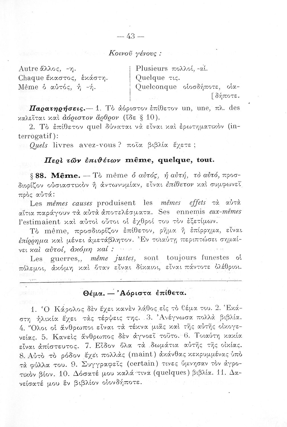 Βαθμίδα εκπαίδευσης: Δευτεροβάθμια Τάξη: Γυμνάσιο Μάθημα: Γαλλικά Γλώσσα: Καθαρεύουσα Παρουσίαση περιεχομένου: Σχολικό εγχειρίδιο Γαλλικών Γυμνασίου που περιέχει τους βασικούς κανόνες γραμματικής και συντακτικού, κείμενα για τη διδασκαλία τους, λεξιλόγιο και ασκήσεις. |