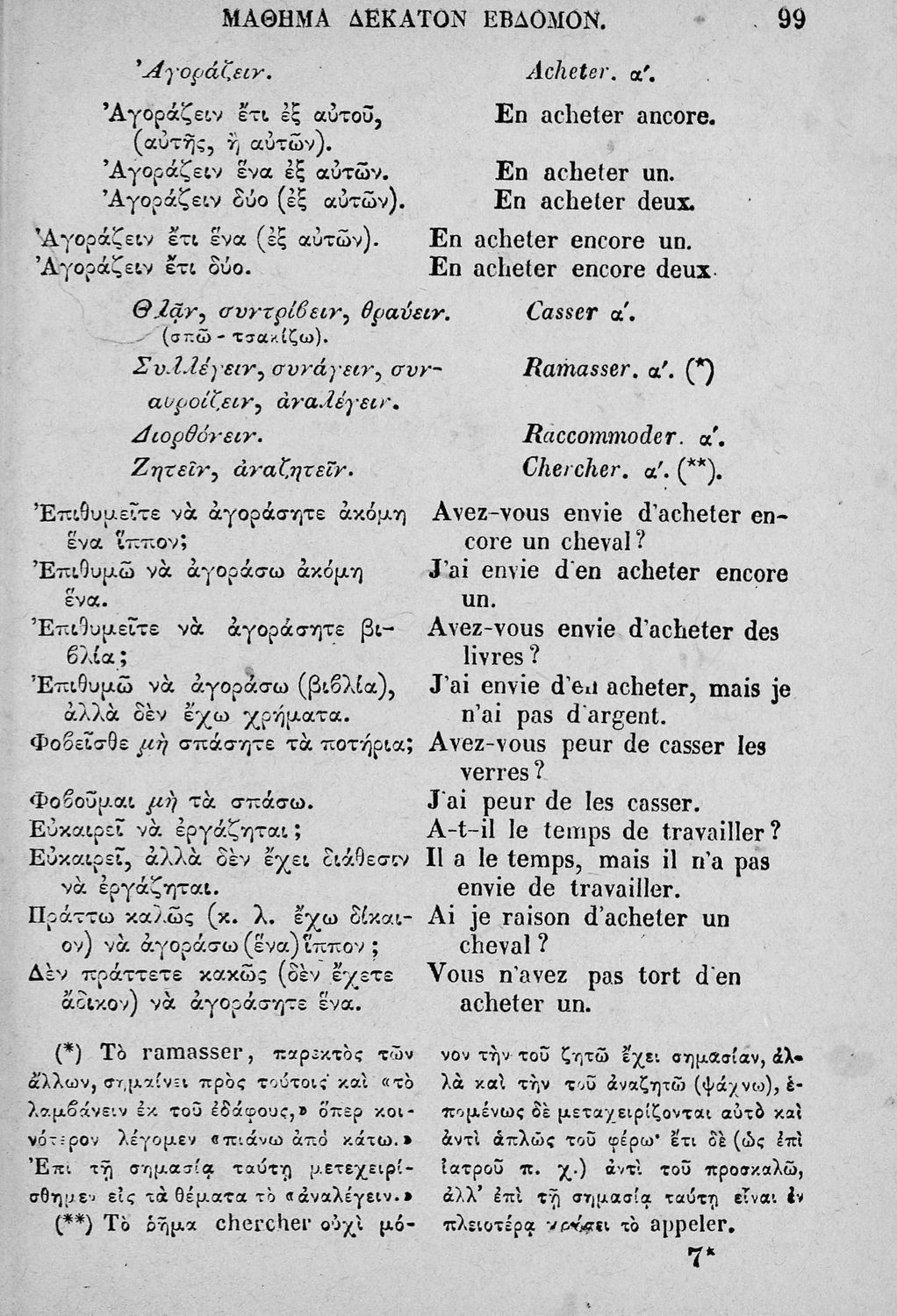 Σχολικό εγχειρίδιο Γαλλικών που περιλαμβάνει κείμενα, λεξιλόγιο και ασκήσεις. Ο συγγραφέας ήταν καθηγητής της Δημόσιας Εμπορικής Σχολής Αθηνών και του Αρσακείου.