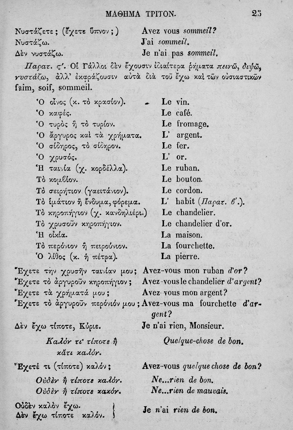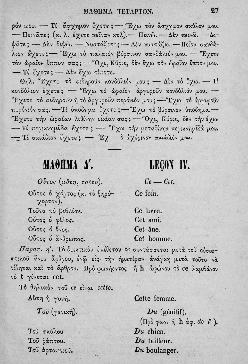 Σχολικό εγχειρίδιο Γαλλικών που περιλαμβάνει κείμενα, λεξιλόγιο και ασκήσεις. Ο συγγραφέας ήταν καθηγητής της Δημόσιας Εμπορικής Σχολής Αθηνών και του Αρσακείου.